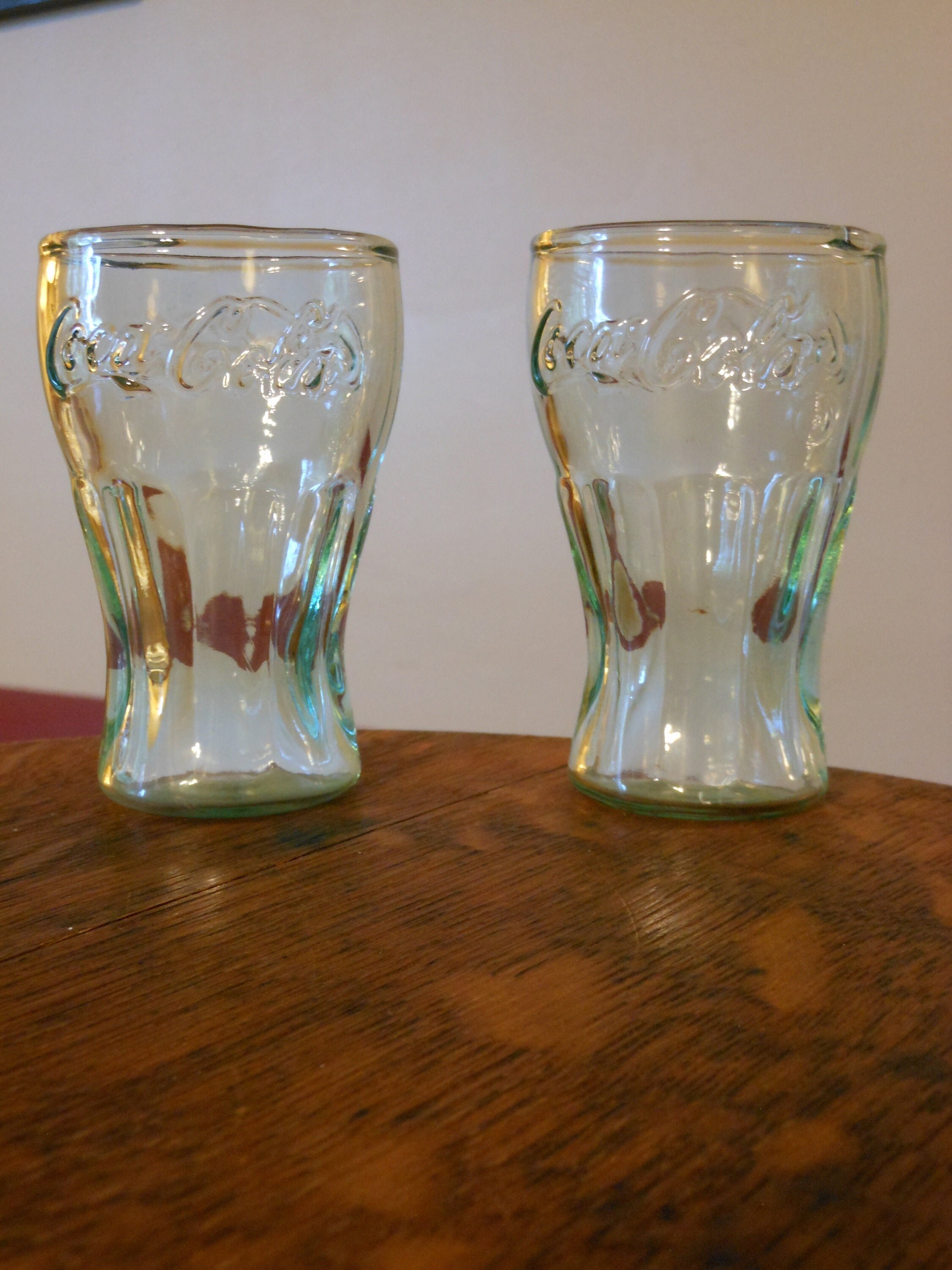 Two small 4-ounce Coca-Cola miniature glasses. No chips or cracks. The words Coca-Cola appear on both sides. These stand about 3 inches high. Combined weight is about 5 ounces.