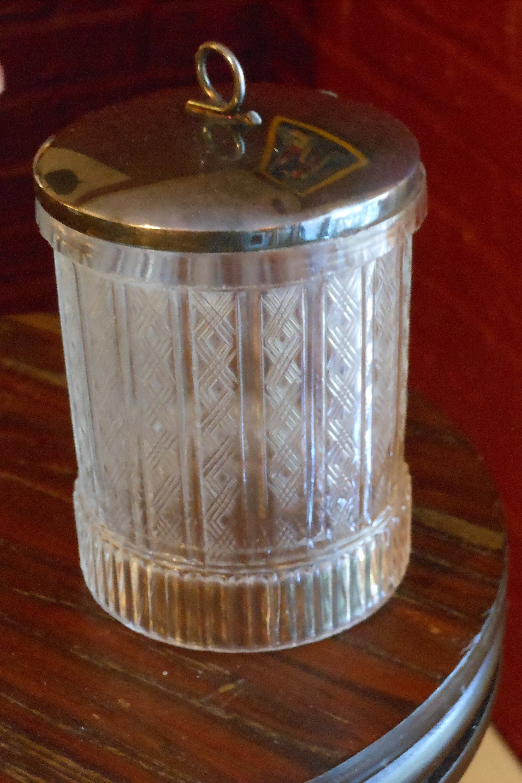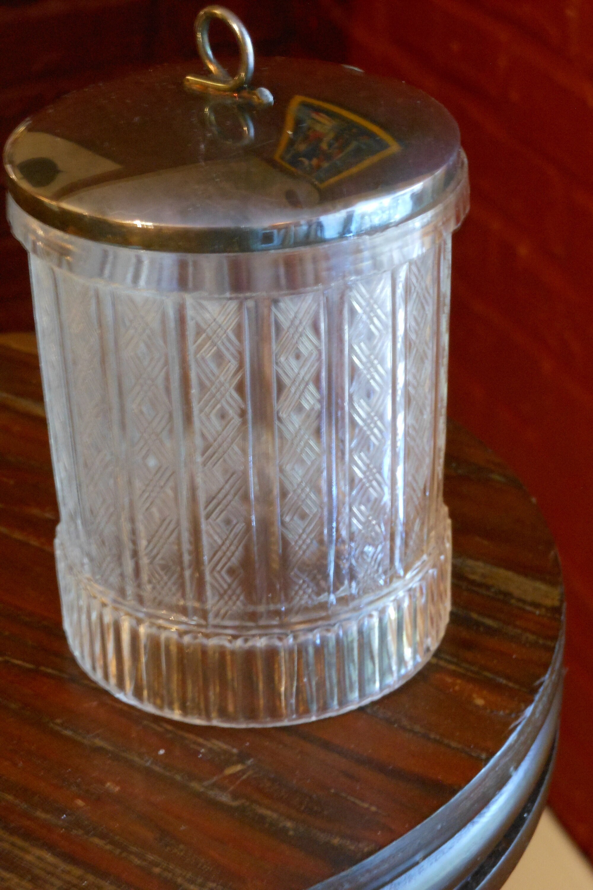 Vintage glass sugar container with metal lid, gap for a small spoon. No spoon included. Heavily-etched glass. Under the lid of the jar are two small chips but these do not show when the lid is on and the minor damage makes no difference to the use of the jar. With lid, stands about 5 inches, measures 3 inches across the bottom. Weight of this item is 13 ounces.