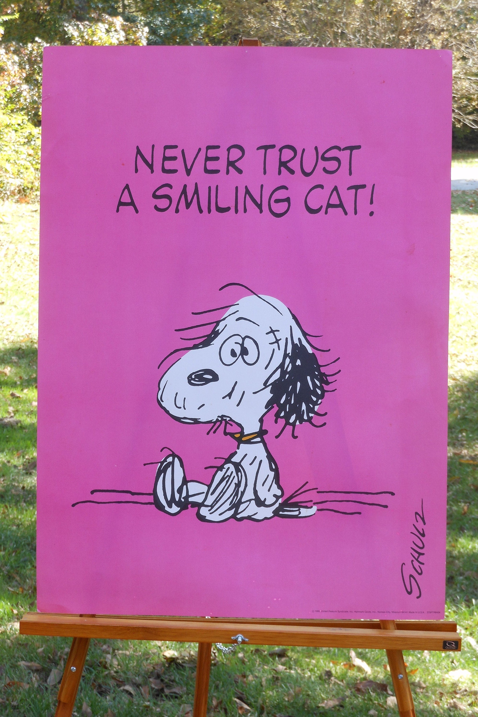 This is a Hallmark Cards, Inc. Charles Schulz Snoopy Poster from the 1970s era. No tears or rips, a little time-worn, three little thumbtack holes at the very top. Measures 28 inches tall and 20 inches wide. Copyright is King Features Syndicate, 1958 but era is likely early to mid-1970s. This is an unframed poster, will be packed in a mailing tube. Colors are purple, black and white.