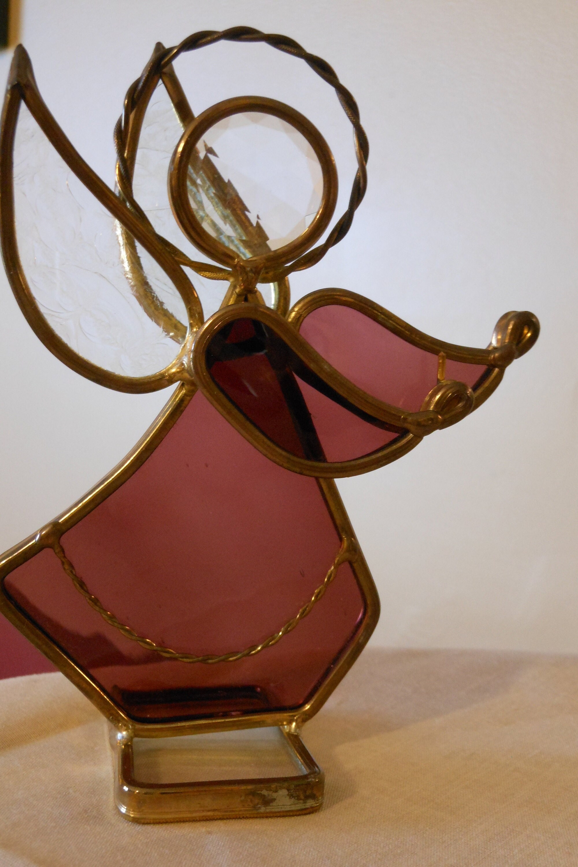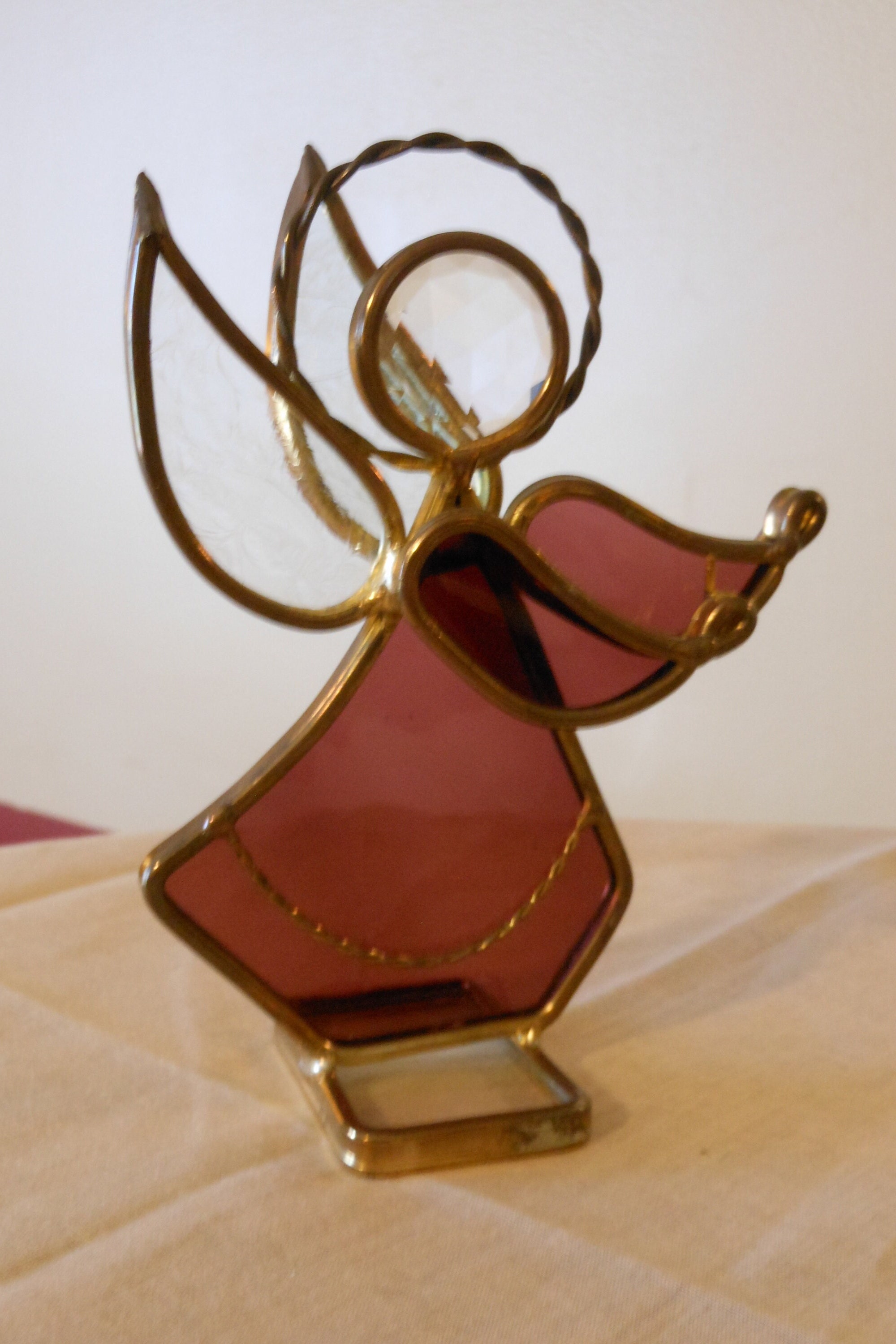 Nice metalcraft suncatcher, red and clear glass with gold accents. Stands 5 inches tall and measures 4 inches wide. Great gift for Christmas, Easter, Baptism, Communion, etc. This piece weighs 5 ounces.