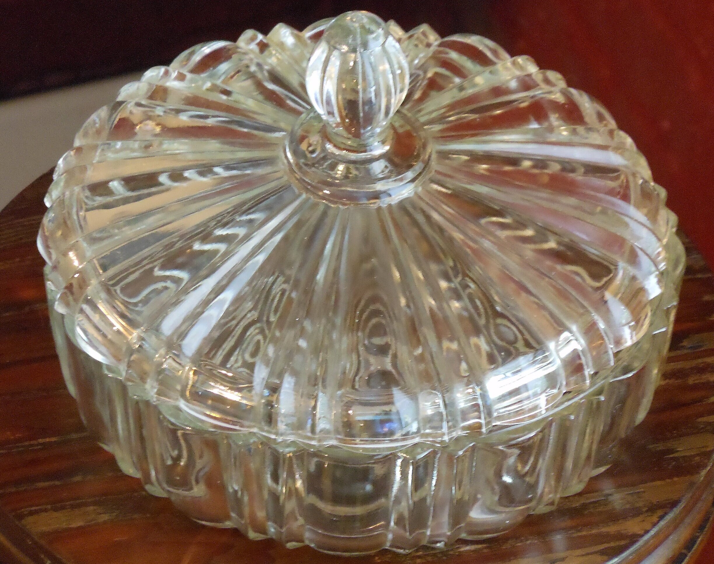 Large clear glass candy dish measures 7 inches around the rim. Including the lid, measures 5.5 inches tall. Knob handle, spider web design on inside bottom. Very good to excellent condition. Modern, stylish. Would not machine wash or microwave. This glass bowl weighs 2 pounds, 4 ounces.