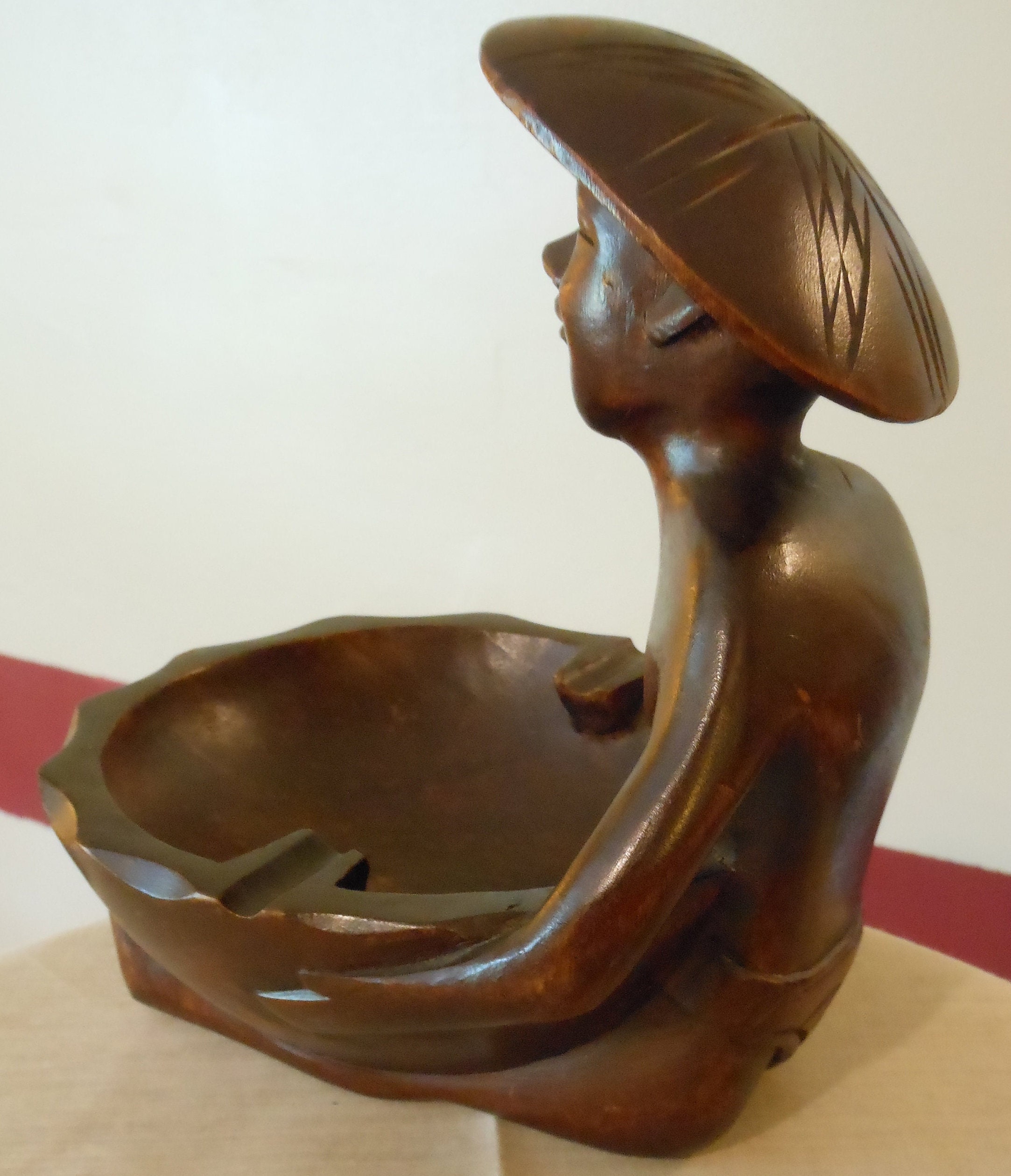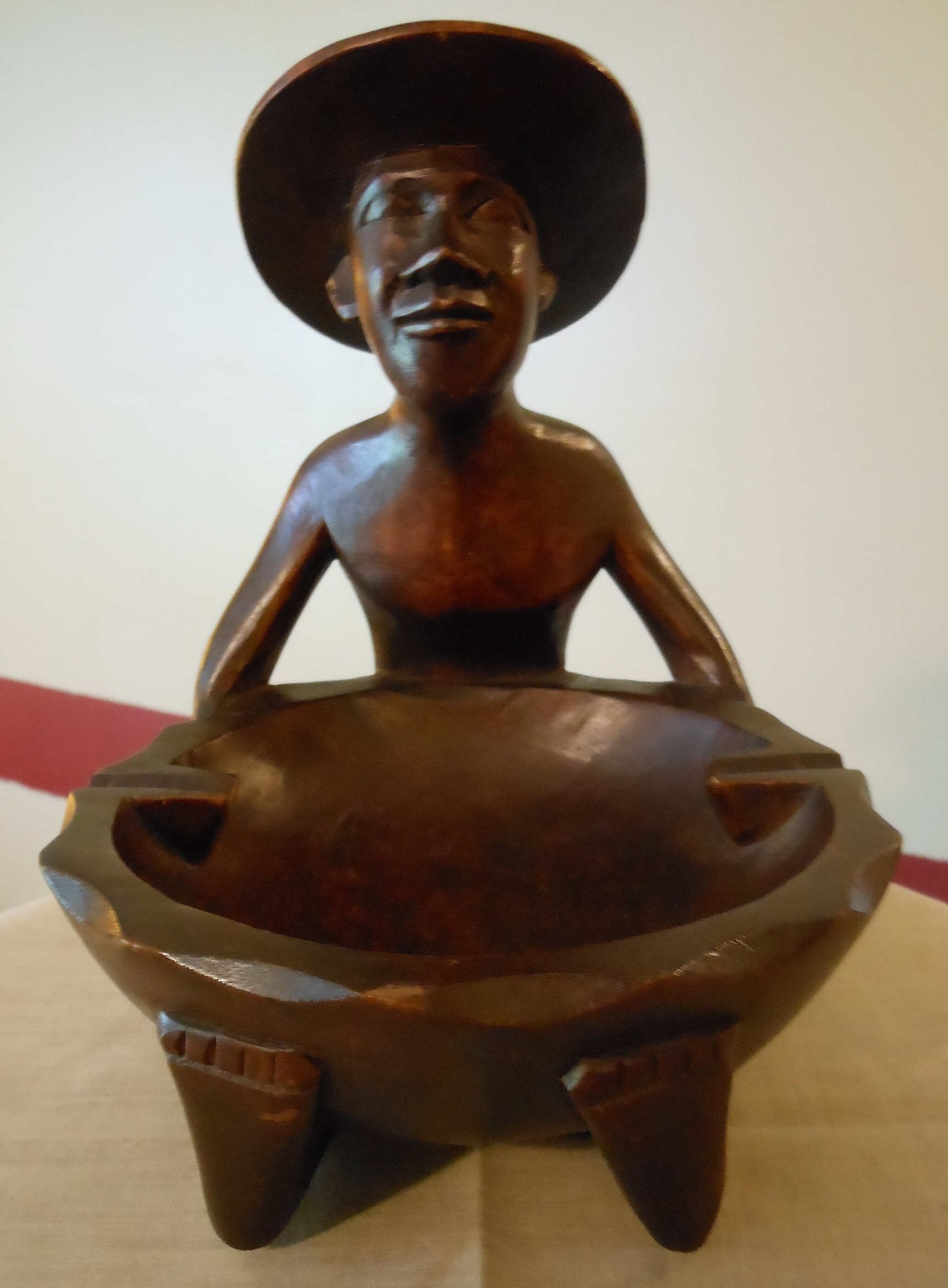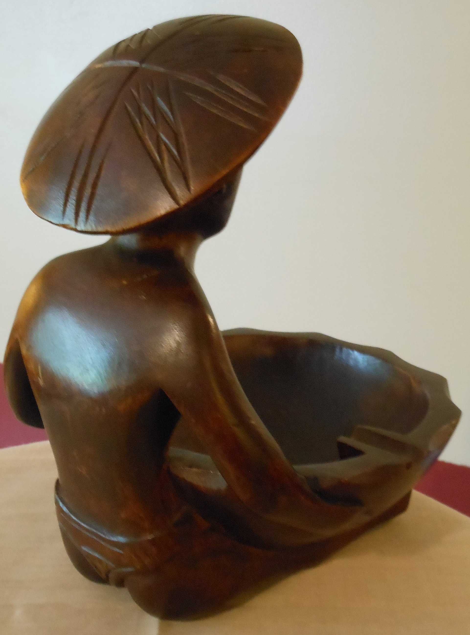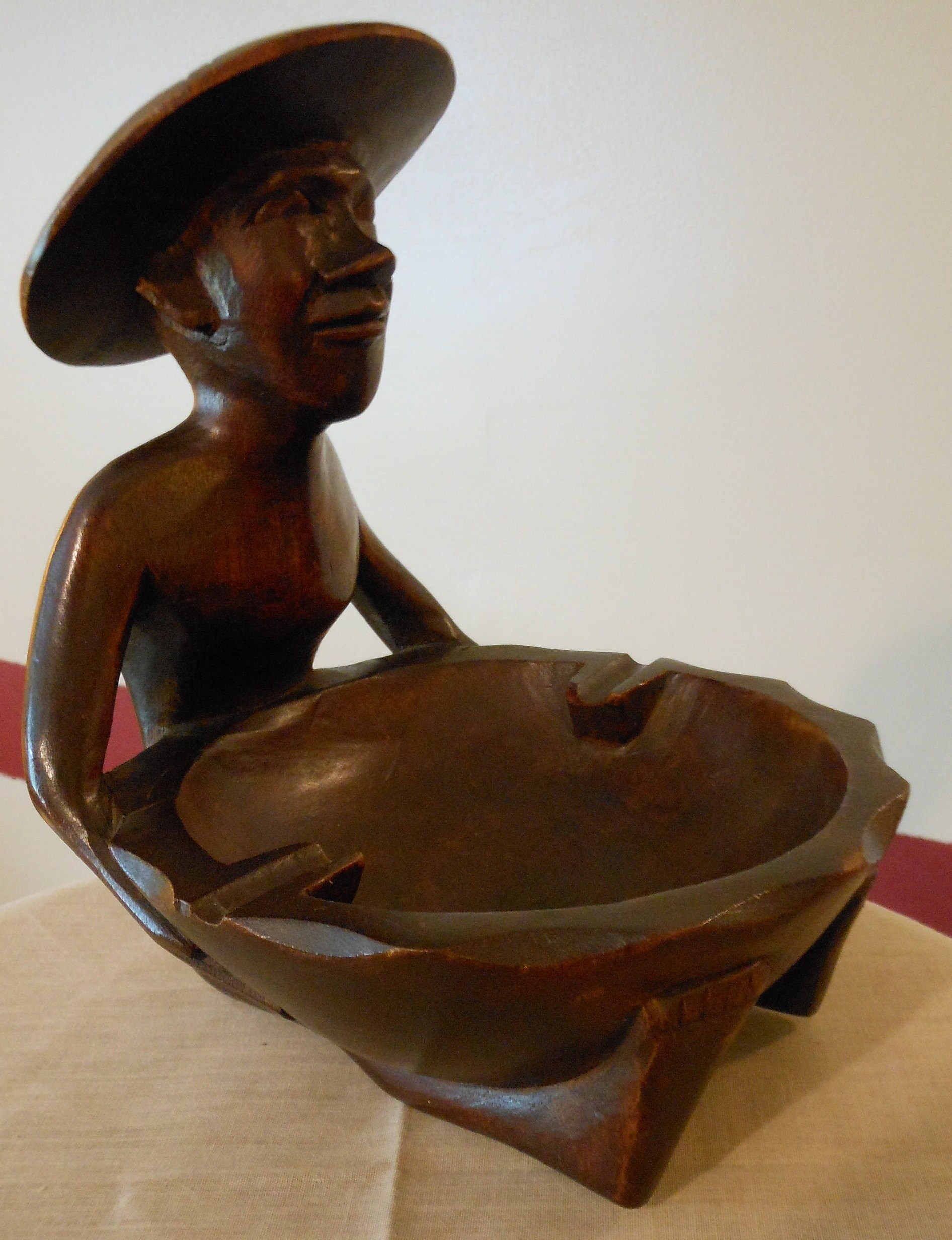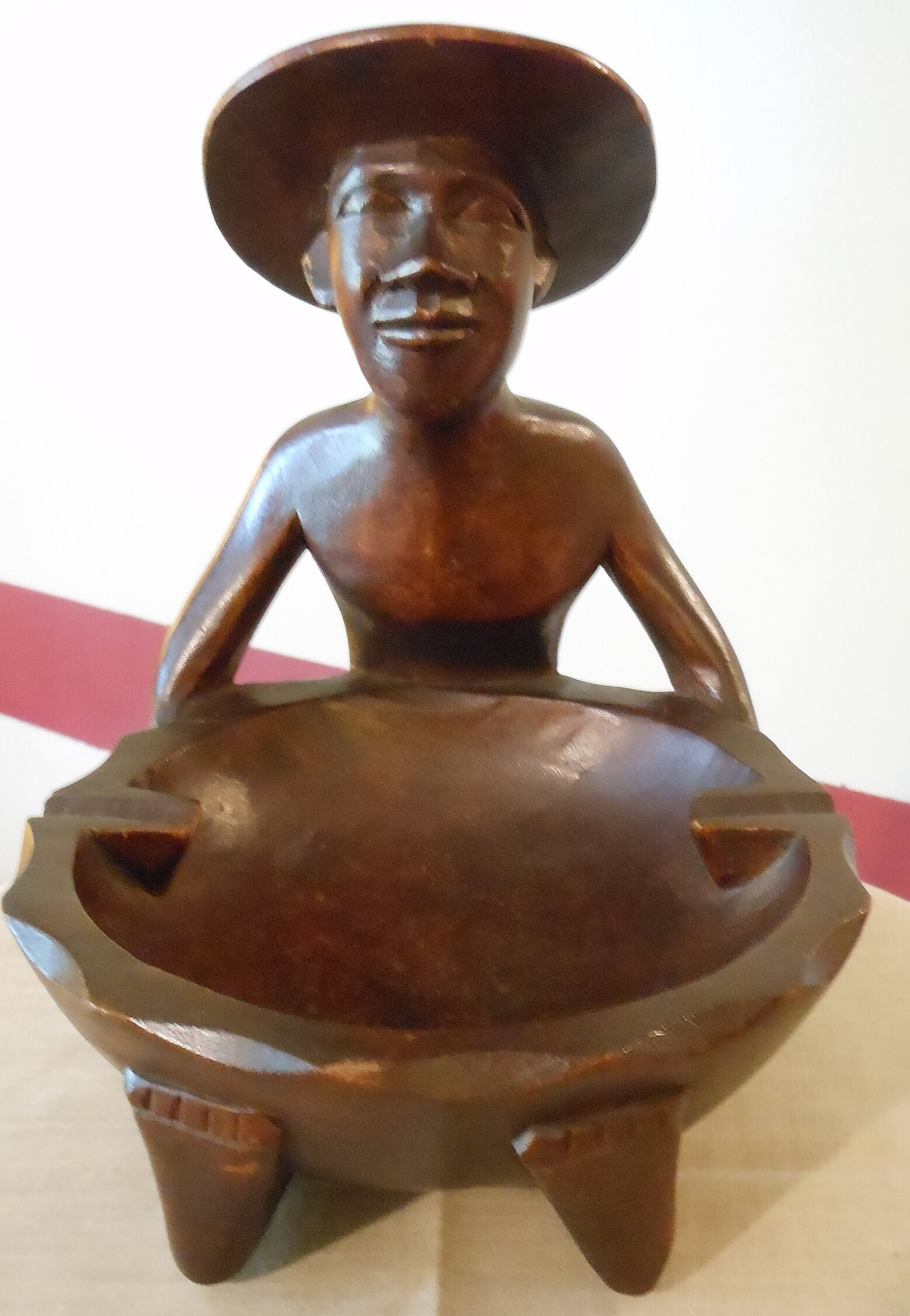 Made in Hawaii. Mike's monkeypod. Wood carving great for man cave or tiki bar. Could be a bowl for macadamia nuts, candy, jewelry. Stands 8 inches high, 5.5 inches across and 5 inches deep. A little wear in places but overall in very good to excellent condition. Weighs 11 ounces.