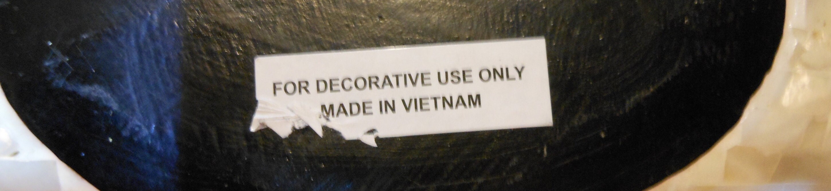 This is a 22-inch long elliptical resin or hard plastic faux shell bowl made in Vietnam. The width is 10 inches and the depth is 5 inches. Condition is very good to excellent vintage. Purpose is decorative, for display only, no contact with food. Would make an excellent base for displaying just about anything, including greenery, balls, shells, etc. The weight of this piece is 3 pounds, 15 ounces.