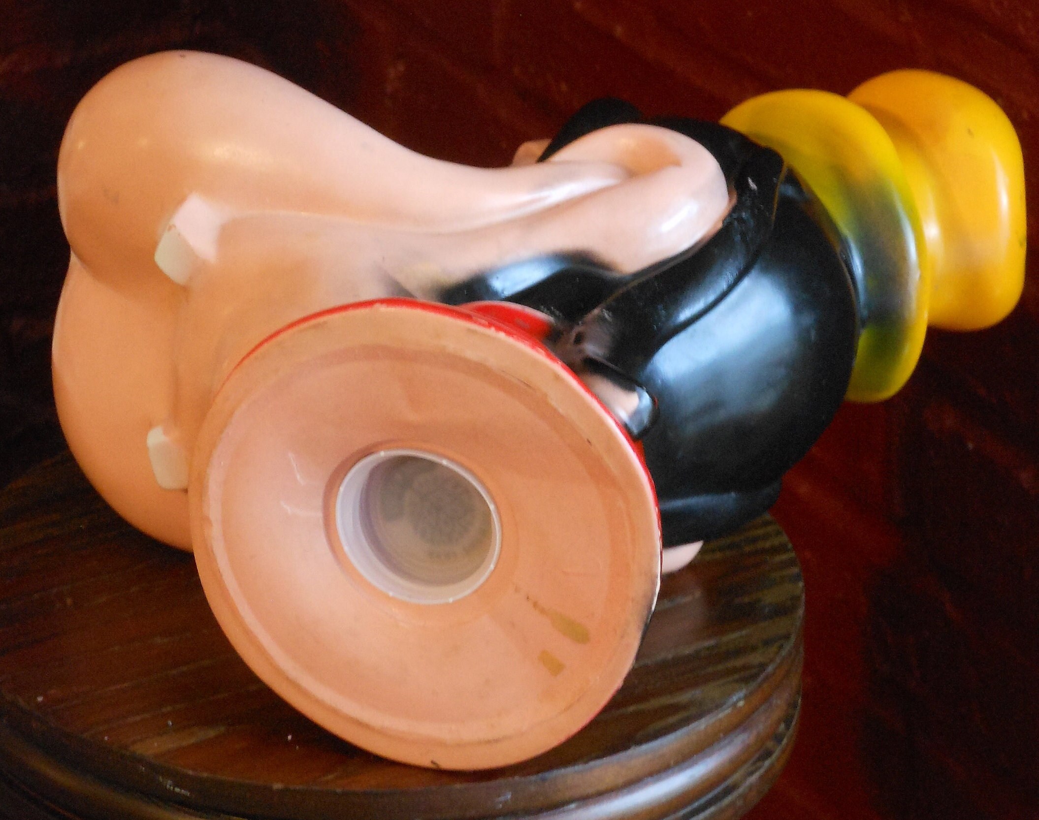 This is a hard plastic Walt Disney Productions Goofy bank. It was made in 1971. Goofy stands 11 inches tall, 8 inches wide and has a base of 4.5 inches across. While the bank has no holes or scratches, it does have paint loss on the hat. A plastic bottle cap has been placed at the bottom and it seems to work fine. This bank was made by Play Pal Plastics for Disney. Its weight empty is 1 pound, 3 ounces.