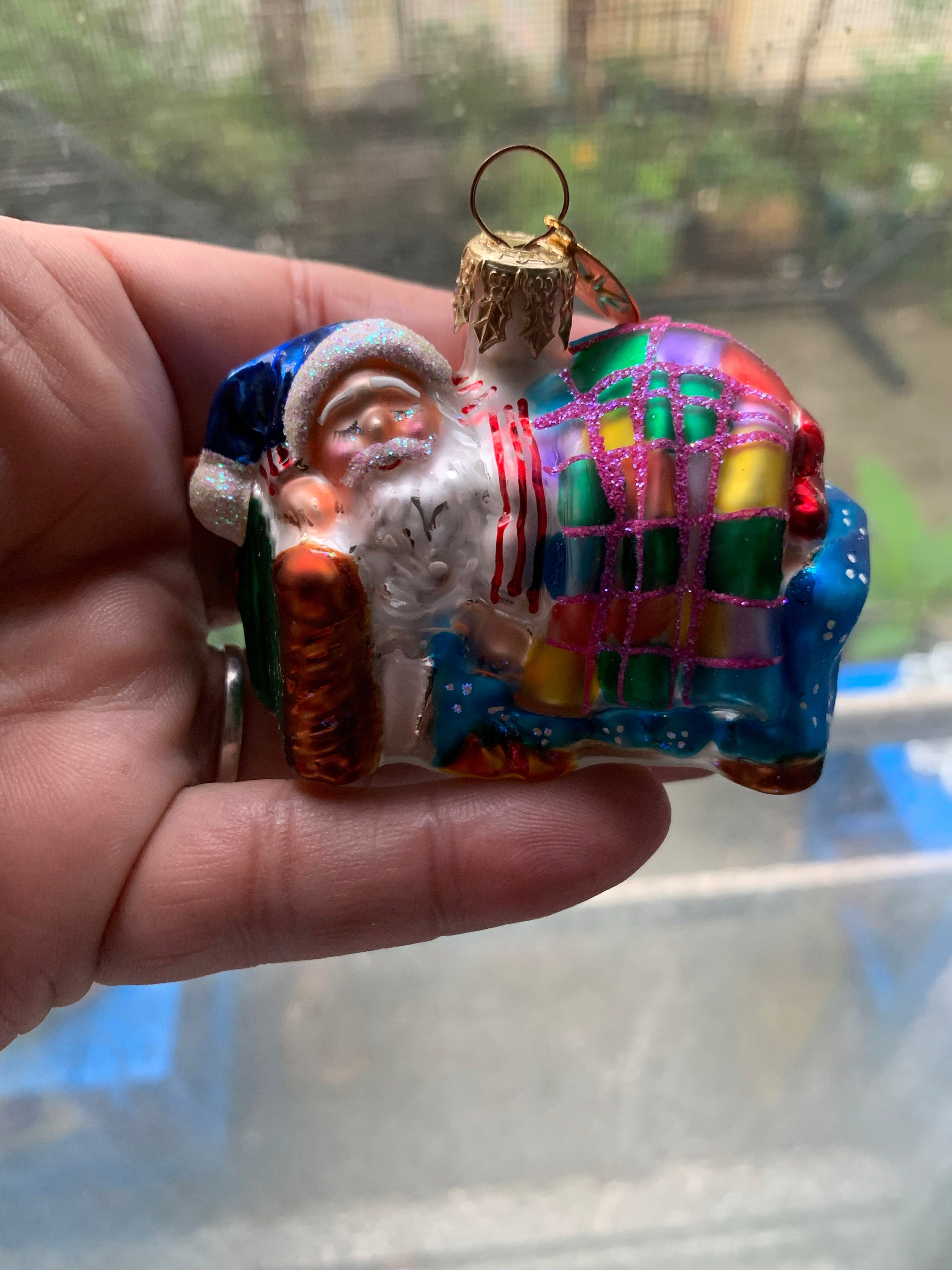 Christopher Radko miniature glass Christmas tree ornament. Santa snuggled in his cozy bed. Measures about 2.5 inches wide and about 2 inches tall. Comes in original box and has its own hanger. Both ornament and box are in excellent condition, like new. Box measures about 4.5 inches wide and about 3.5 inches tall. Total weight is 2 ounces.