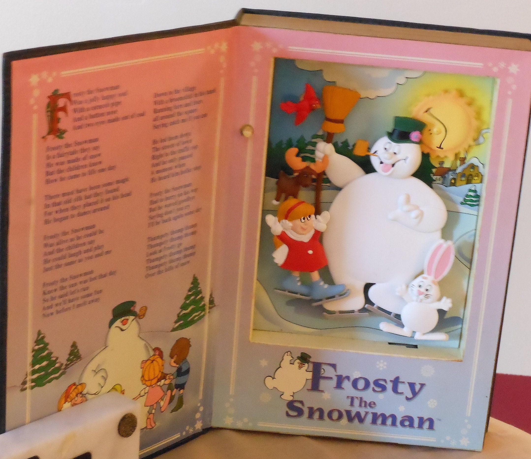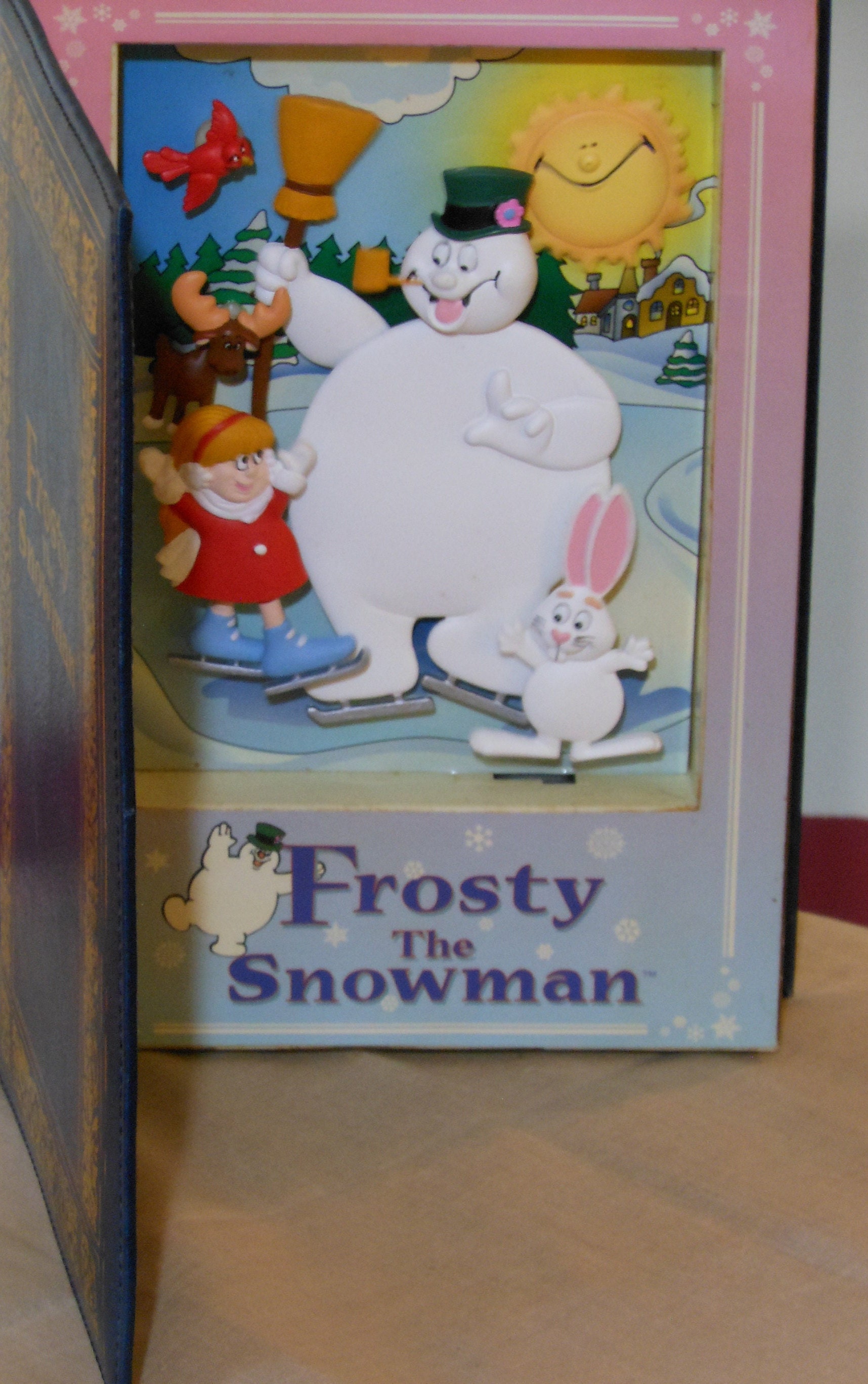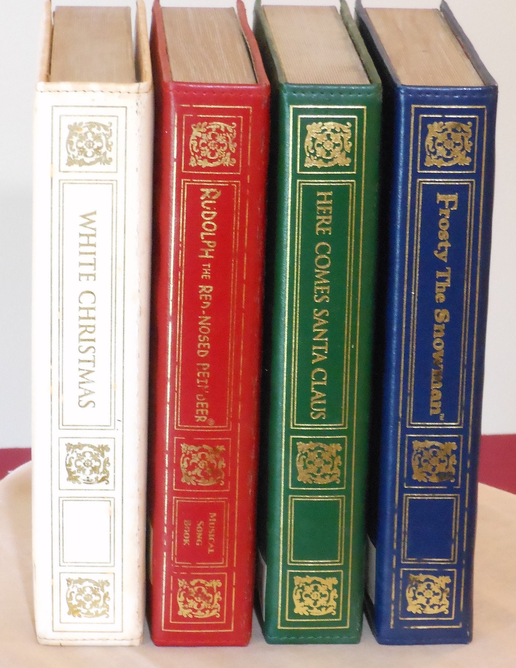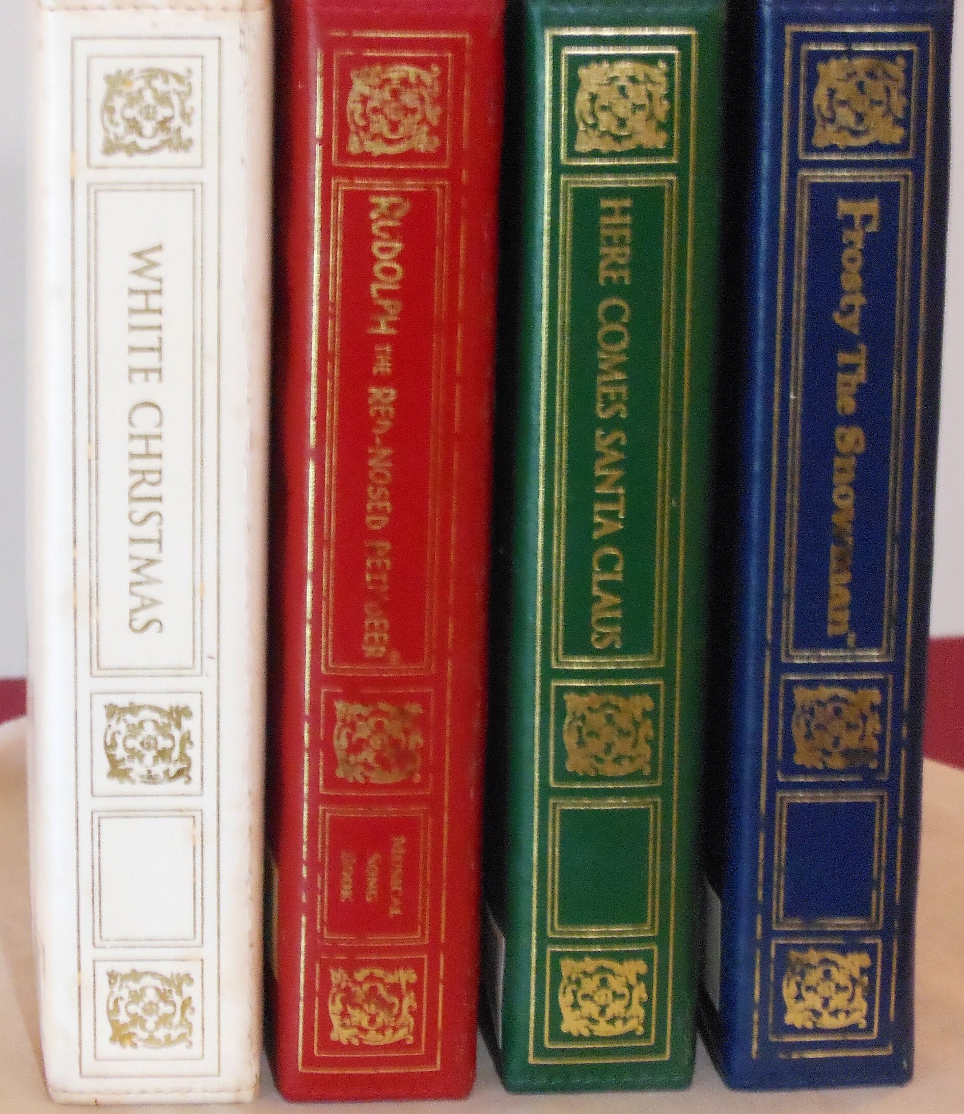 Four Christmas animated musical books made in 2001. Choose from Frosty the Snowman, Here Comes Santa Claus, Rudolph the Red-Nosed Reindeer or White Christmas. Individual figures move while music plays. These books weigh a combined 5 pounds, 10 ounces. Individual books weigh approximately 1 pound, 6 ounces. Books measure 9 x 6 x 1.5 inches. Each book comes with one C battery. These books are really cool and fun. The books work as designed.