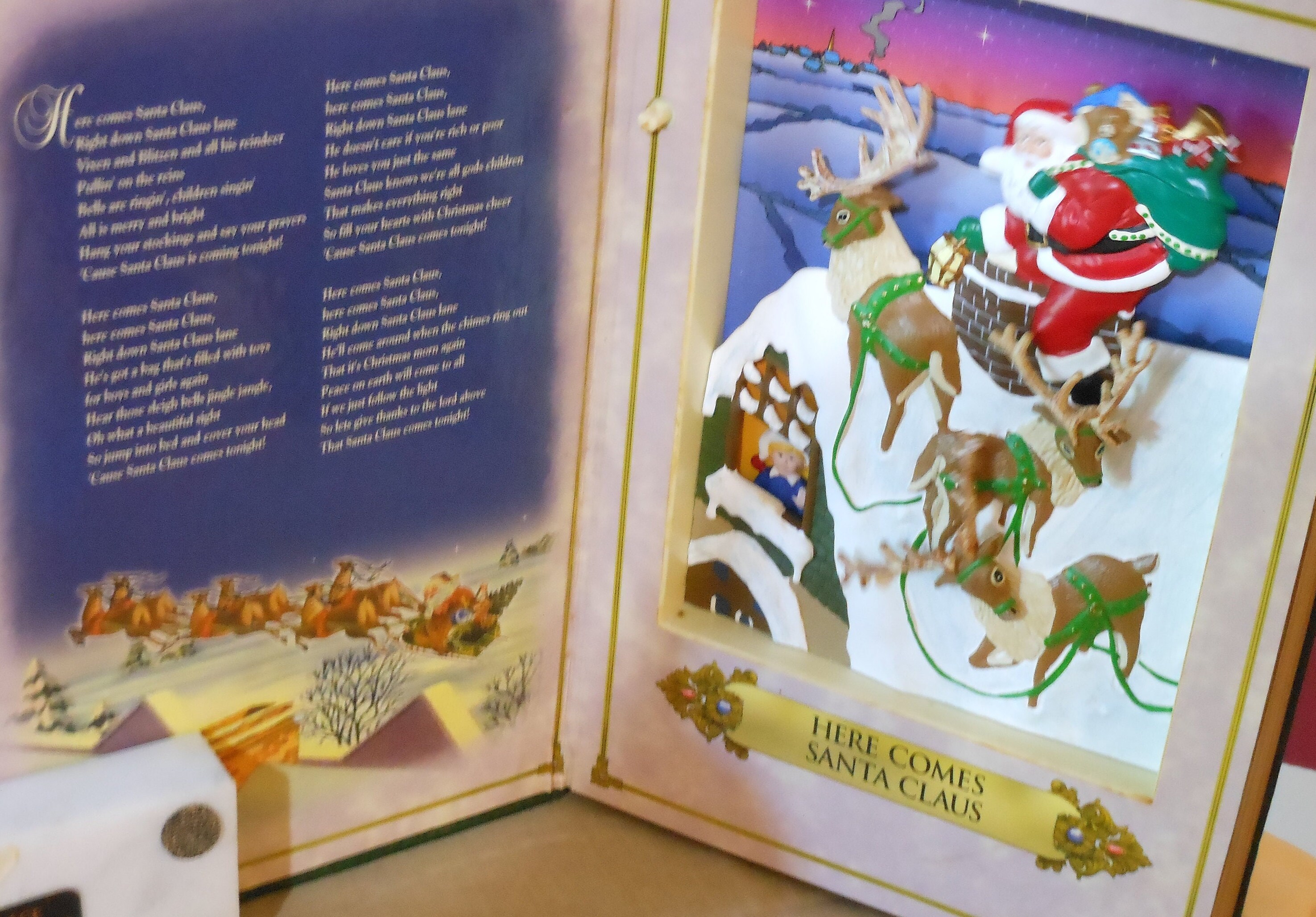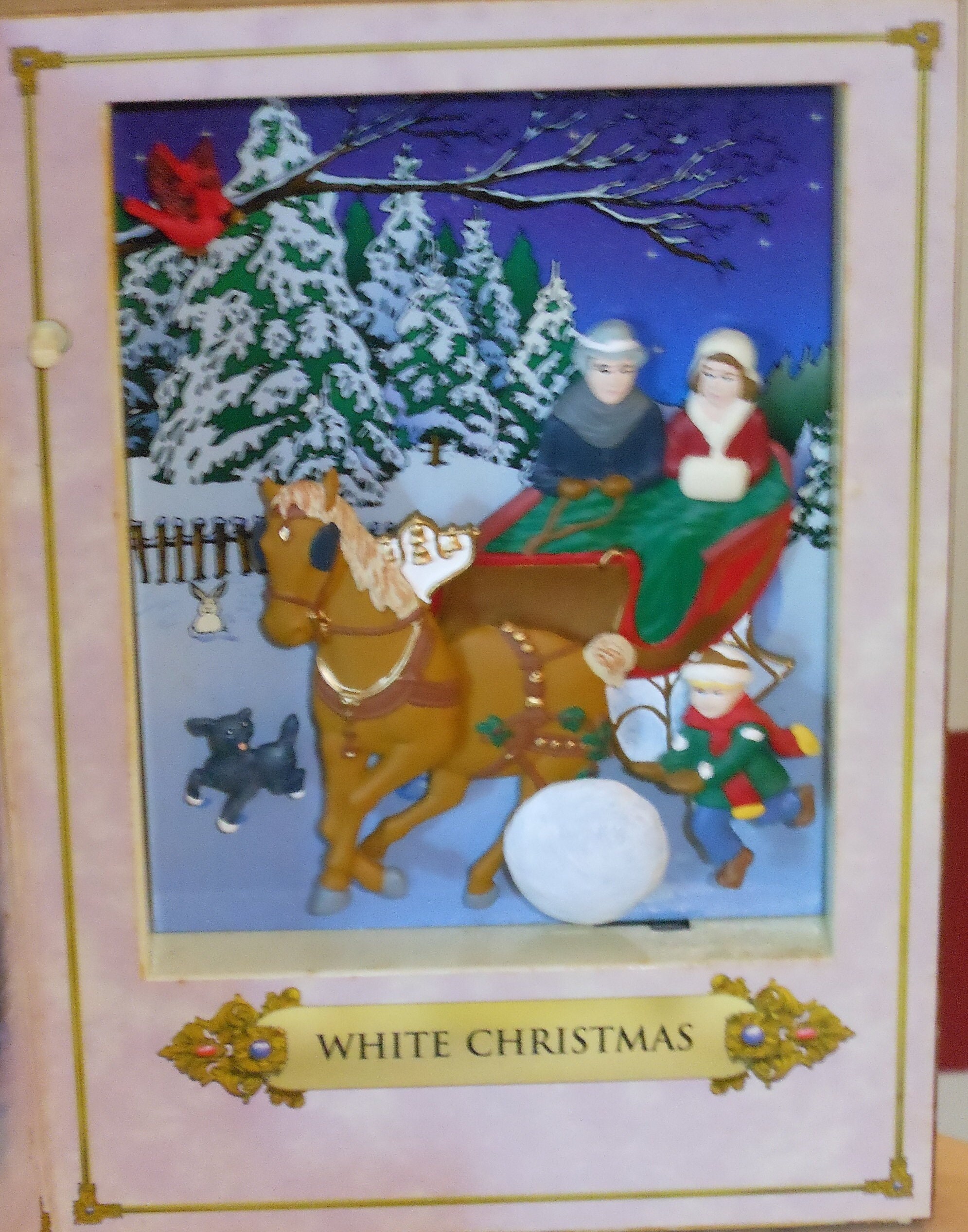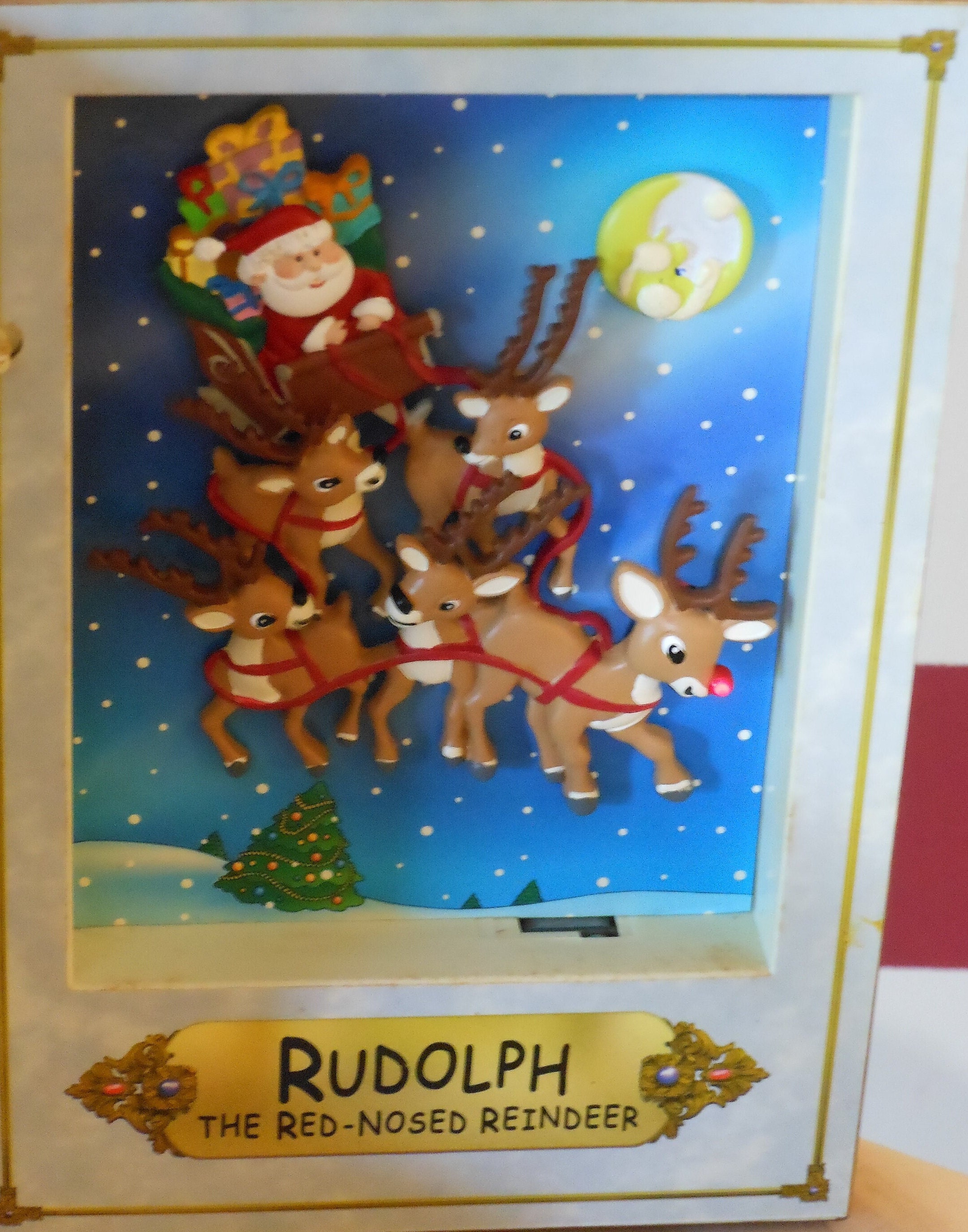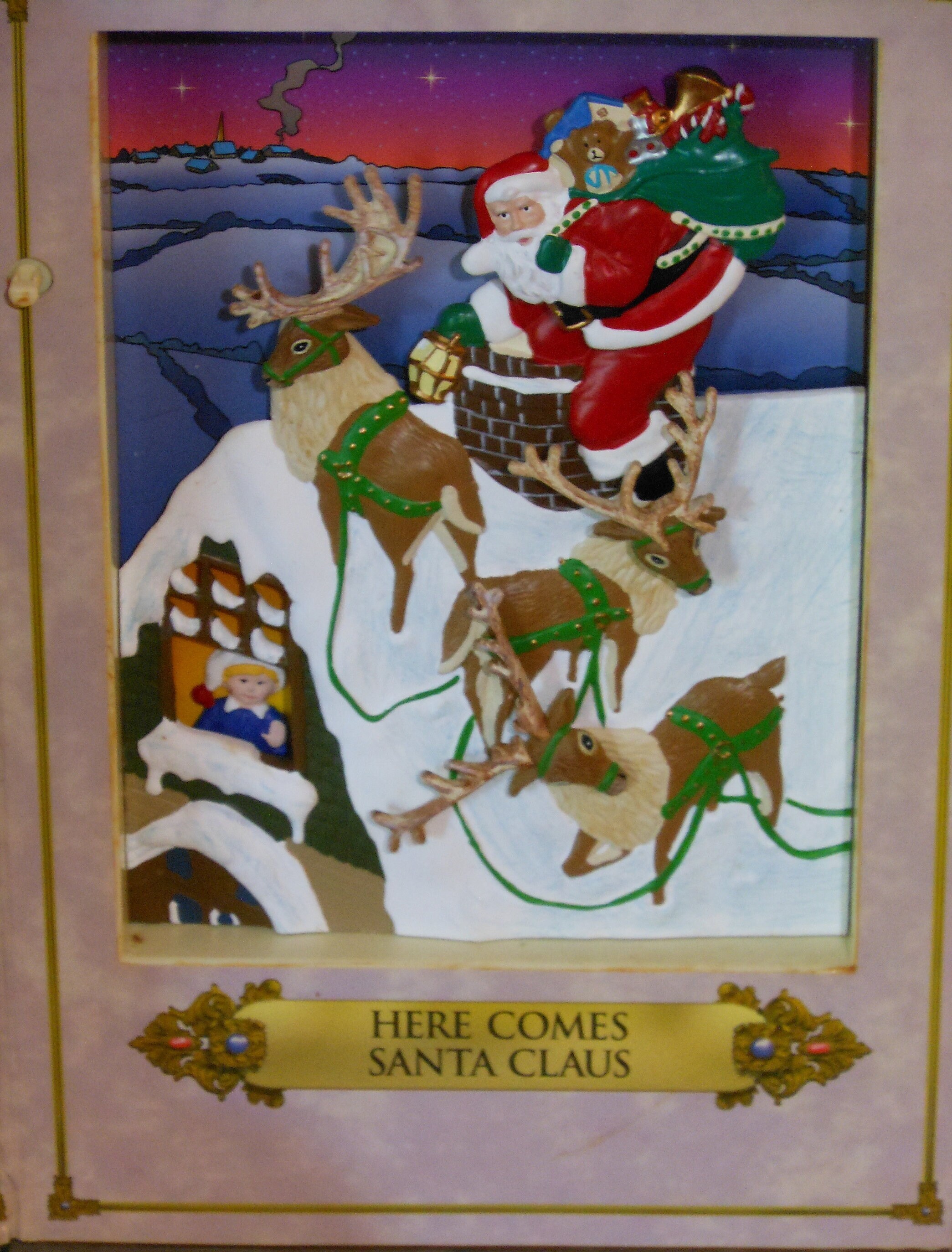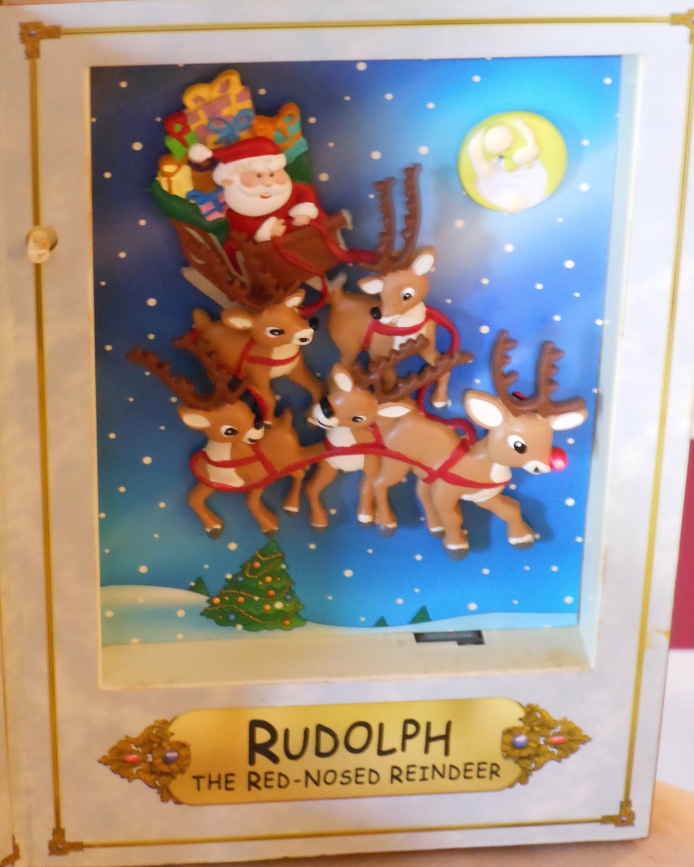Four Christmas animated musical books made in 2001. Choose from Frosty the Snowman, Here Comes Santa Claus, Rudolph the Red-Nosed Reindeer or White Christmas. Individual figures move while music plays. These books weigh a combined 5 pounds, 10 ounces. Individual books weigh approximately 1 pound, 6 ounces. Books measure 9 x 6 x 1.5 inches. Each book comes with one C battery. These books are really cool and fun. The books work as designed.