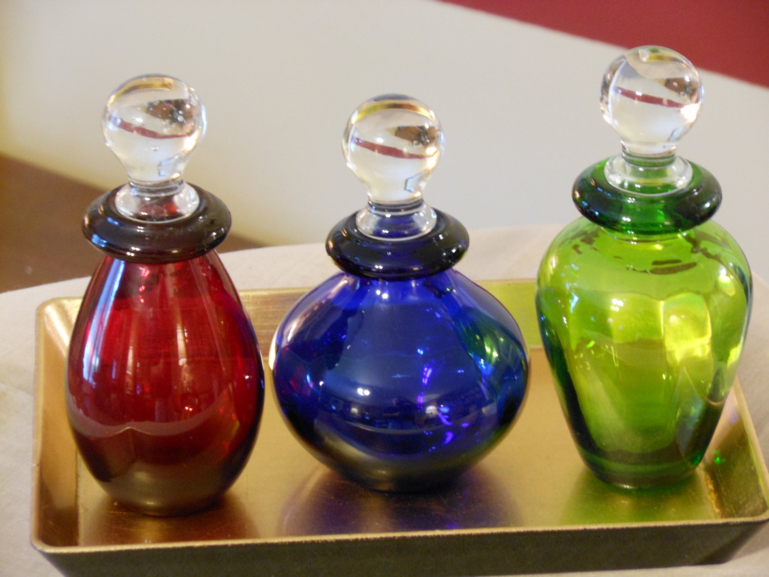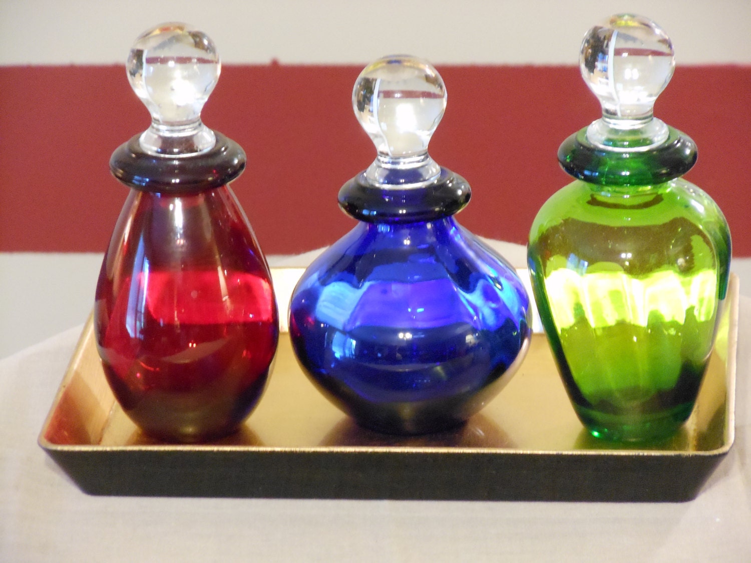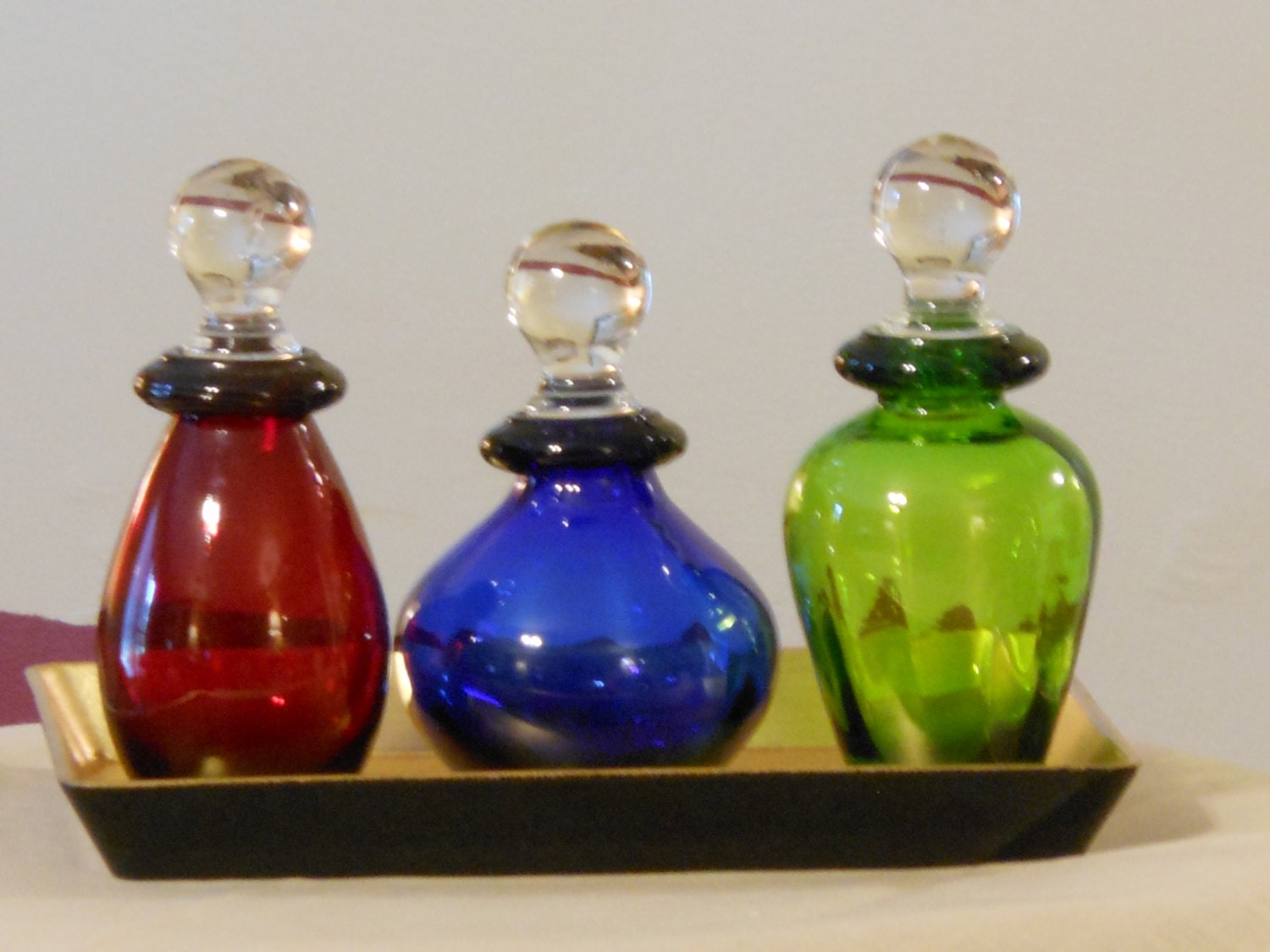 Blue, green and red glass vials with glass stoppers. Gold and black plastic tray. Green and red vials are six inches tall with stoppers, and the blue vial is five inches tall with stopper. Excellent condition. Heavy gold and black plastic tray is 8 inches long and 6 inches deep. The whole set weighs a combined 1 pound, five ounces.