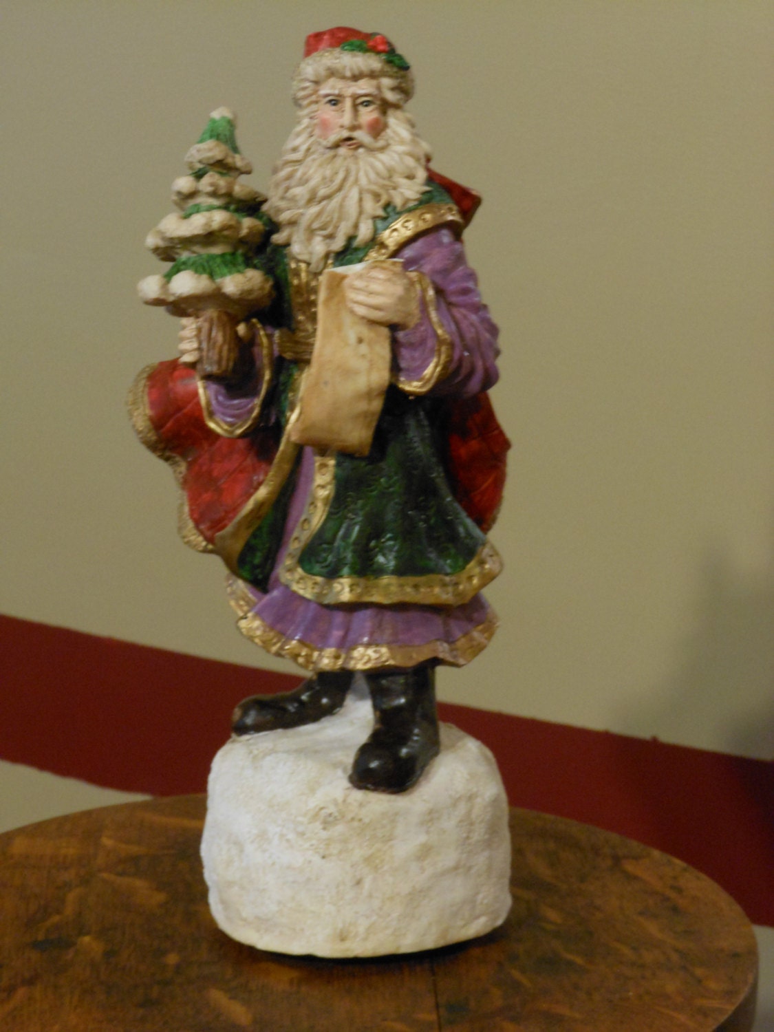 Plays "Santa Claus Is Coming to Town". Stands 12 inches high with a base of 4 inches around. Plays perfectly--does not spin. Condition issue: top of the list Santa is holding has been broken off. Realistic-looking Santa. Ceramic material or resin. This piece weighs 2 pounds.