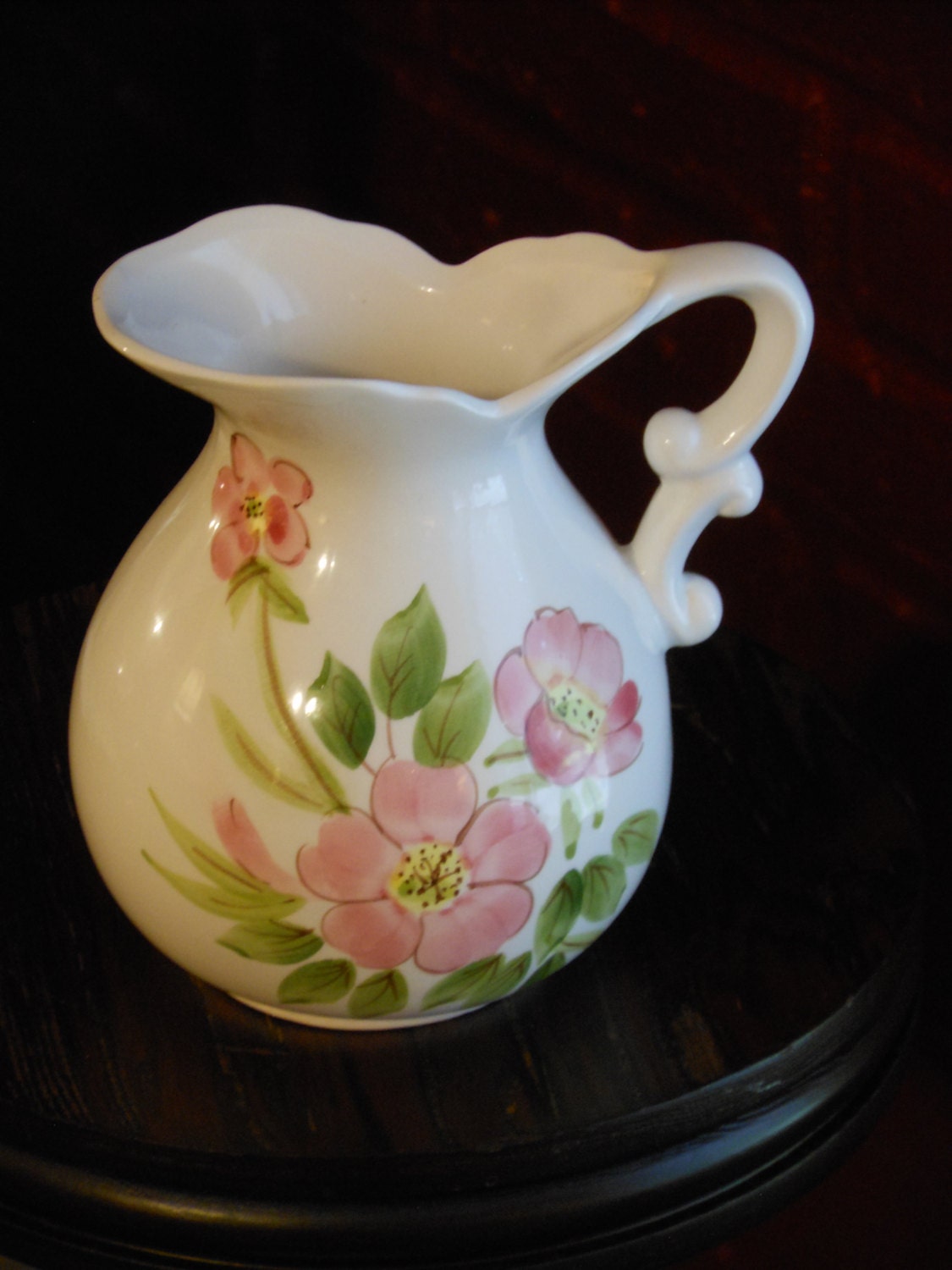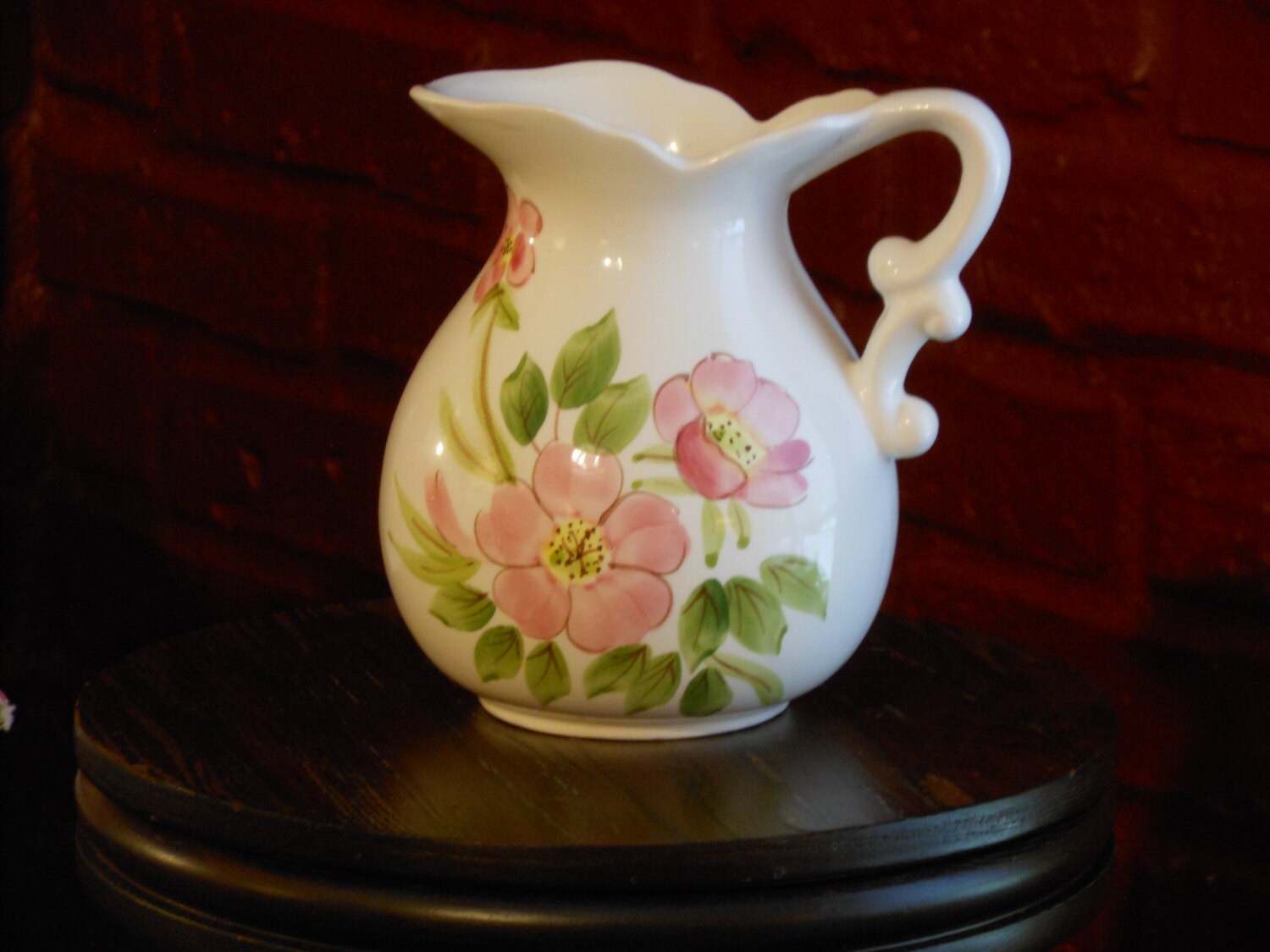 Cute little pitcher vase. Not marked. Light crazing. Pink and green floral design on one side only. No chips or cracks. Measures 5.5 inches tall and rim is 4 inches by 3 inches. This vase weighs 10 ounces.