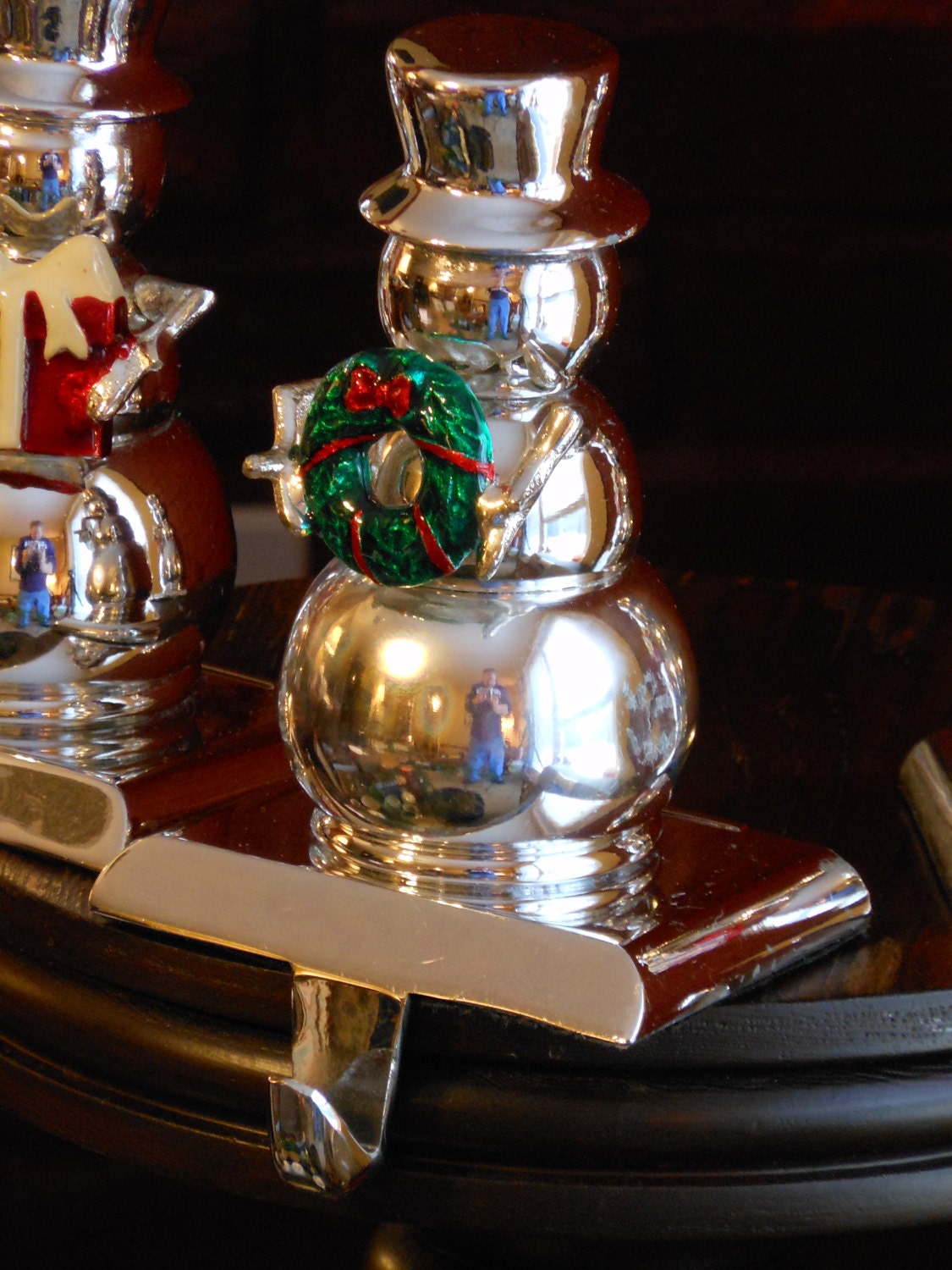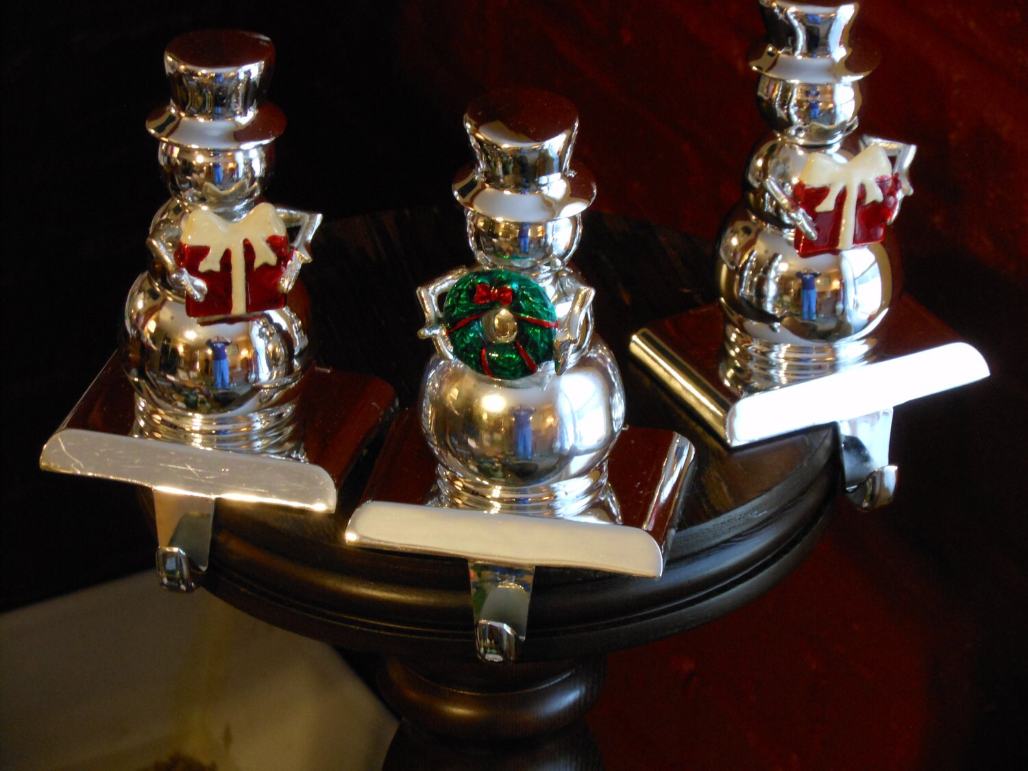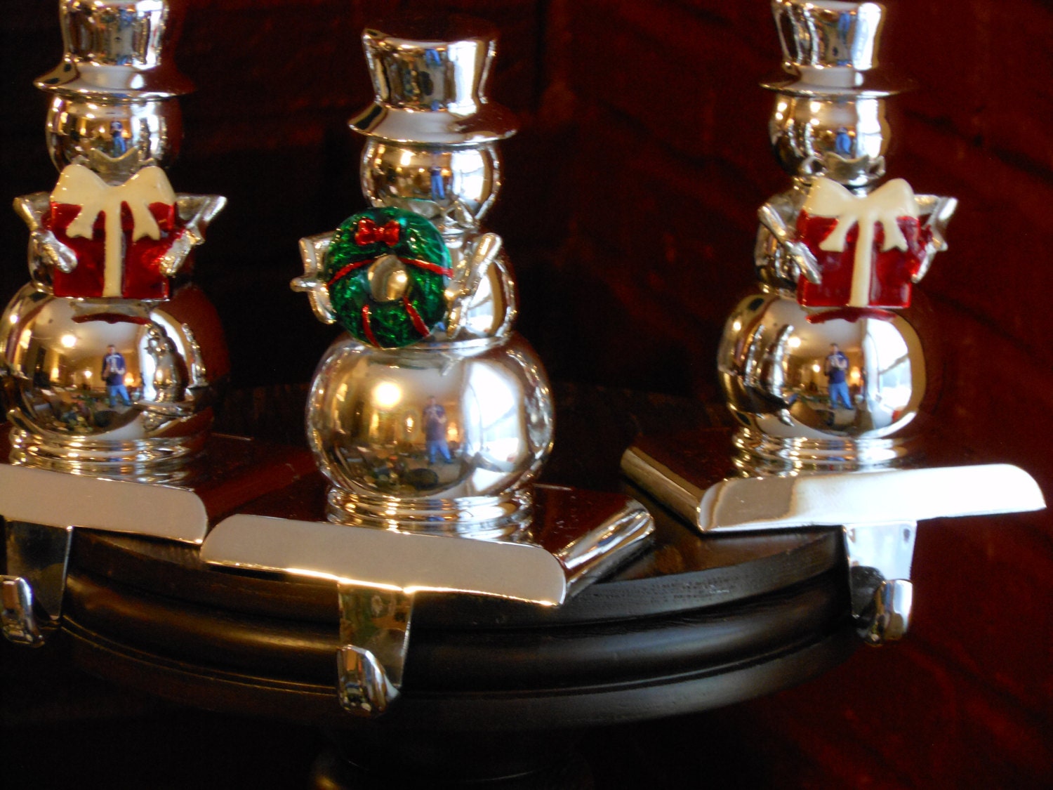 Very shiny metal snowmen stocking holders. Each one is 5.5 inches tall with a base of 3.5 inches across. Each weighs 1 pound, 8 ounces with a combined weight of 4 pounds, 5 ounces. One snowman is bearing a wreath and the other two are bearing gifts. The Three Snowmen.