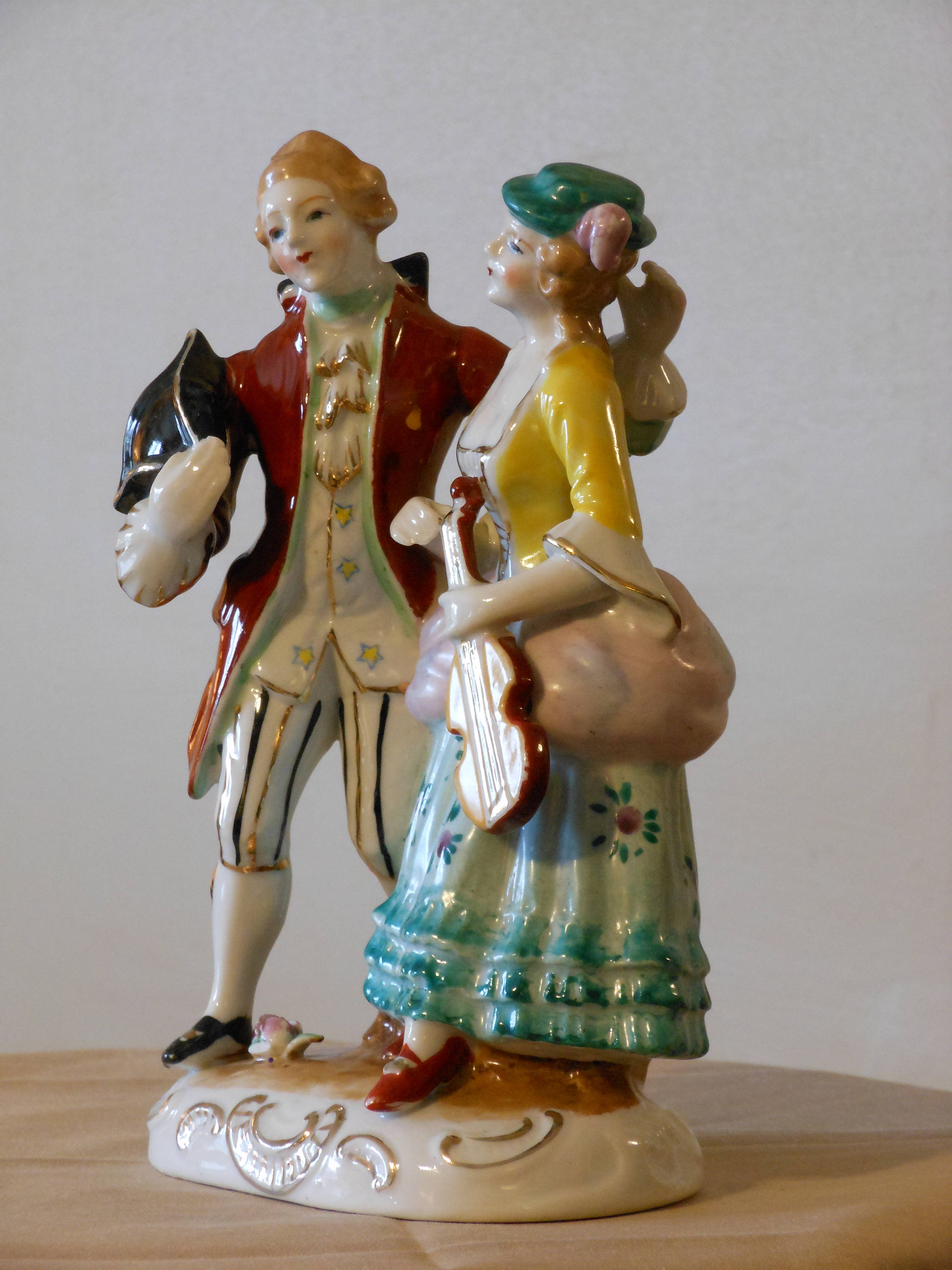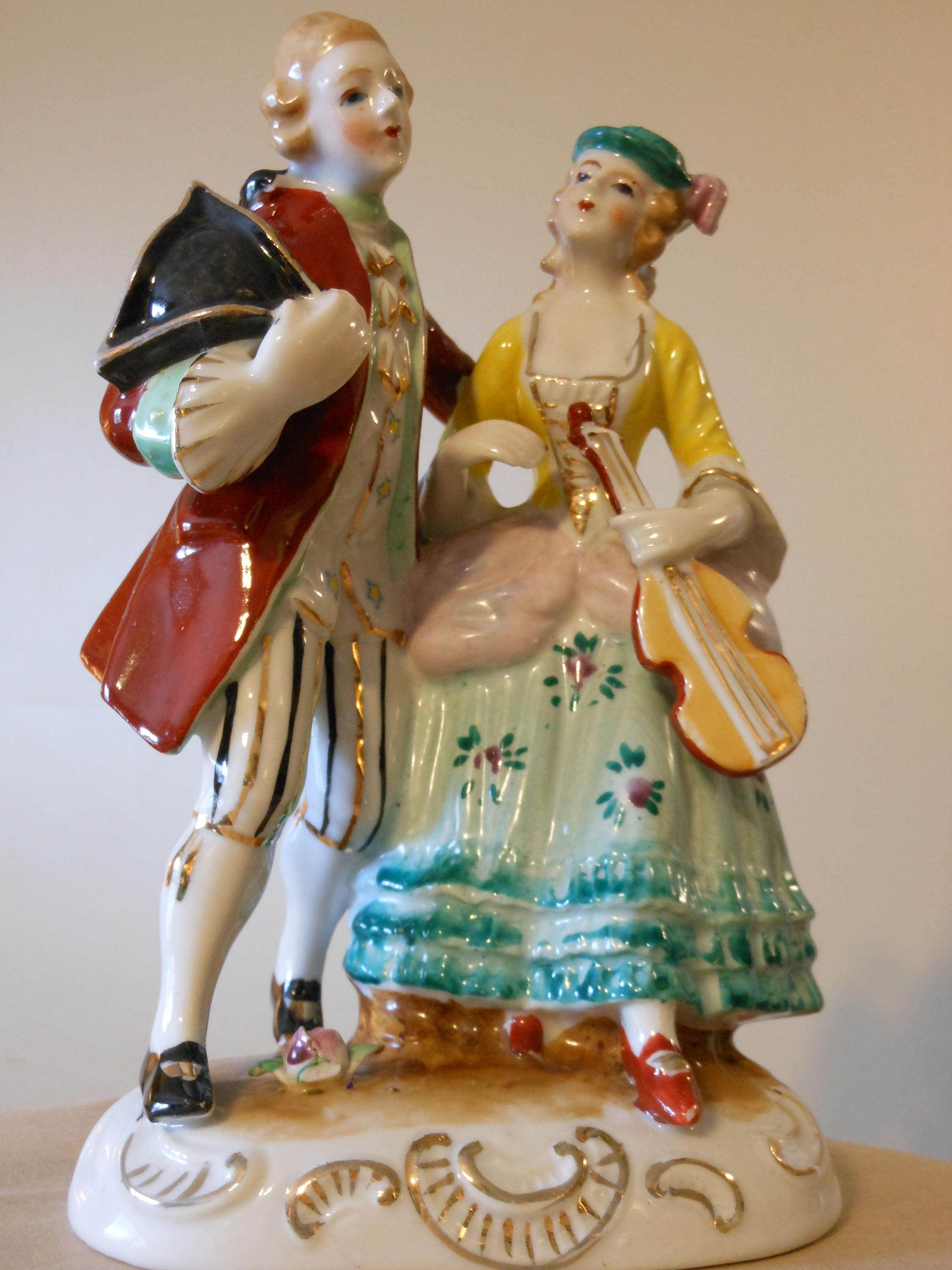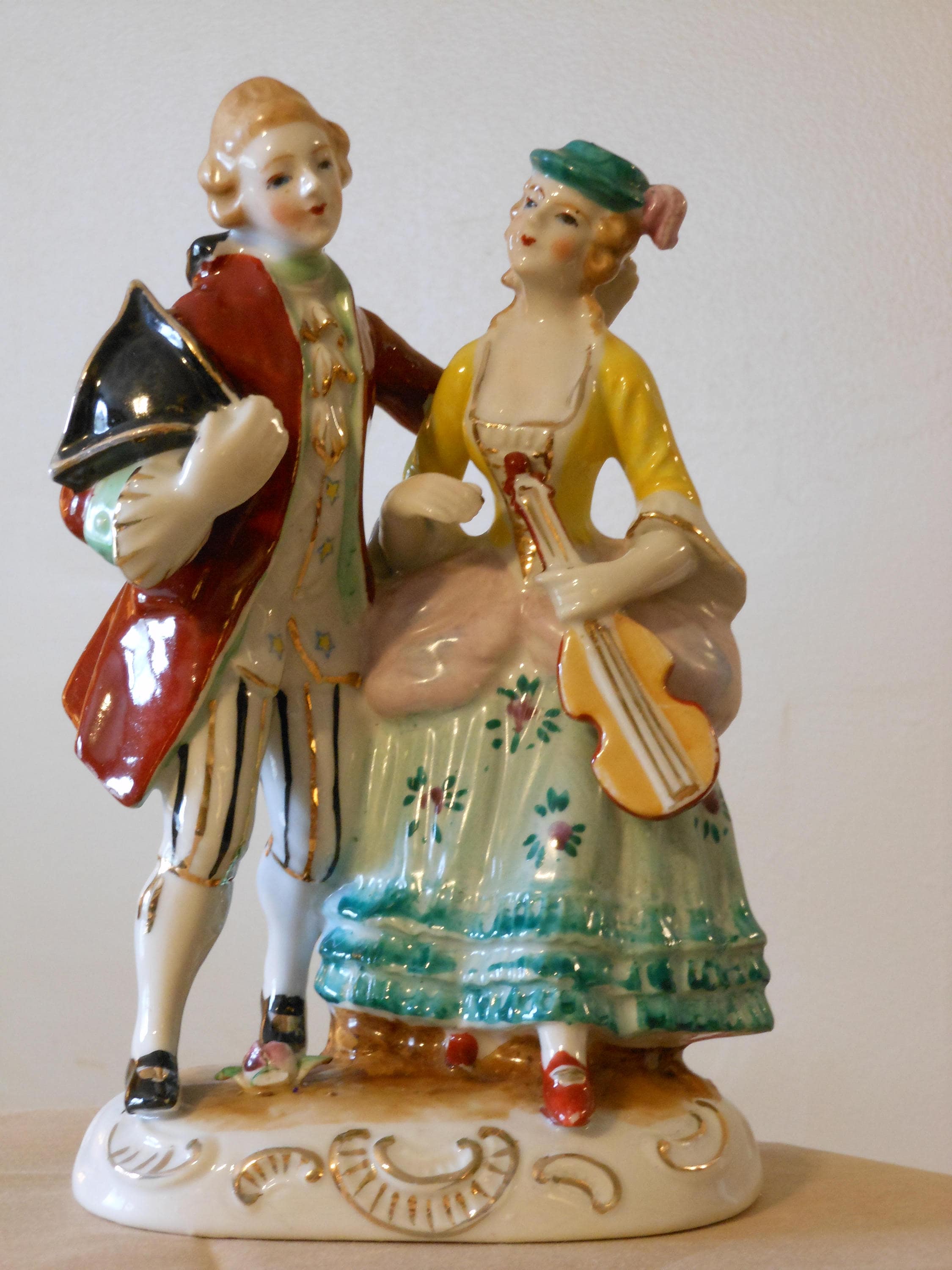 Handsome French colonial couple strolling, man holding his hat, woman holding a violin. Condition issue: man's right arm has been broken at the elbow and glued--only noticeable from the back. This piece is 7.5 inches tall and the base is 4.5 inches wide. Hand painted. Clean and except where noted, in very good condition. Main colors are red, white, light blue, yellow, gold accents. This piece weighs 15 ounces.