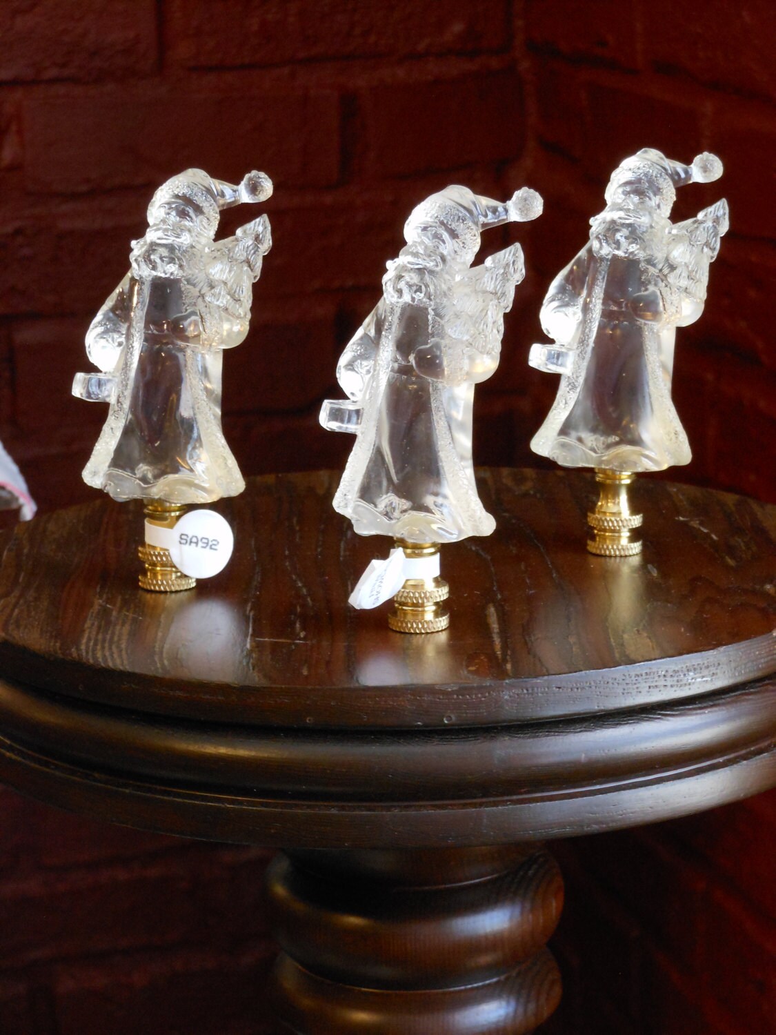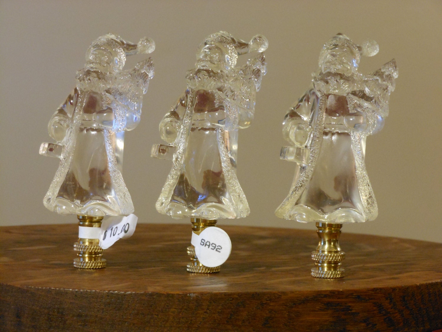 Hard plastic resin Santa Claus lamp finials. Solid brass fittings. Fits any lamp shade. Santa is carrying a gift and a Christmas tree. These stand 4 inches high and weigh a combined 5.5 ounces. Spruce up your home for the holidays!