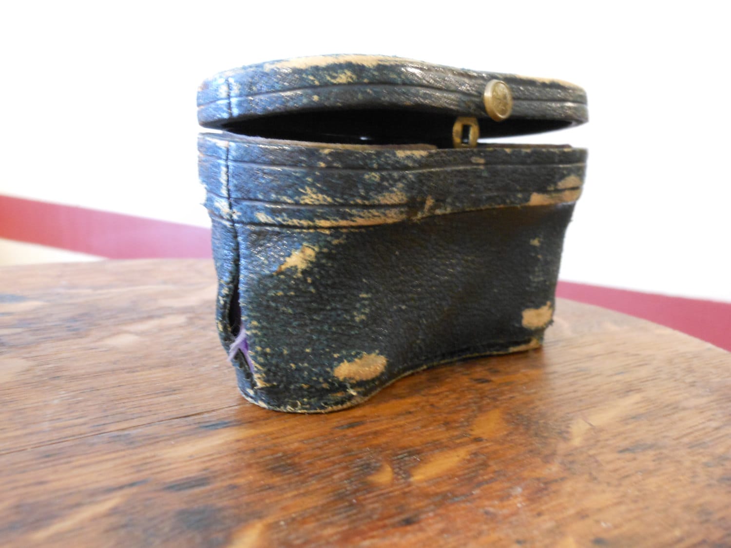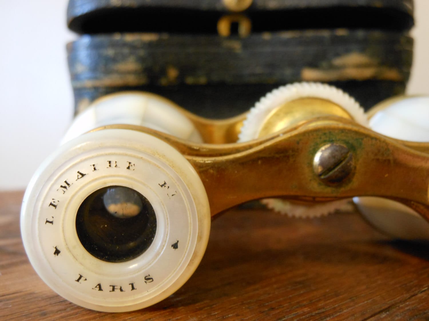 This is the genuine article. LeMaire Paris opera glasses. Made in the late 19th century in France. Brass and Mother of Pearl. Included is the original black leather case with purple sateen lining. The case shows wear and the seams on the side are splitting. The glasses still fit in the case and the case clicks shut. This was kept in a lady's handbag. In fact, the case still smells of perfume. The purple lining is in very good condition for its age. The opera glasses have been tested and work great. The brass shows some wear, appropriate with age. This is an antique piece and has been used for its intended purpose. The glasses stand 2 inches tall and are 3.5 inches across. The case is about 2.75 inches tall and 4 inches across. The case and glasses weigh a combined 7 ounces.