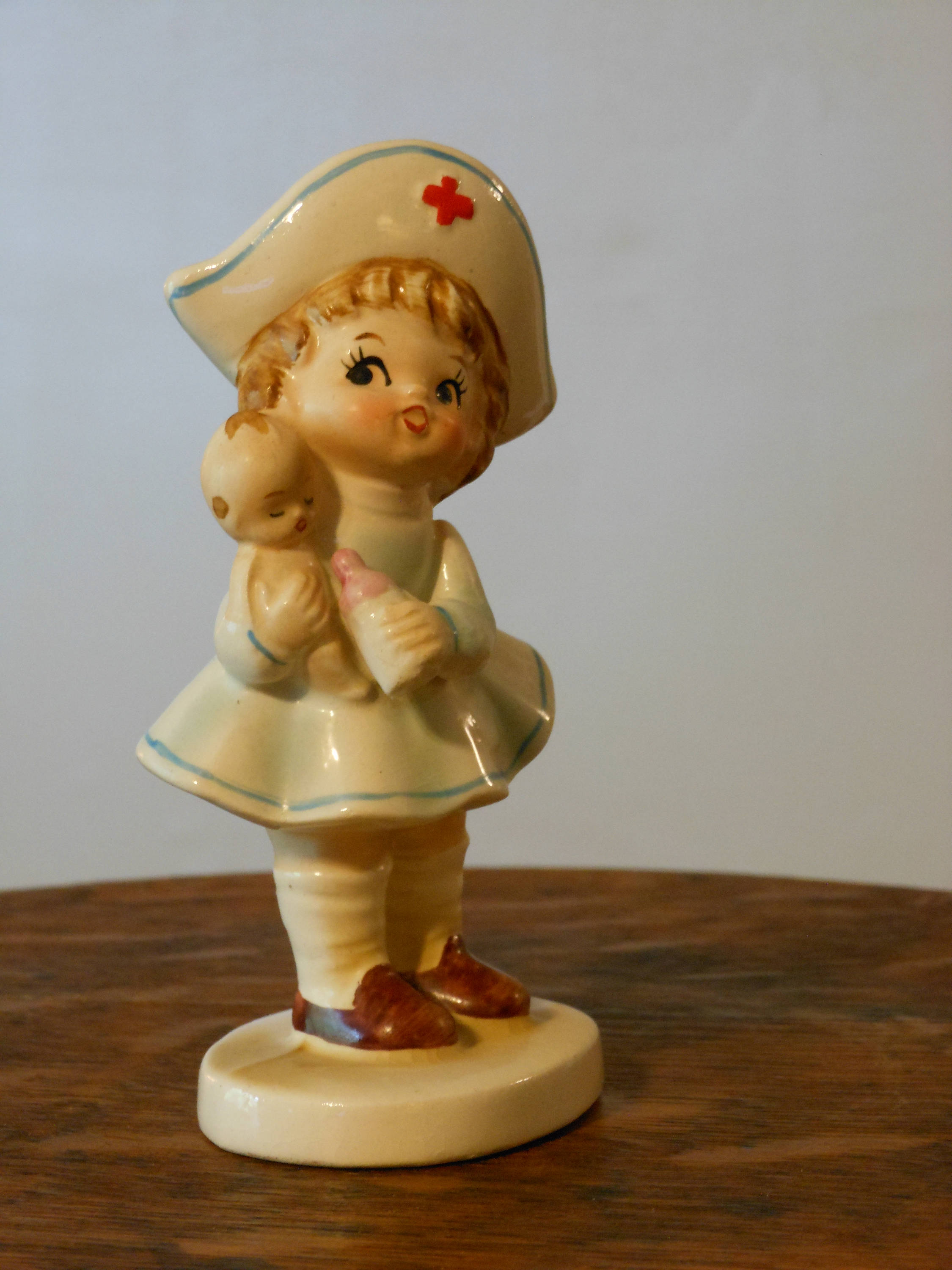 Very cute, excellent condition. Nurse with baby figurine. Vintage. Stands 4.5 inches. Base is 2.25 inches. Clean. No markings--maybe Arnart or Lefton. This figurine weighs 2 ounces.