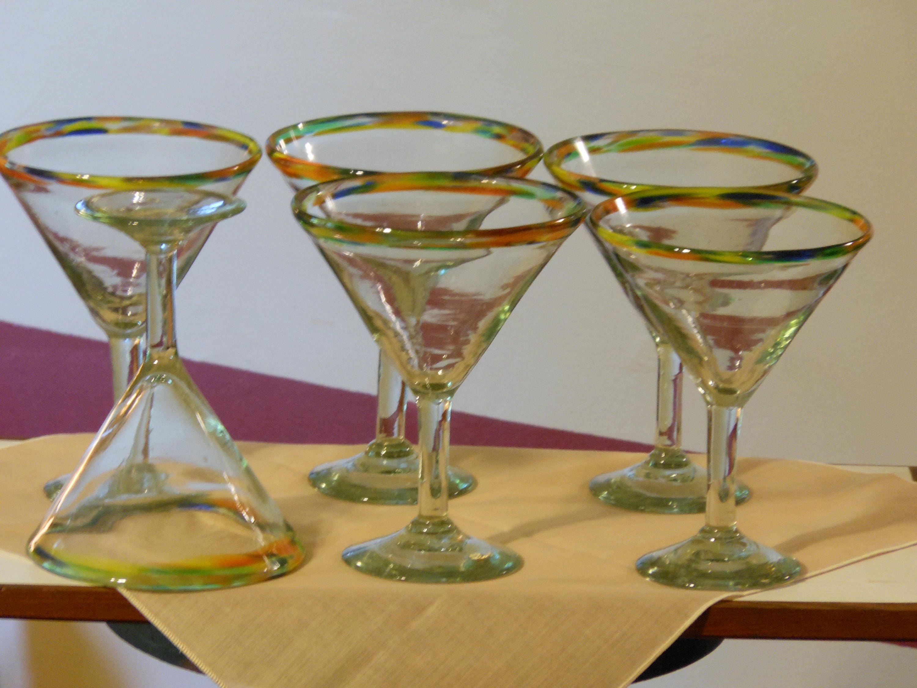 Six martini glasses, heavy at 12 ounces. These glasses stand 6.75 inches tall and have a base that is 3.25 inches around. Each glass holds 12 fluid ounces. They weigh a combined 4.5 pounds.