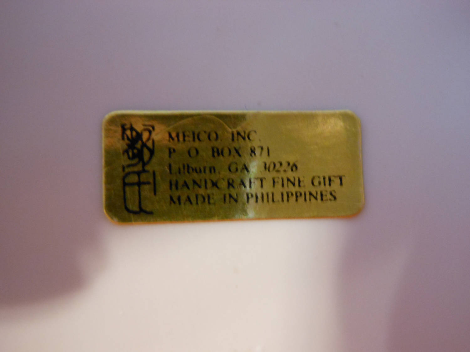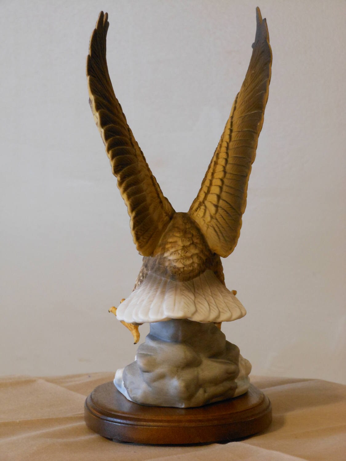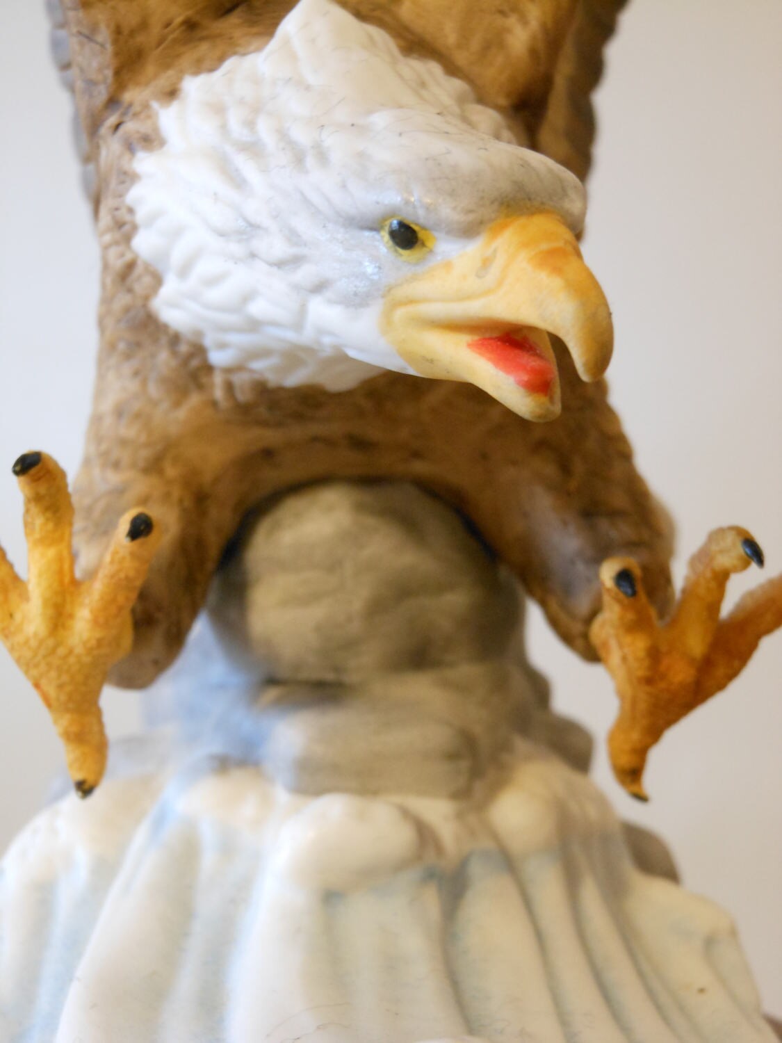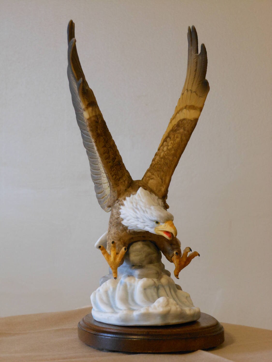 Impressive ceramic bald eagle in attack mode. Talons bared, swooping in for the catch. Made in the Philippines. Wooden stand is not attached, has felt dots. With its stand, the bald eagle measures 8 inches tall. Stand is 4.5 inches long. Eagle is 3.5 inches wide and measures 7.5 inches tall without the stand. Minor condition issue: one tip of one feather has been repaired with glue. This piece with stand weighs 12 ounces.
