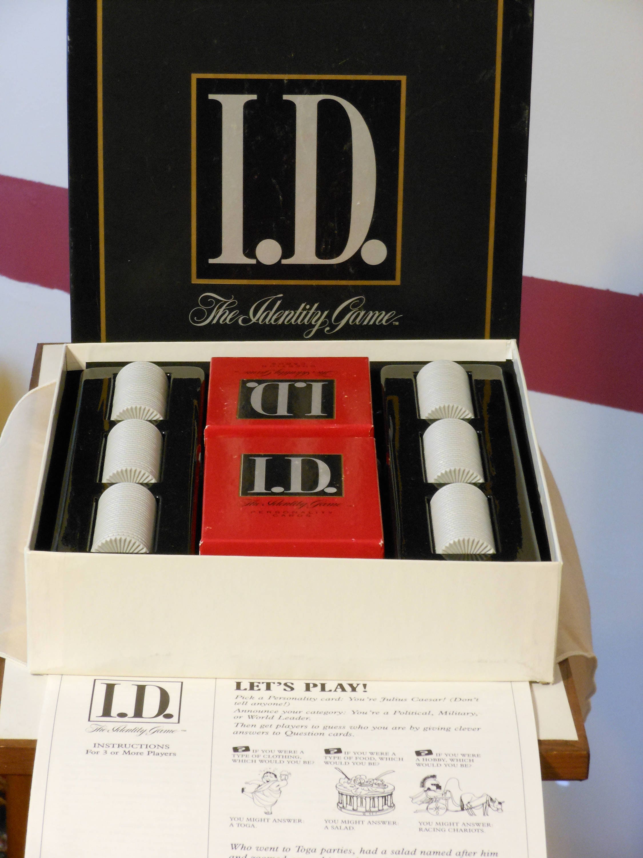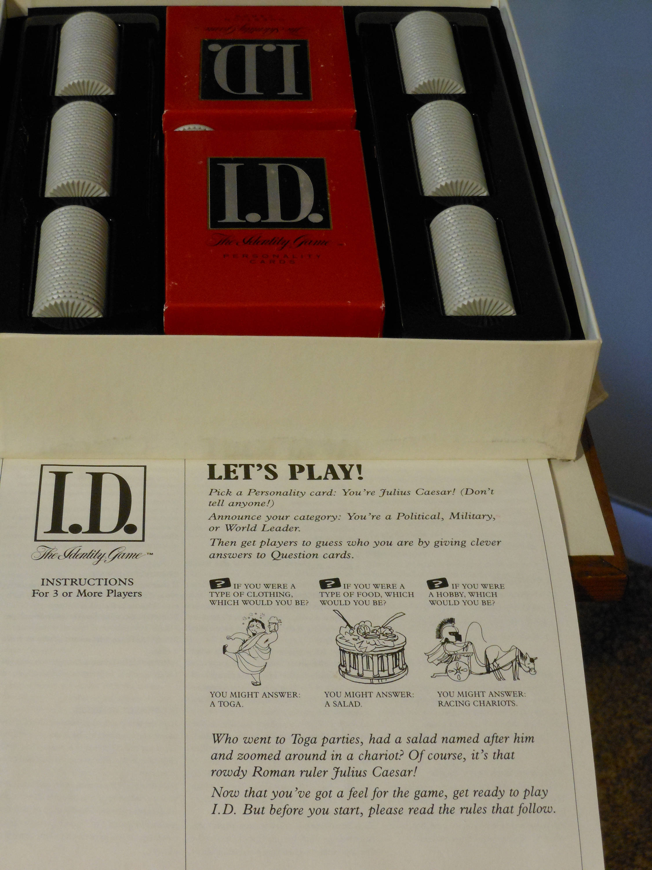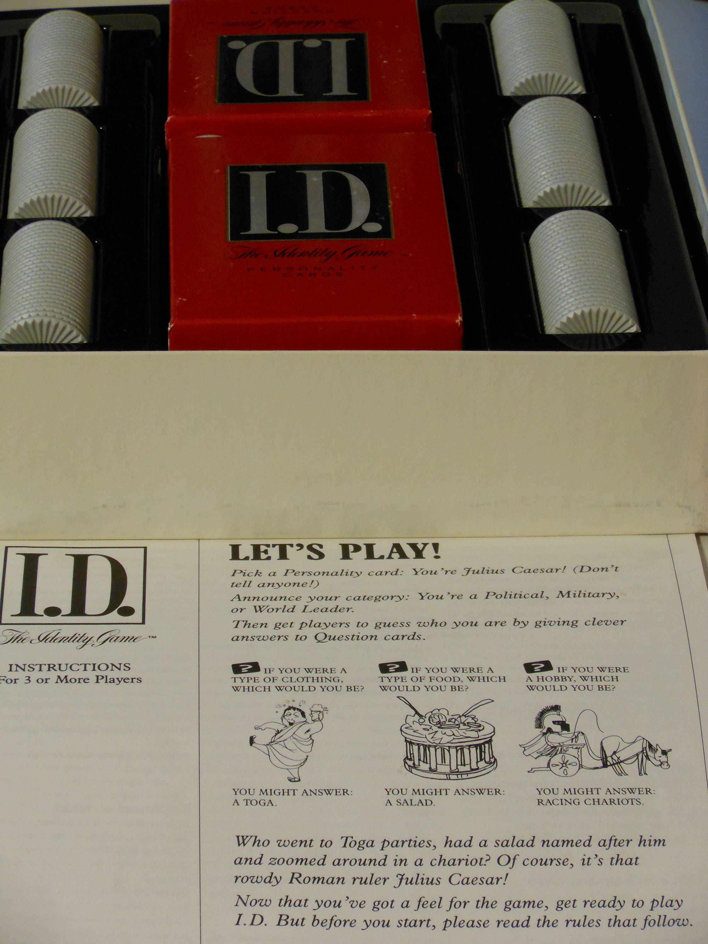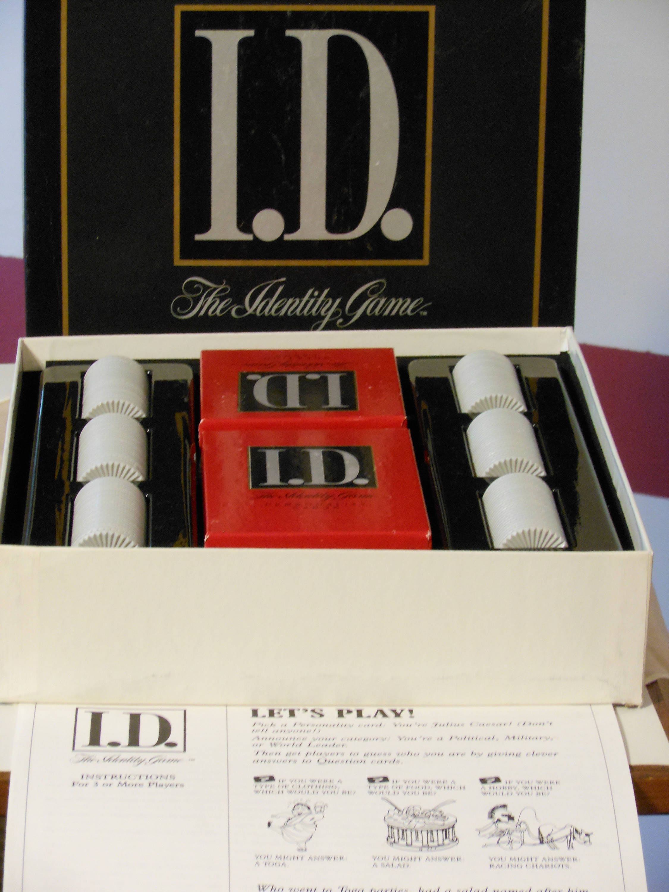 Personality cards, question cards, chips. Win or lose chips by guessing or not guessing the identity of another player. For 3 or more players. Can be played in teams. First player or team with 25 chips wins the game. 314 Personality cards, 216 Question cards, 150 plastic chips, 1 chip storage tray. If no player has 25 chips, then the player with the most chips when all chips are awarded wins the game. Game is complete and ready to play. Contents are in excellent condition. Comes with instructions. Game box lid shows only a little wear