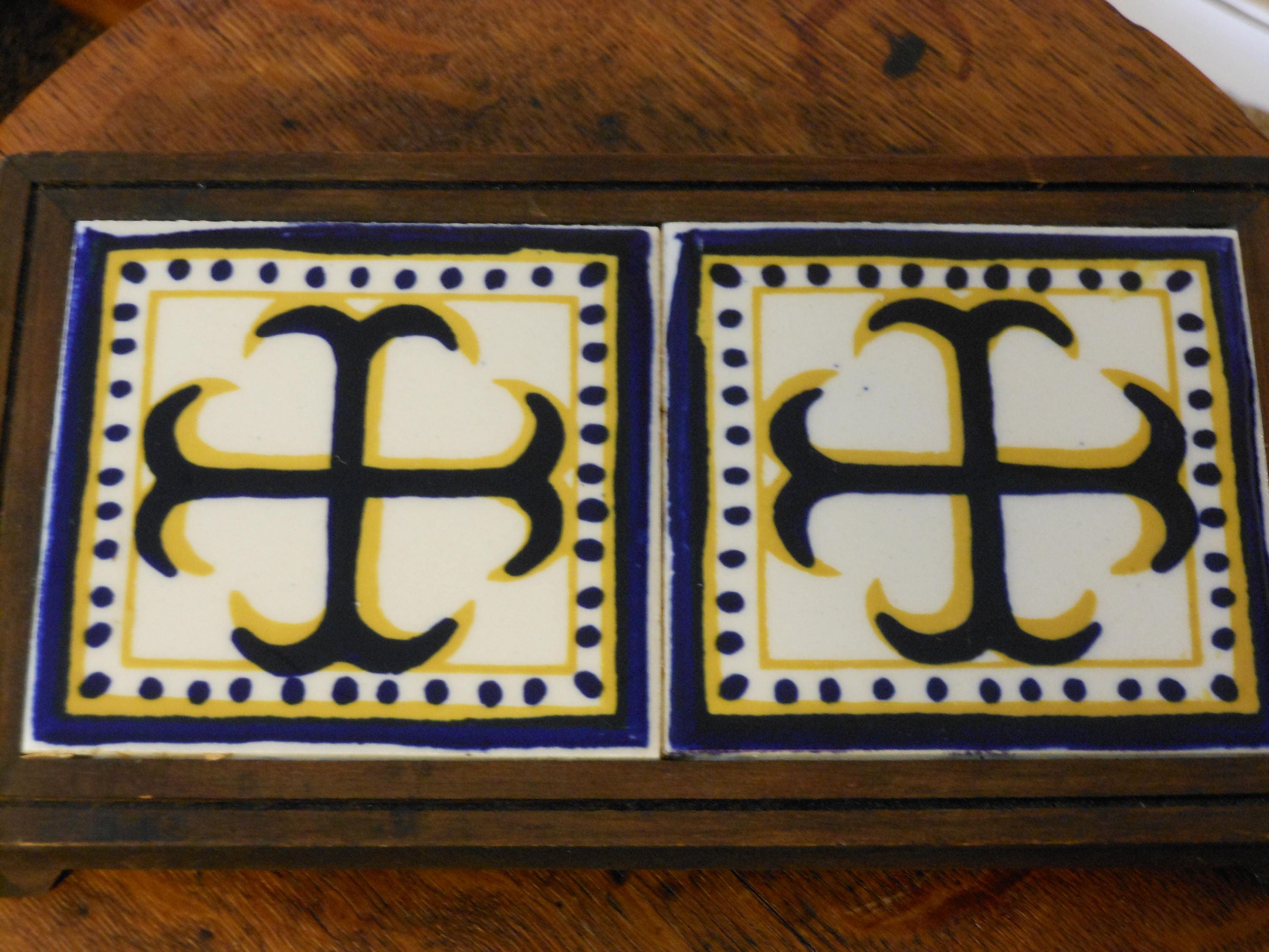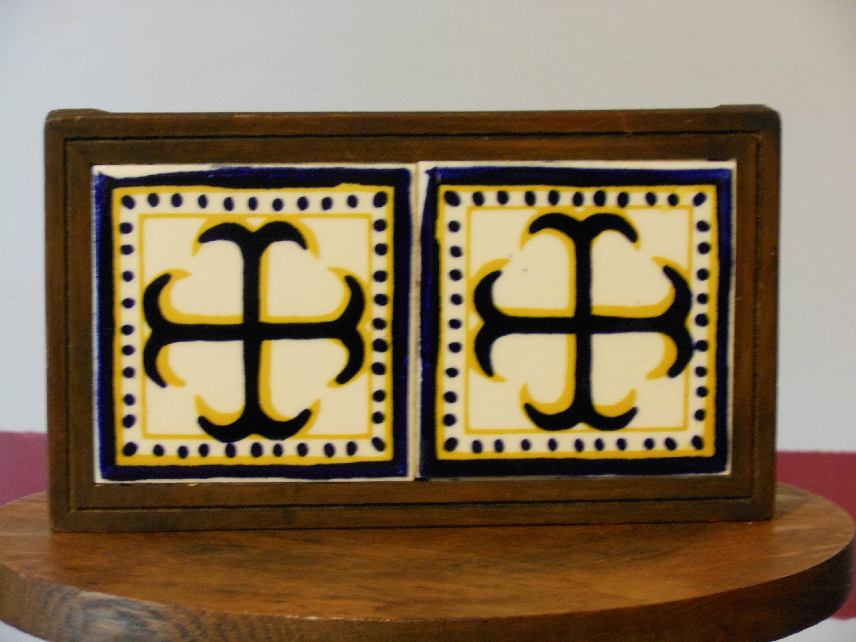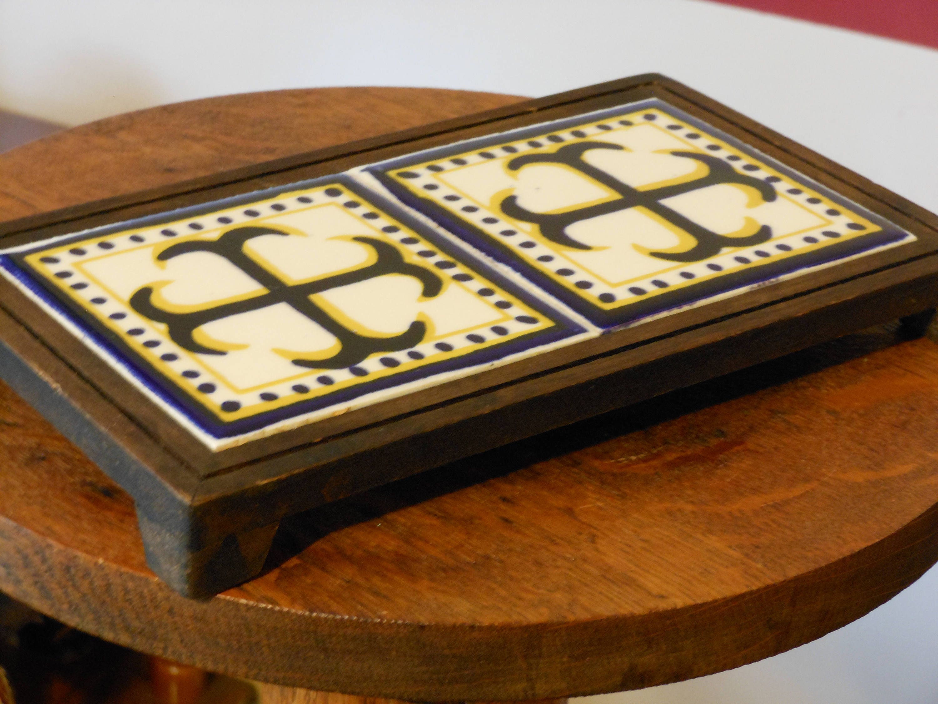 Made by Orion from Monterrey, Mexico. A wooden trivet with feet and two ceramic tiles featuring the Cercelee Cross. No chips or cracks in the tile. Wooden trivet frame has only minor scratches. Measures 9.75 inches long, 5.5 inches wide and stands 1 inch tall. This trivet weighs 13 ounces.