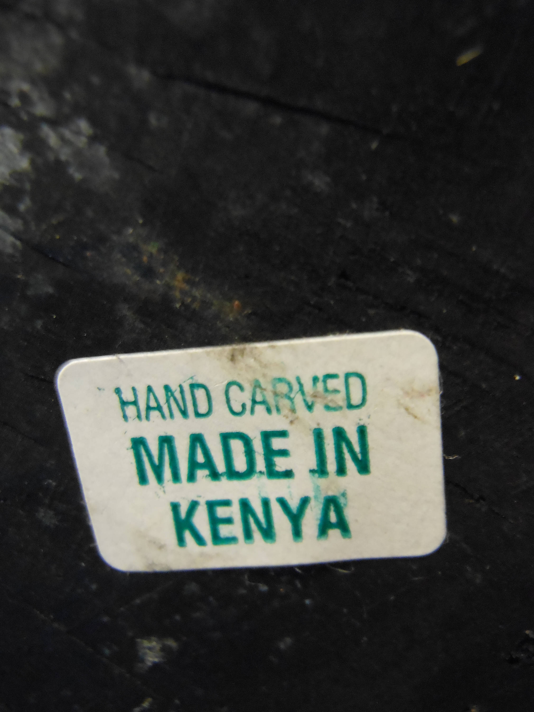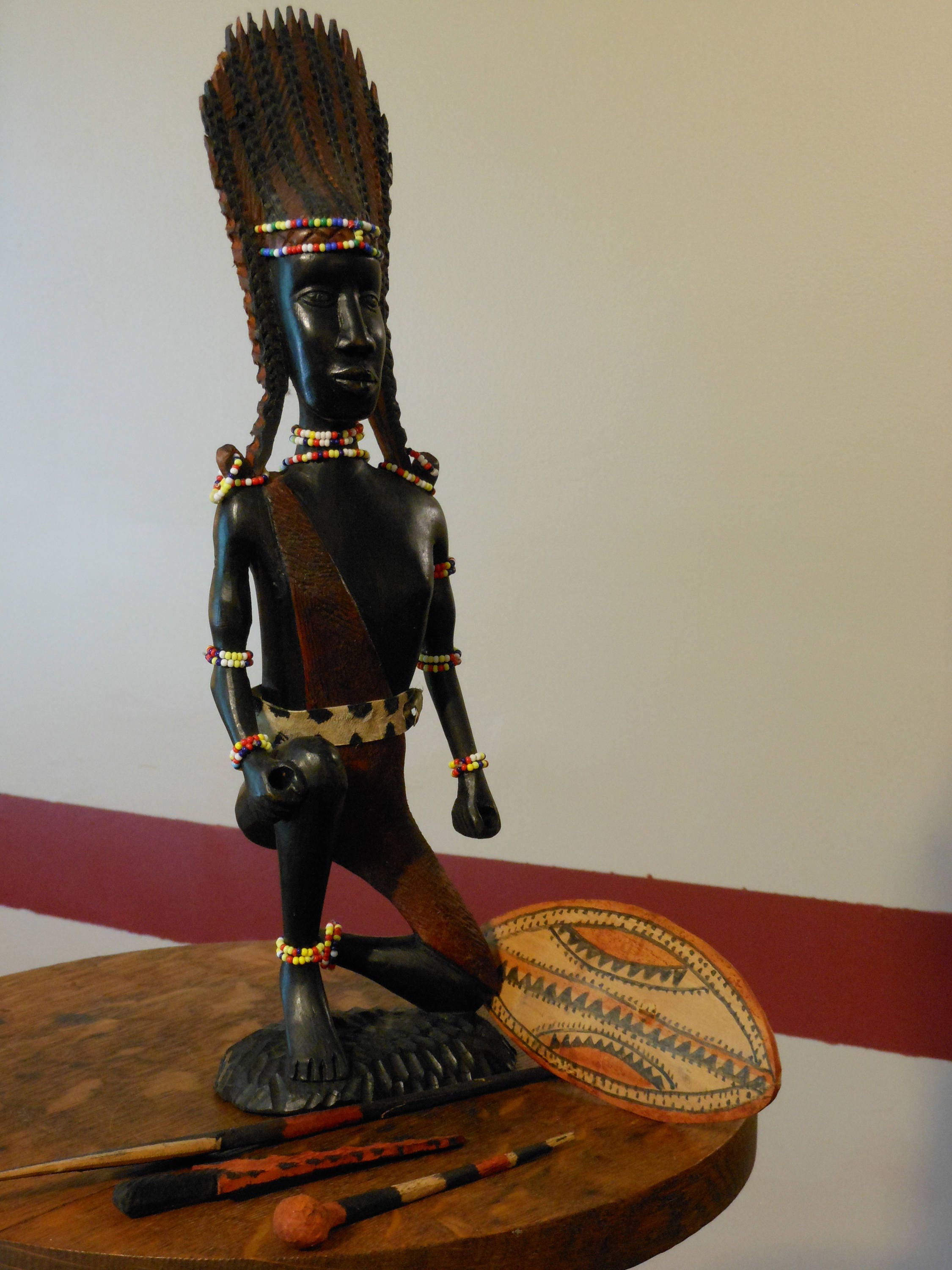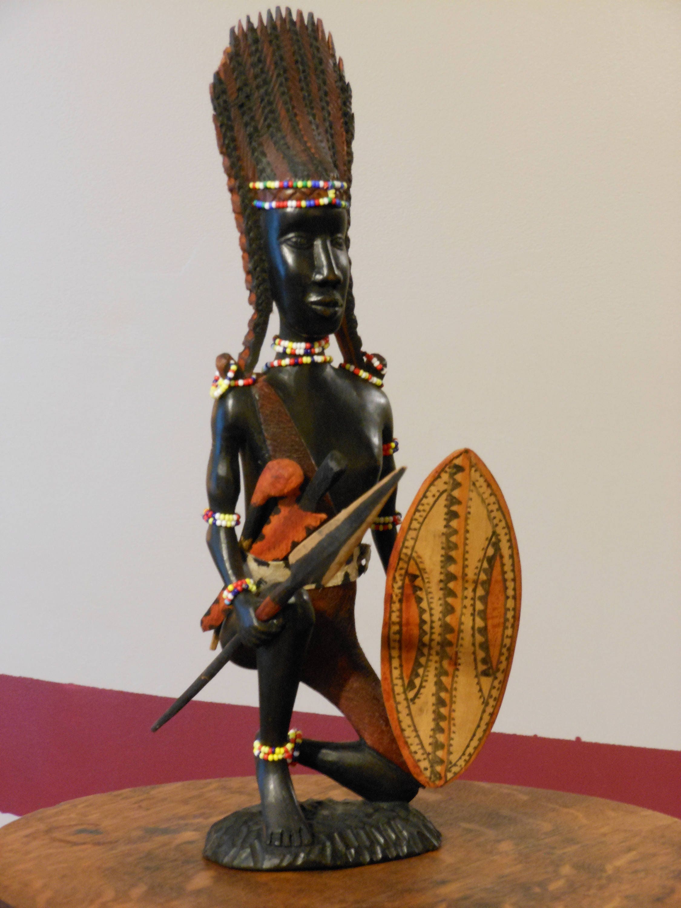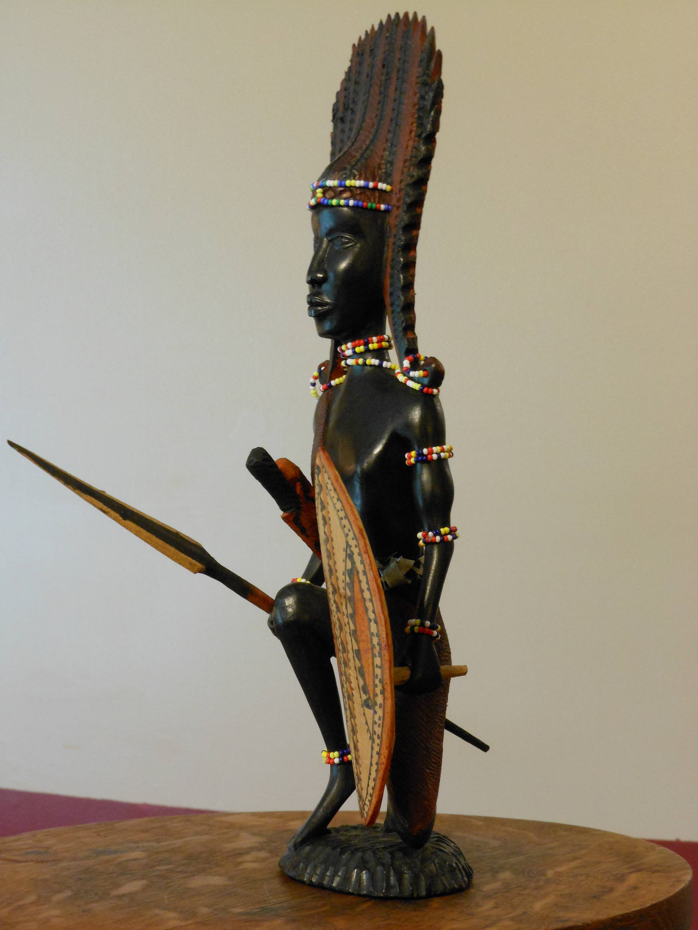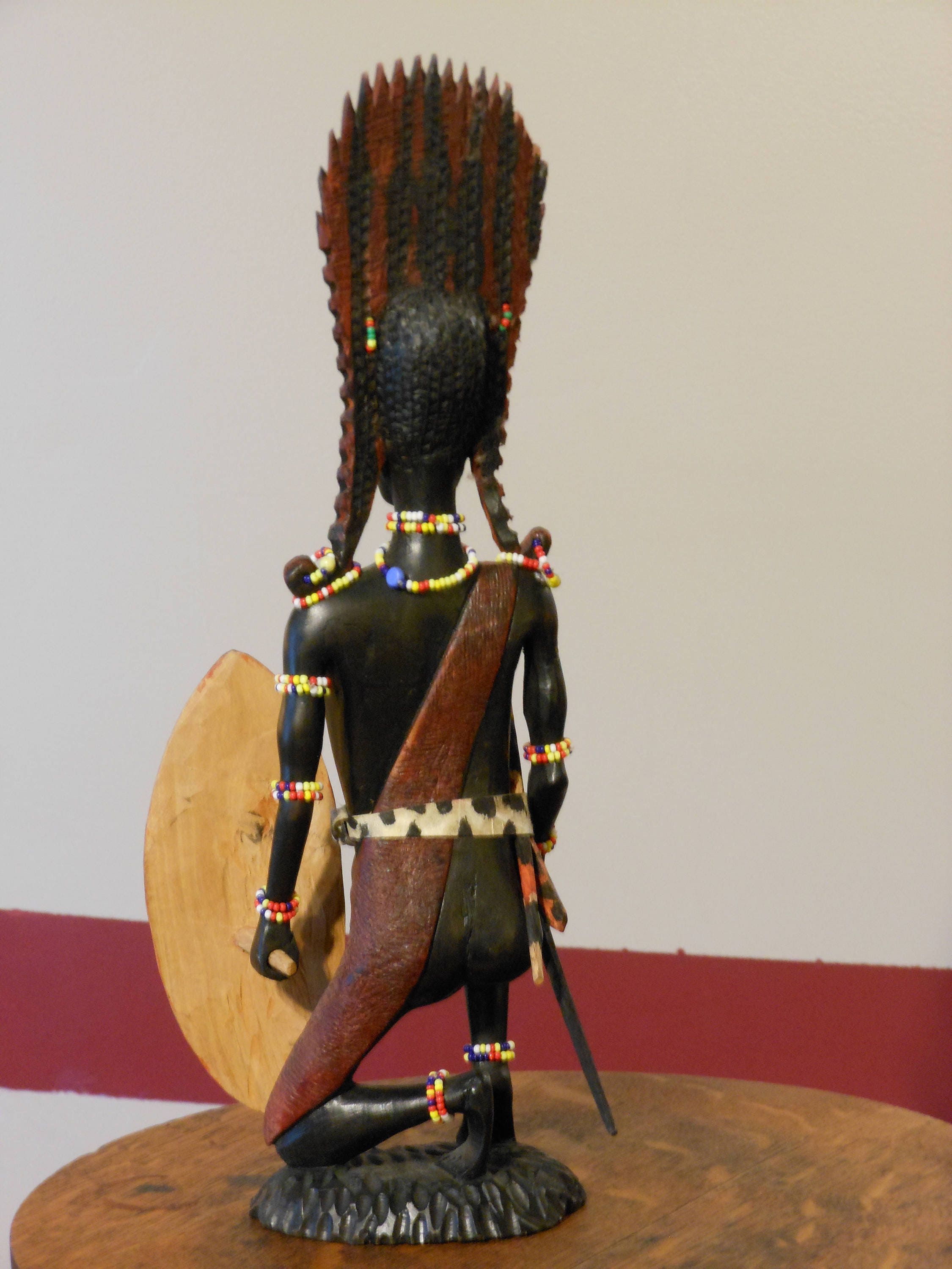 Hand carved in Kenya, this vintage warrior has detachable weapons: two knives, a spear and a shield. Excellent condition, this piece is 13 inches tall and has a base of 4 inches around. Plastic bead jewelry, fabric belt holds knives. This piece weighs 11 ounces.