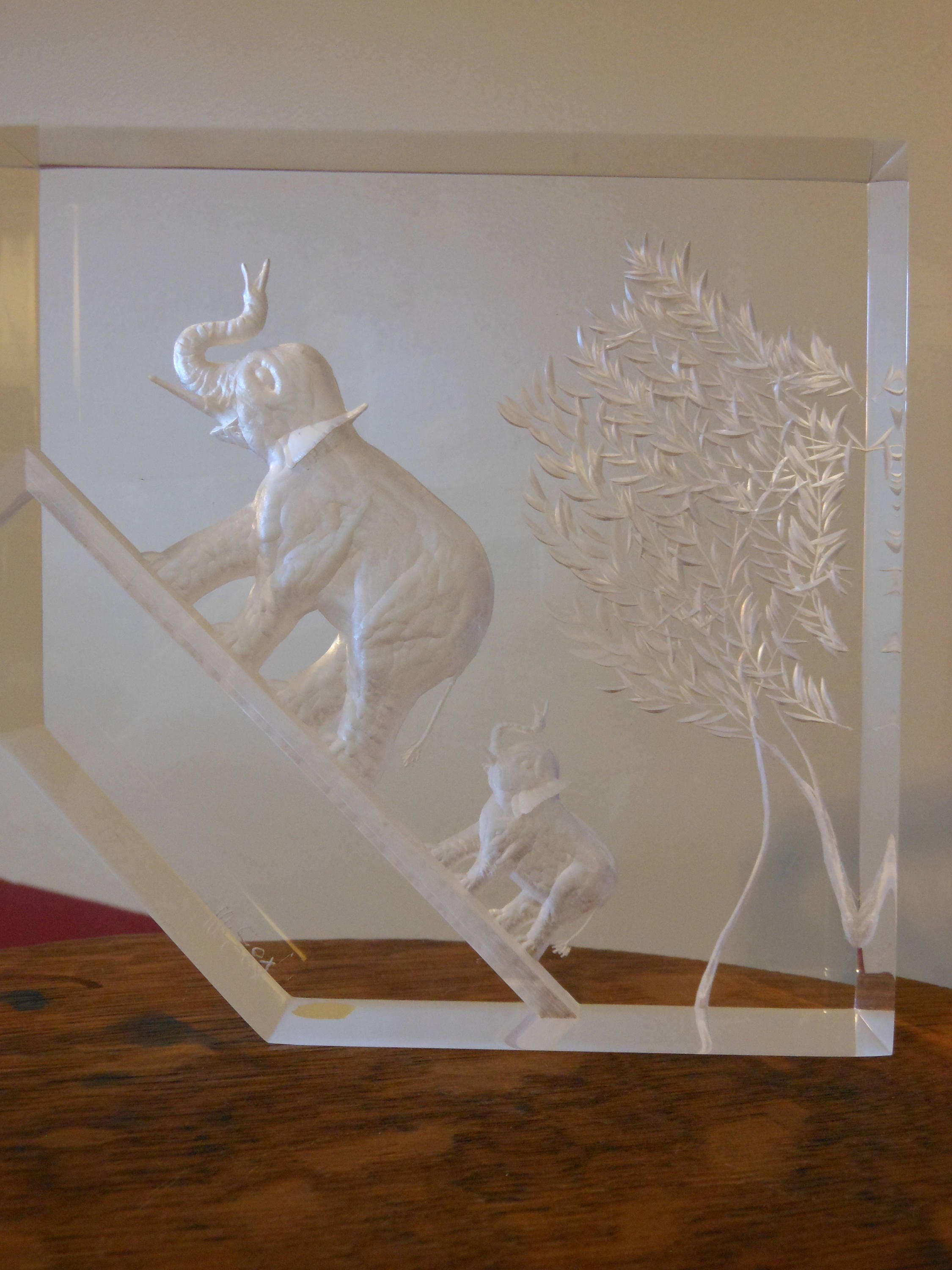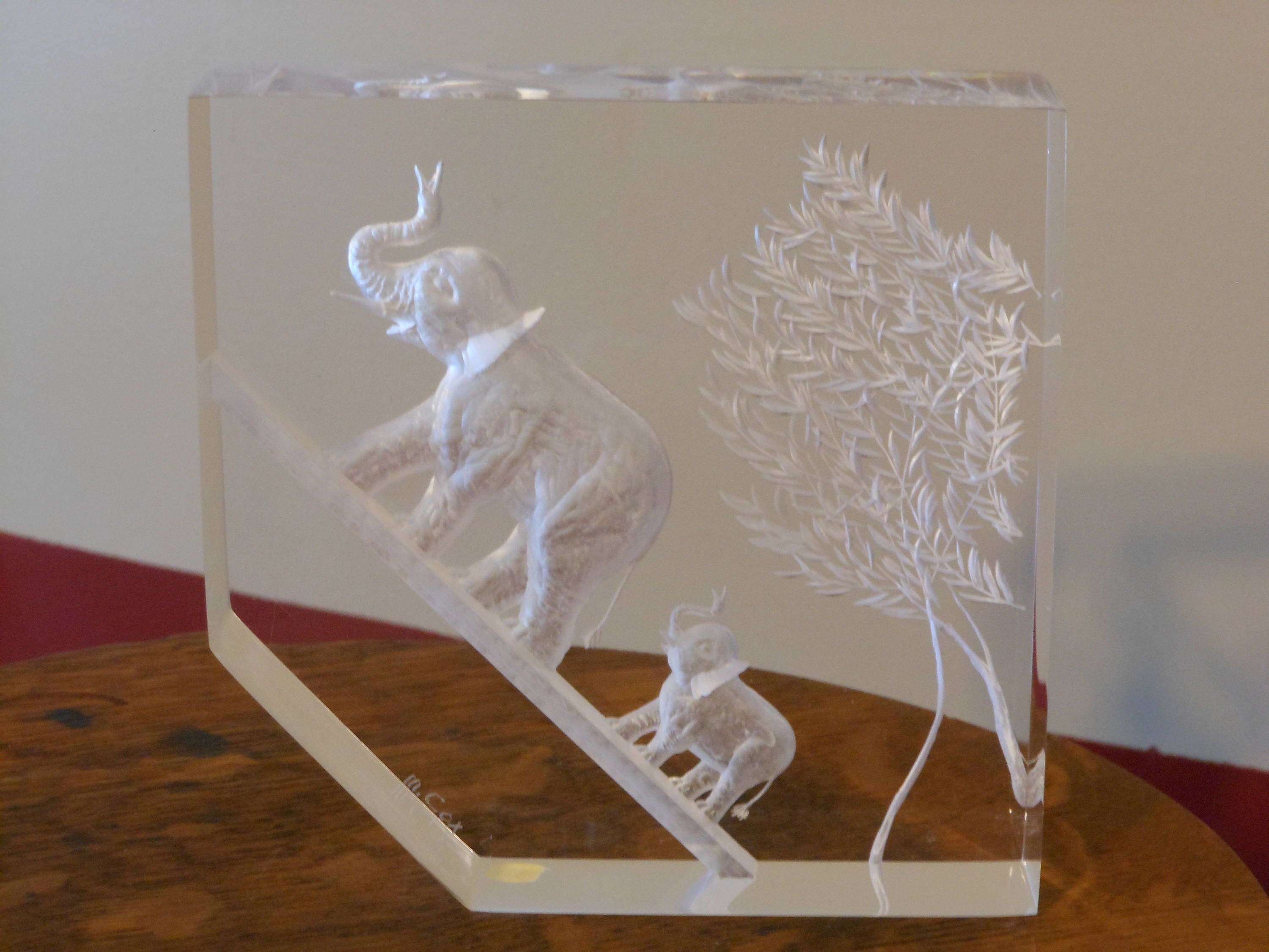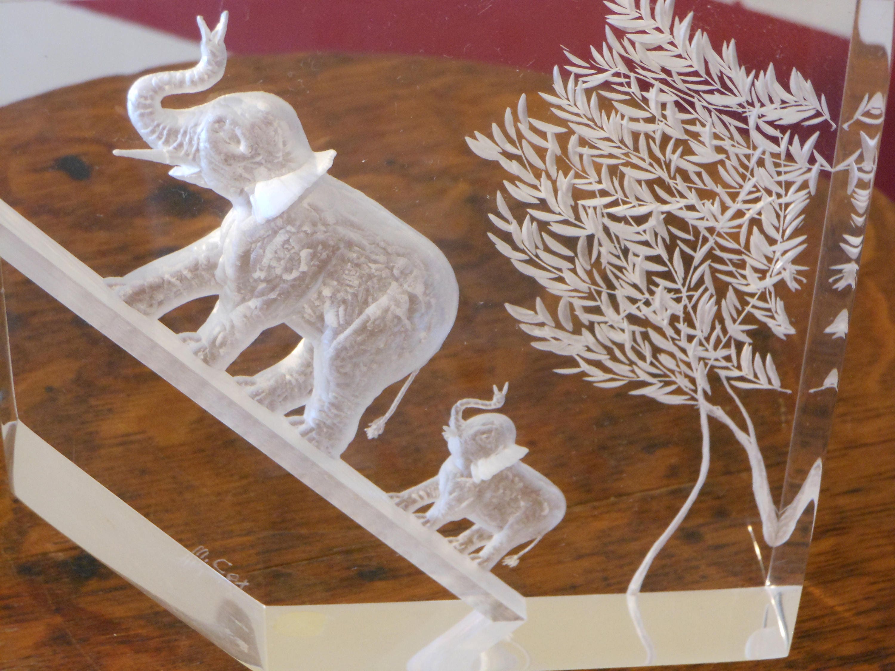 Has flat edges and can be stood on three different angles. Signed by artist M. Cox. Excellent condition, no damage. Great detail. Clear prism. Mama and baby African elephants. This piece weighs 1 pound, 10 ounces.