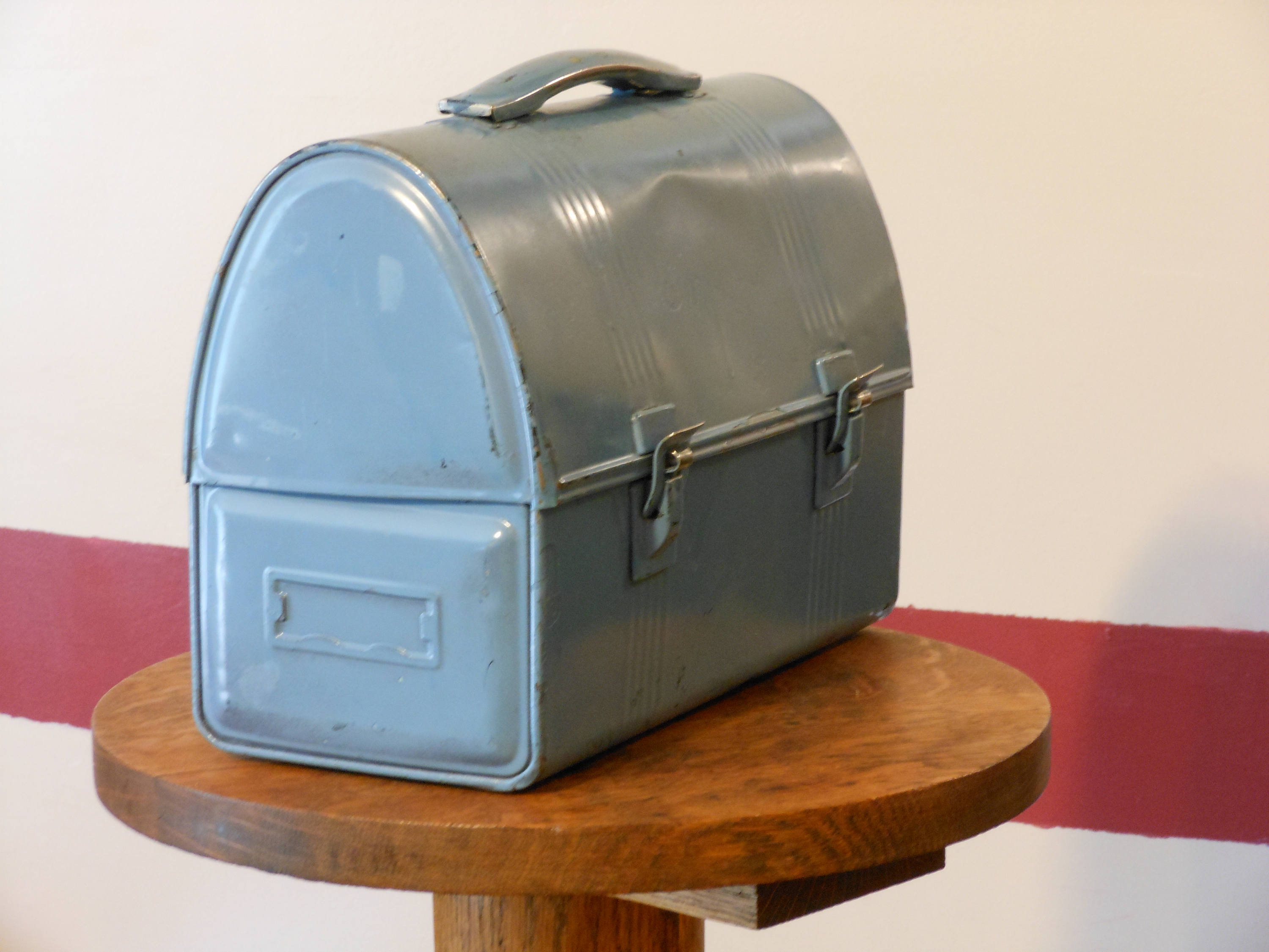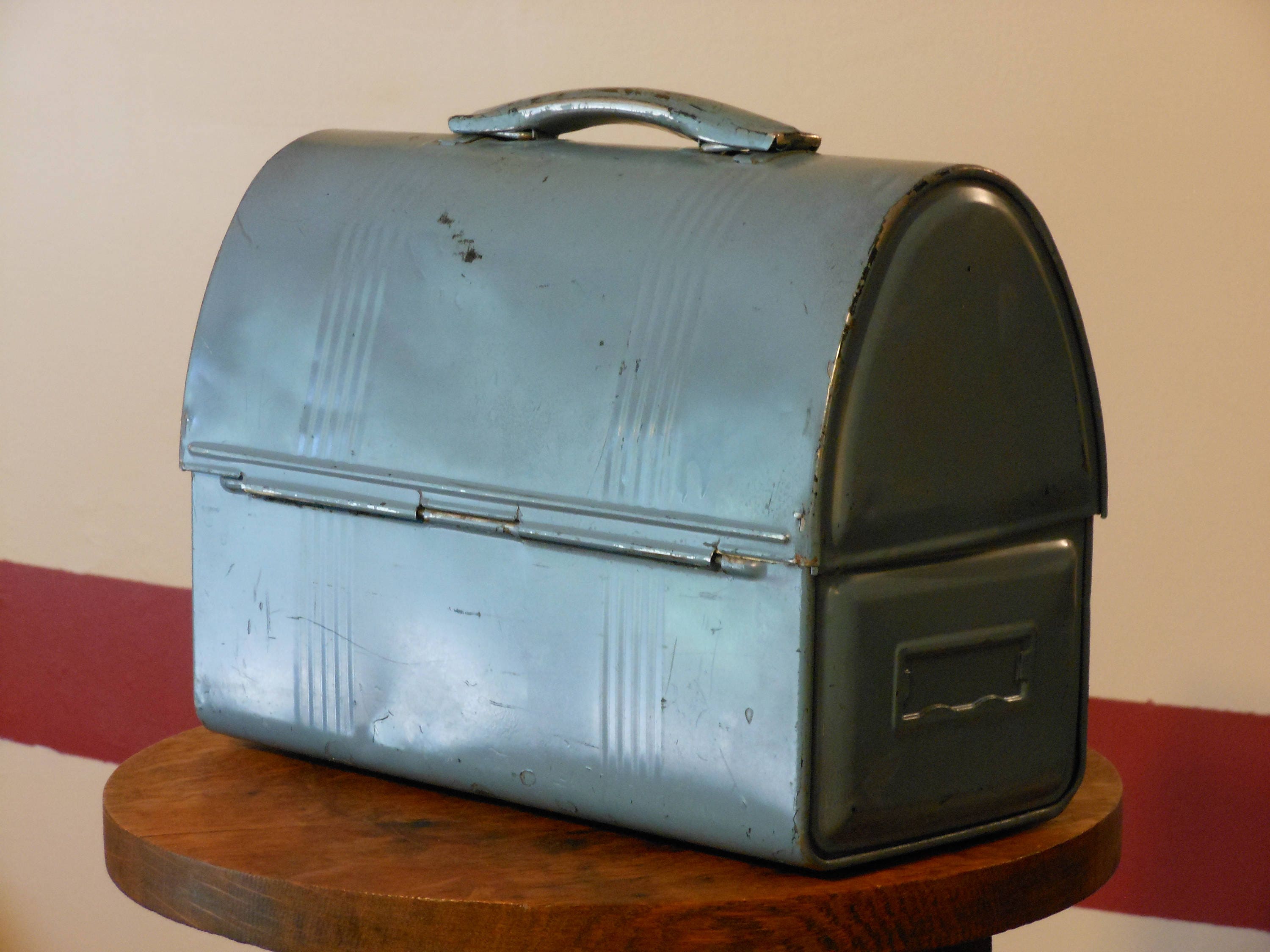 What we have here is vintage American lunchbox. Painted a blue-green, probably black at one time. Latches, good handle. Inside has been lined with fabric. A place for a name card on each side. No thermos. A bit of Americana. A few dents, a few scratches--character. Stands 8.5 inches tall and measures 10 inches across. Weighs 1 pound, 8 ounces empty.
