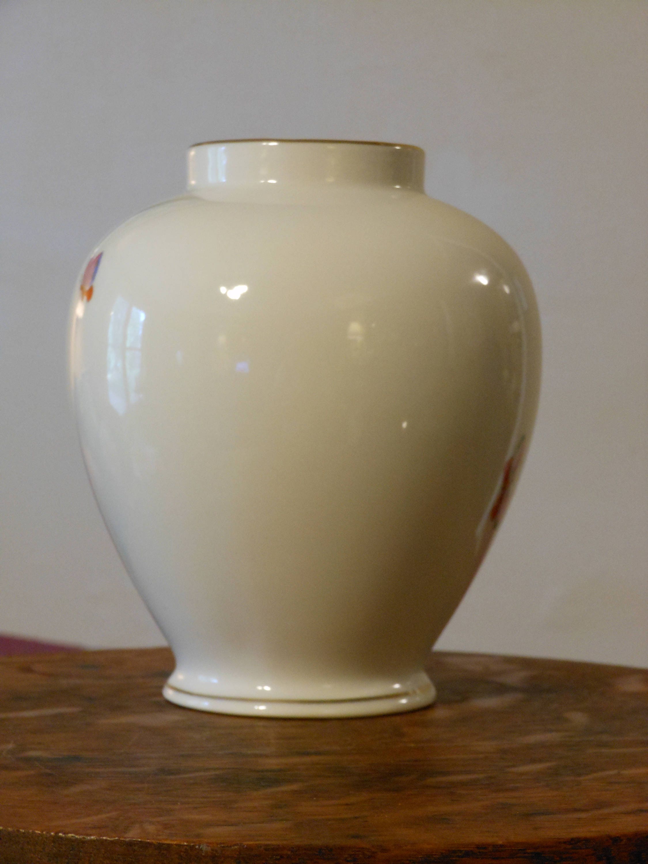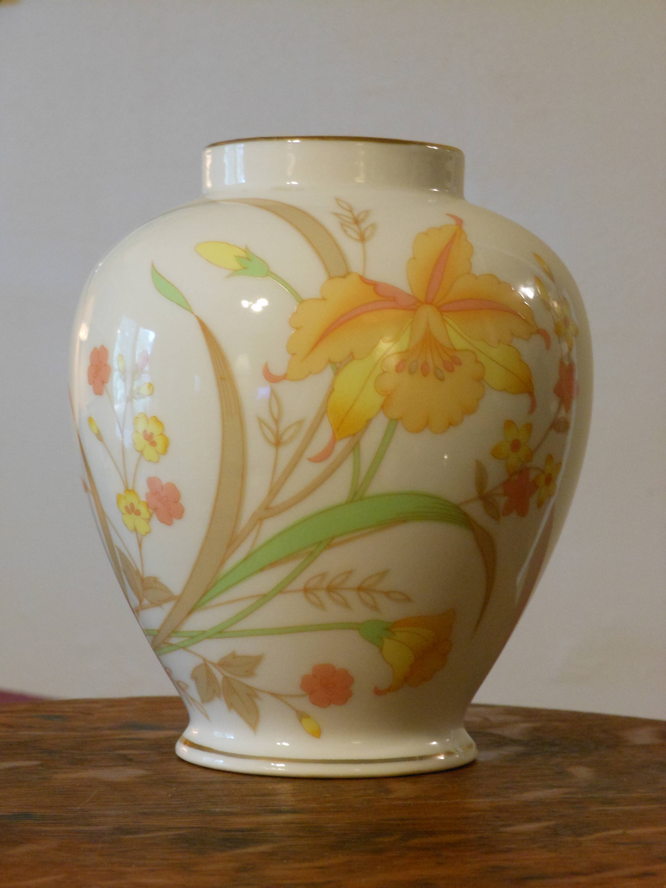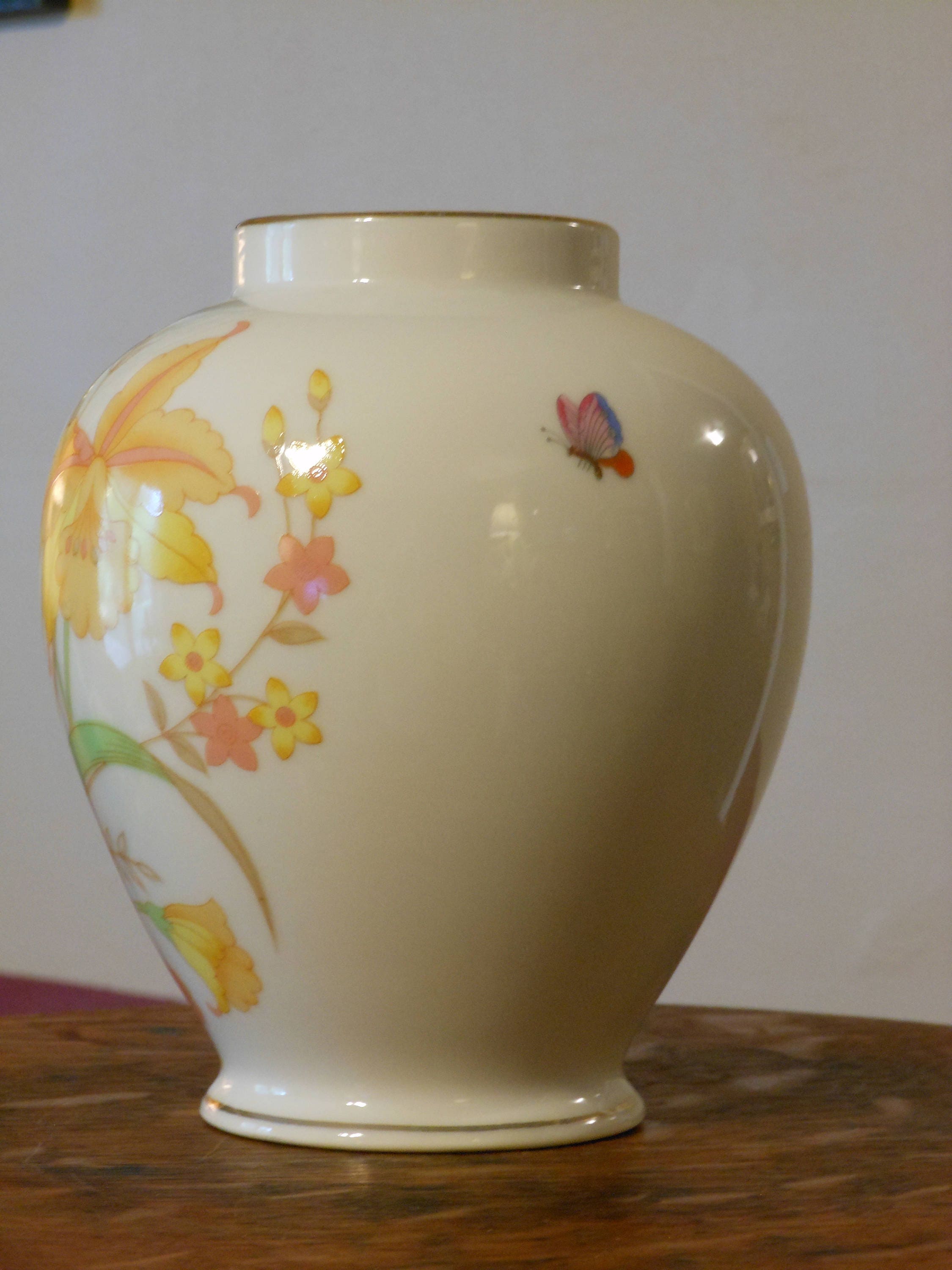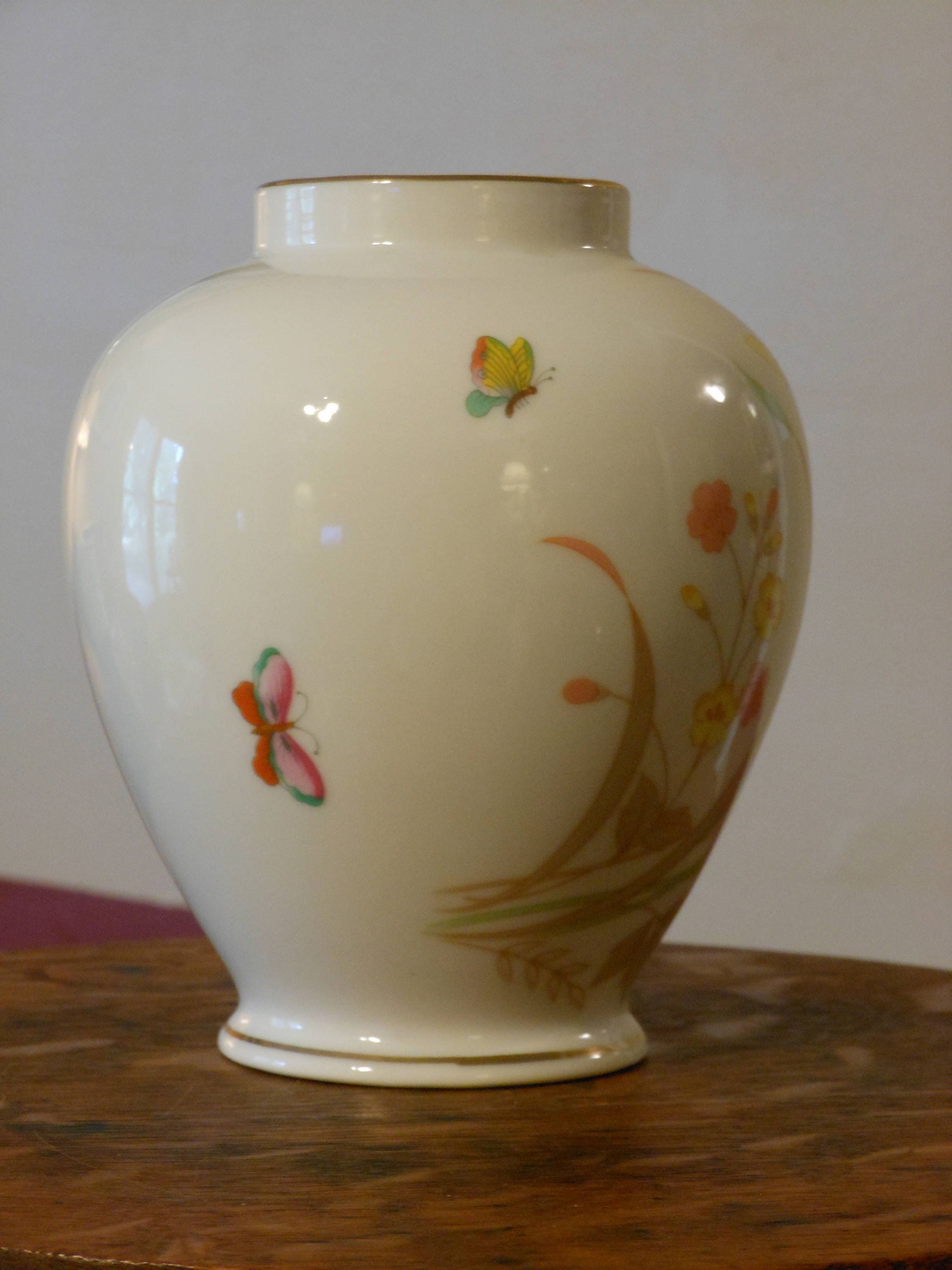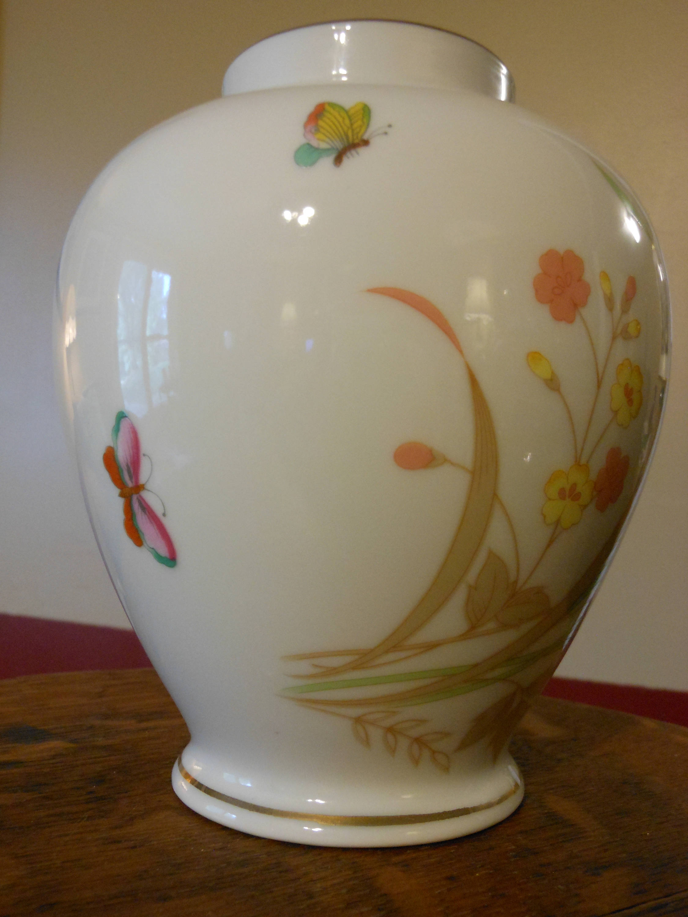 JGI Shaddy Mino China vase. Made in Japan. Excellent condition. Gold accents on rim and base. Flowers and butterflies pattern. Stands 6 inches tall. Rim is 2.5 inches around and base is 3 inches around. Weighs 15 ounces.
