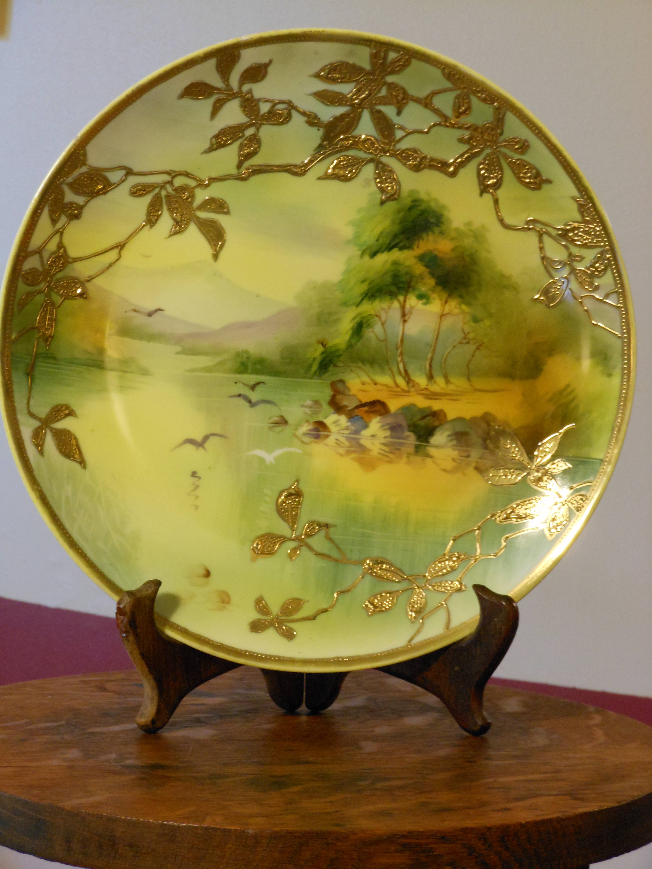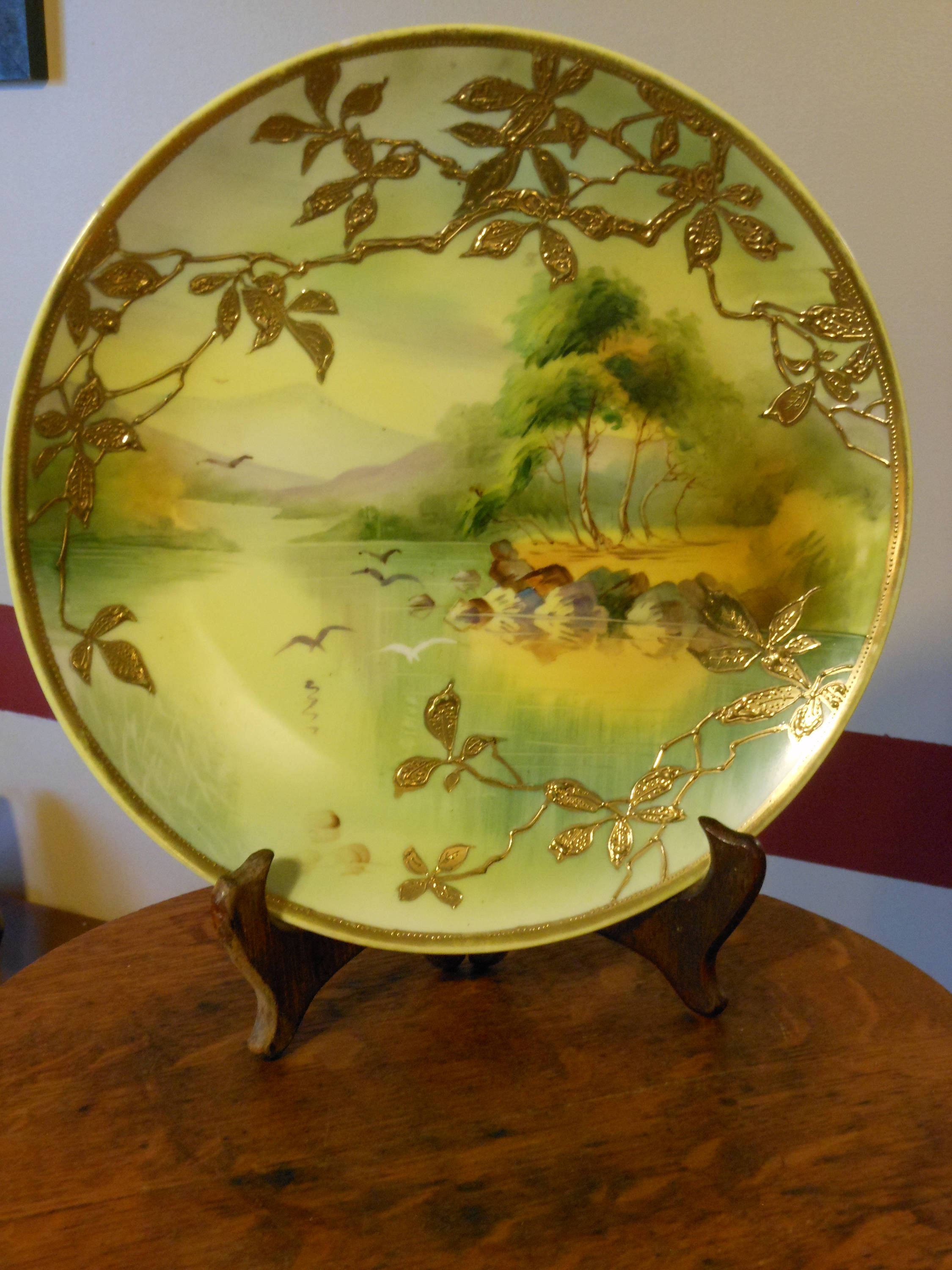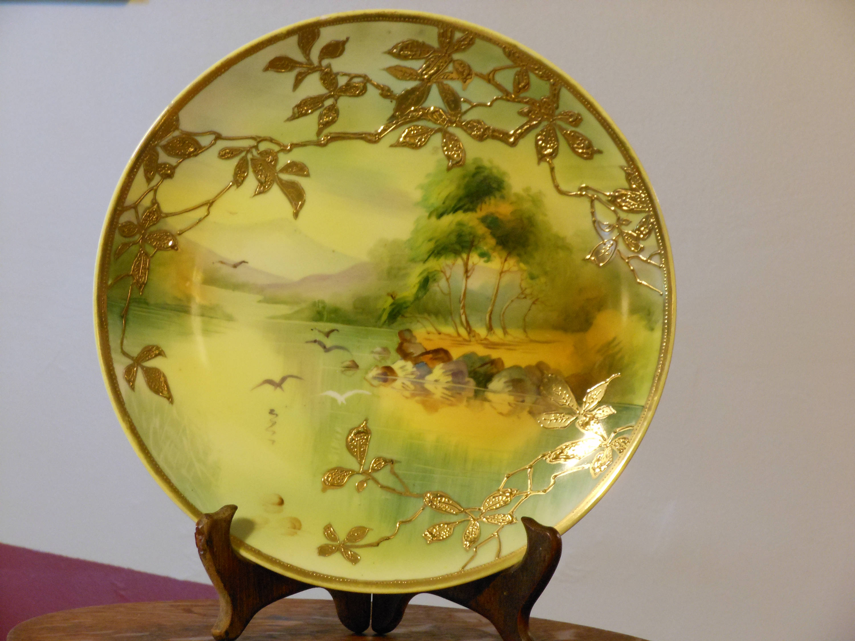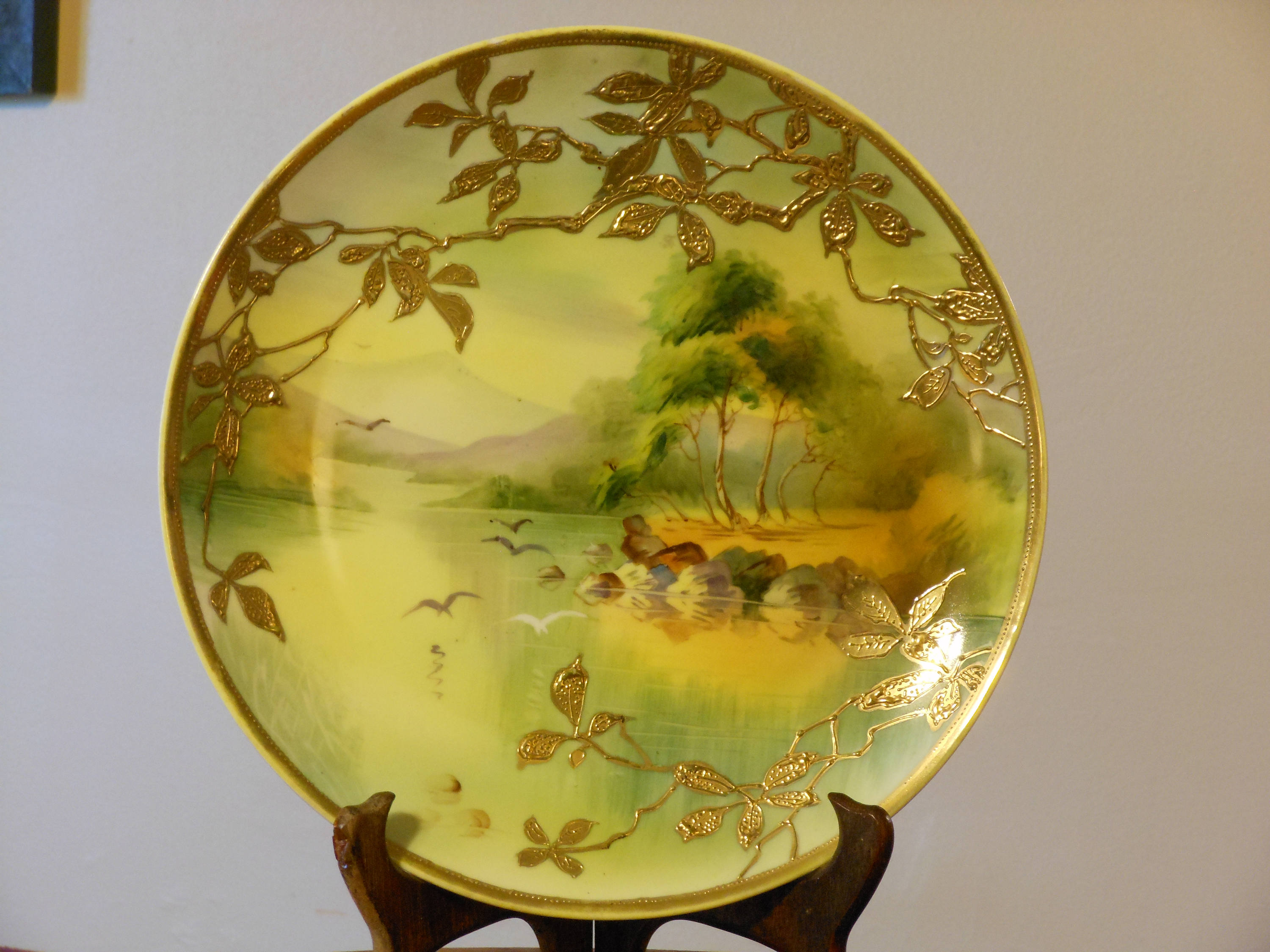 Gold leaf gilt, gold bead around the edge. Nippon, hand painted. Condition issue: very slight paint wearing on the edge, outside rim feels rough to the touch in some places. This plate can be hung on the wall. The plate measures 10 inches around. This plate weighs 1 pound, 5 ounces.