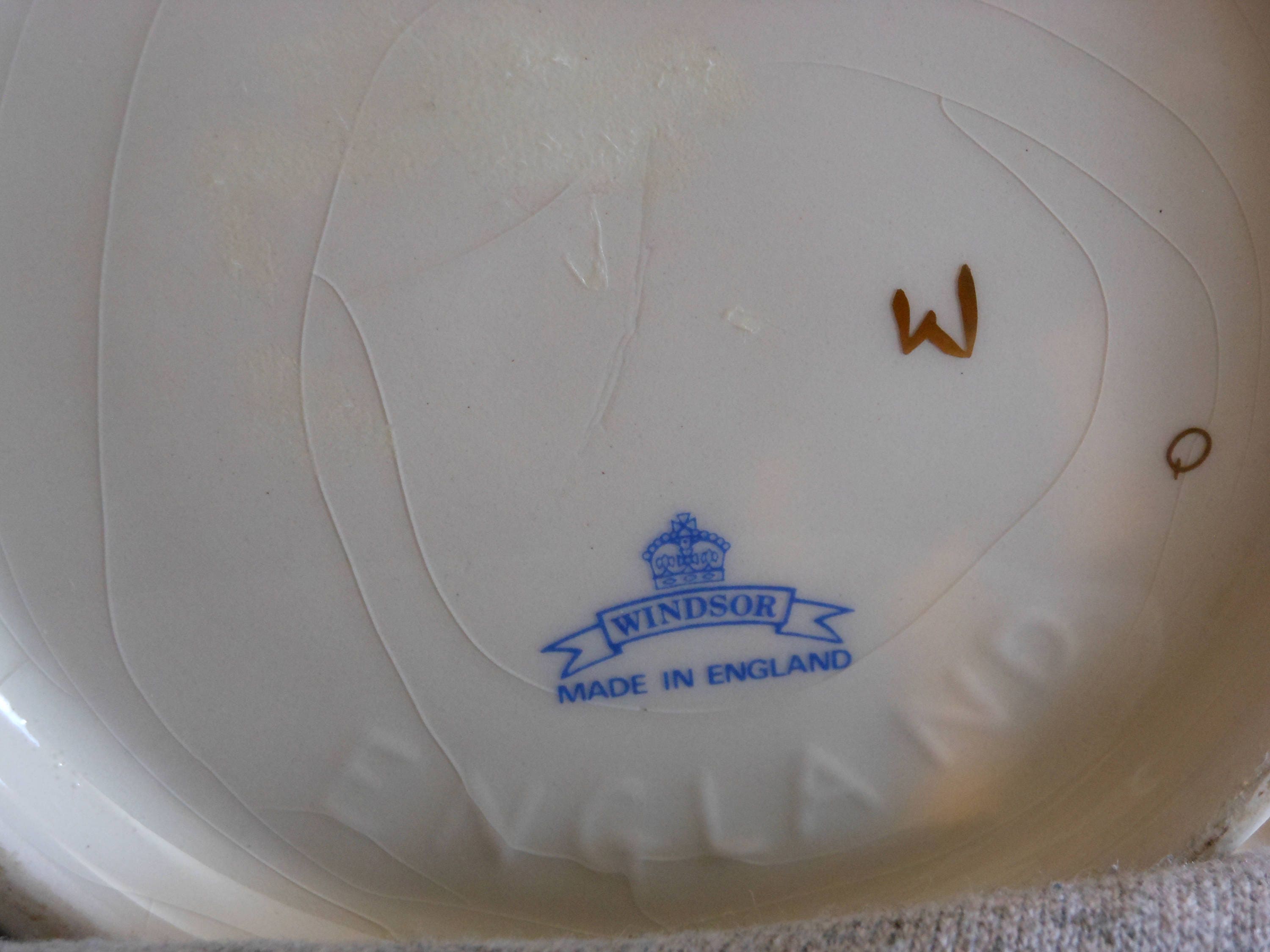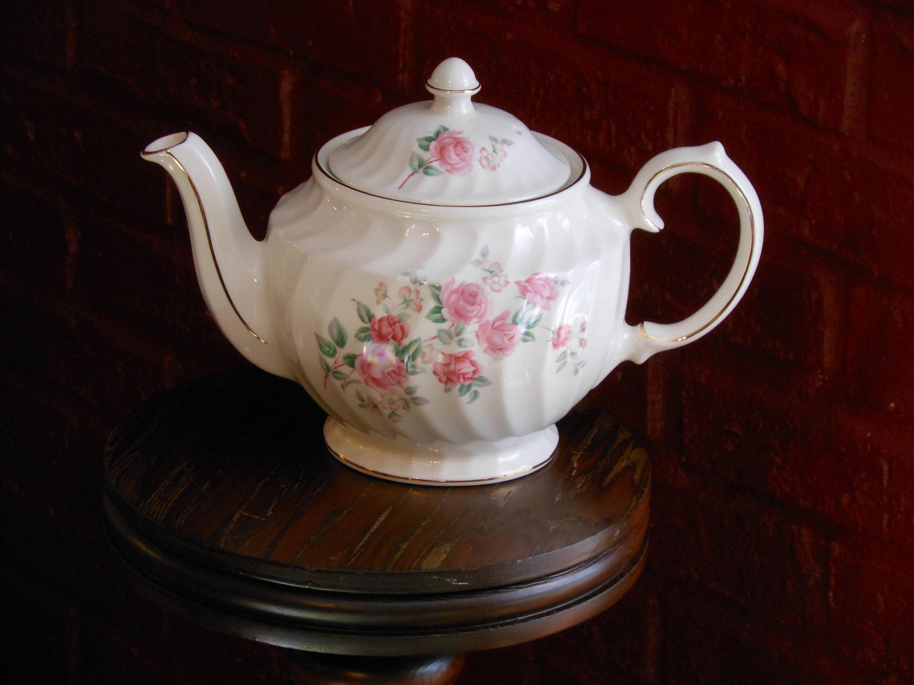 White porcelain teapot, gold accents. Pink roses. Image appears on both sides and lid. Stands 7 inches high and measures 10 inches wide. Excellent condition. Windsor teapot, made in England. Holds 4 cups. Suitable as a gift. This teapot weighs 1 pound, 14 ounces.