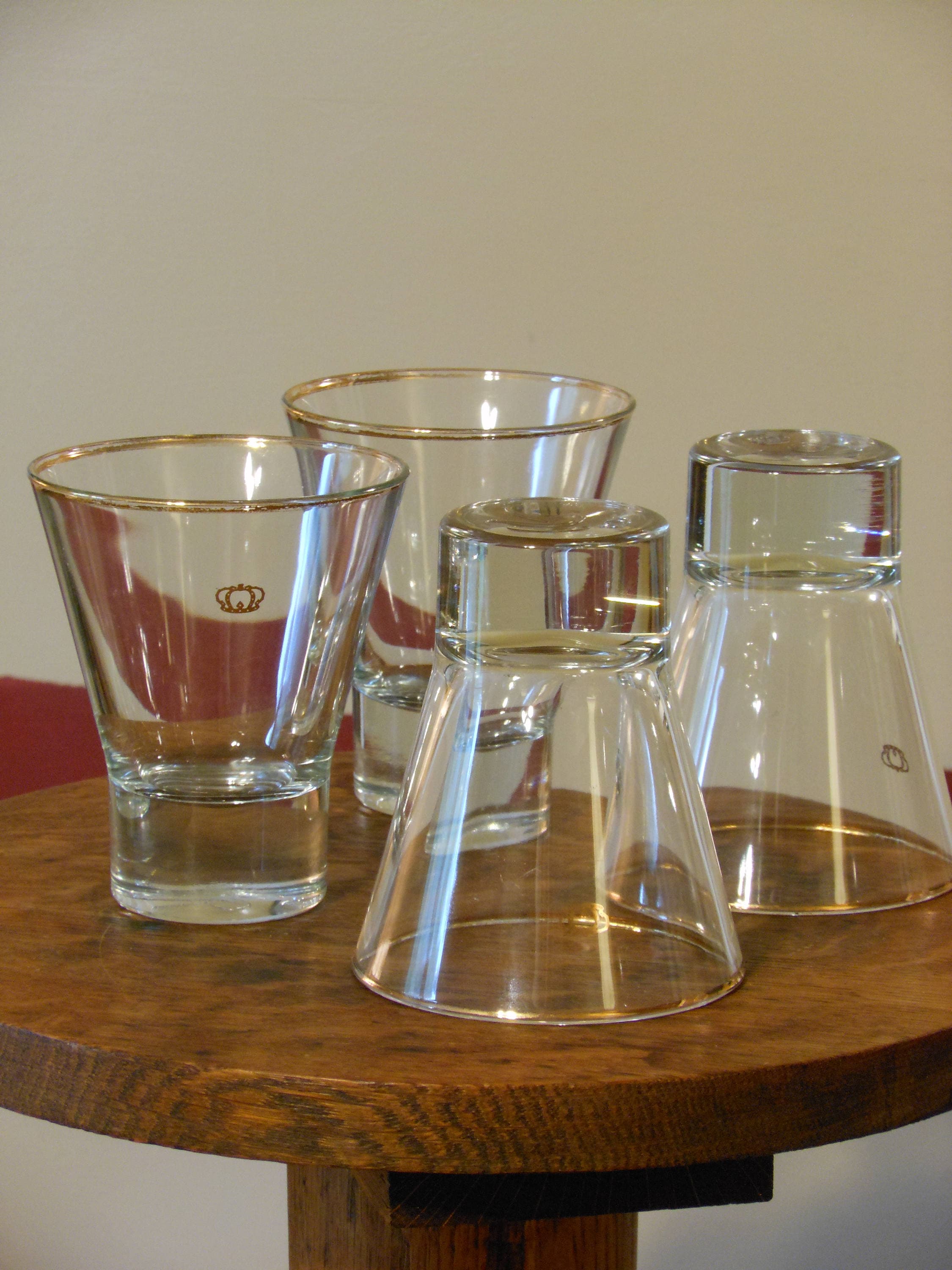 Set of 4 Crown Royal rocks glasses. Gold crown insignia on the glass. Embossed Crown Royal initials and crown insignia on the glass bottom. These are vintage--gold rims are slightly faded. Each glass holds 6 fluid ounces. These glasses weigh a combined 2 pounds, 6 ounces.