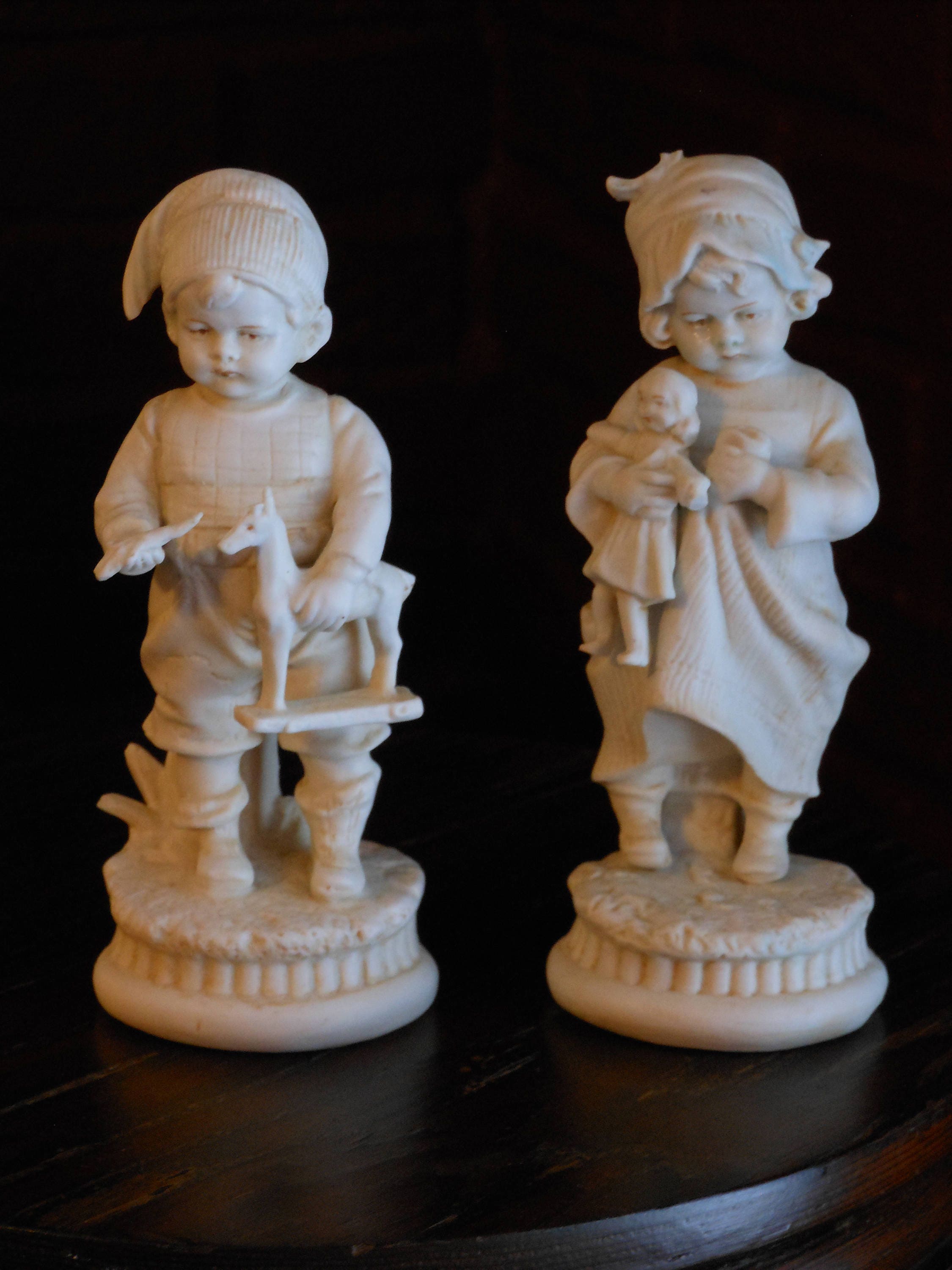 Boy and girl Victorian-era figurines. Vintage. Excellent condition, great detail. All white, no labels for manufacturer or country of origin. These stand 5 inches tall on a base of 2 inches around. Suitable as a gift. These figurines weigh a combined 5 ounces.