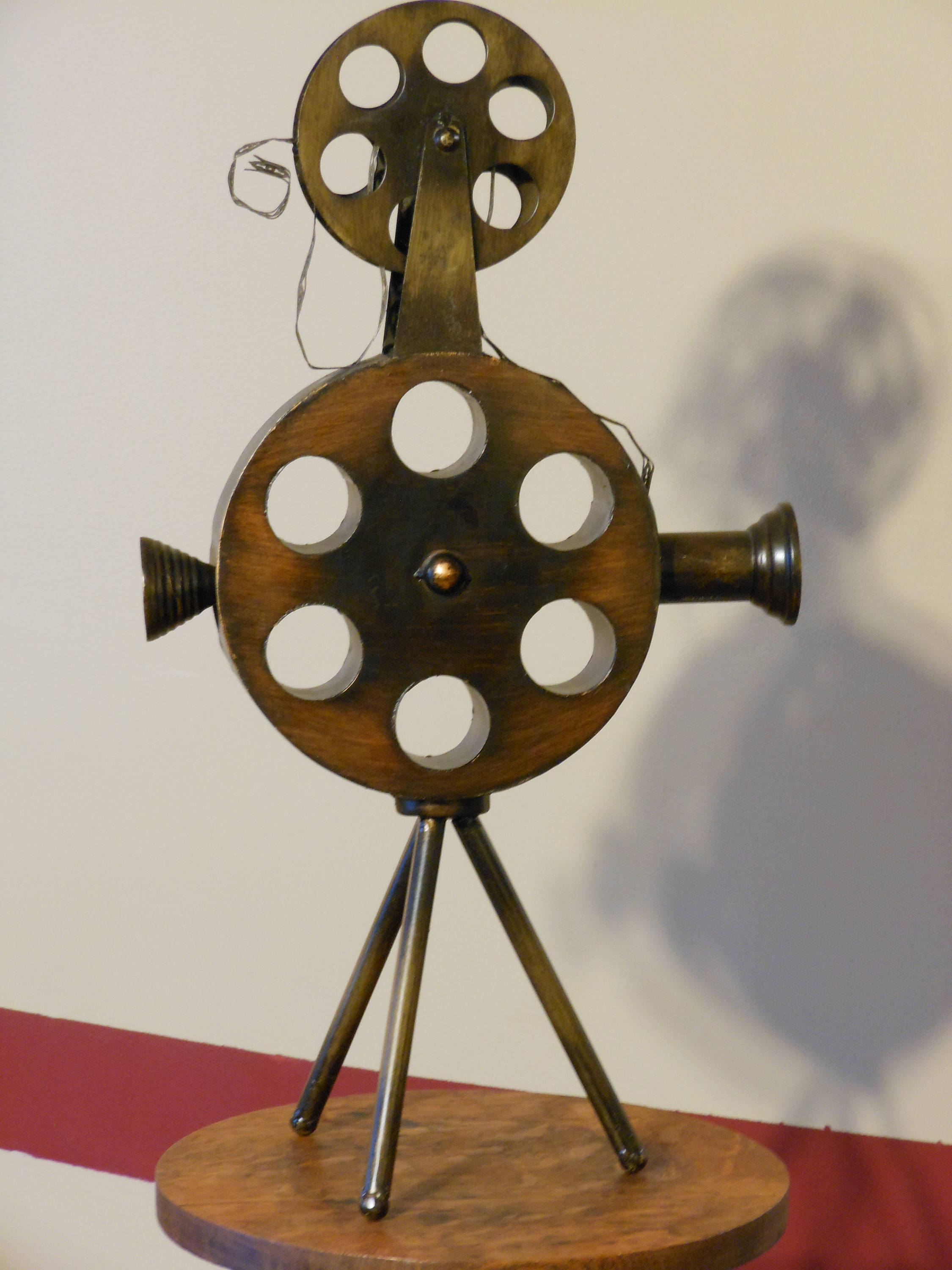 Striking metal artwork piece. Three-legged camera. All metal, even the "film". Stands 22 inches tall, 12 inches wide and 6 inches in depth. If you know someone into cameras, cinematography, Hollywood, films, etc. Would make a nice accent piece for a room decorated in movie posters or film memorabilia. This piece weighs 2 pounds, 3 ounces.