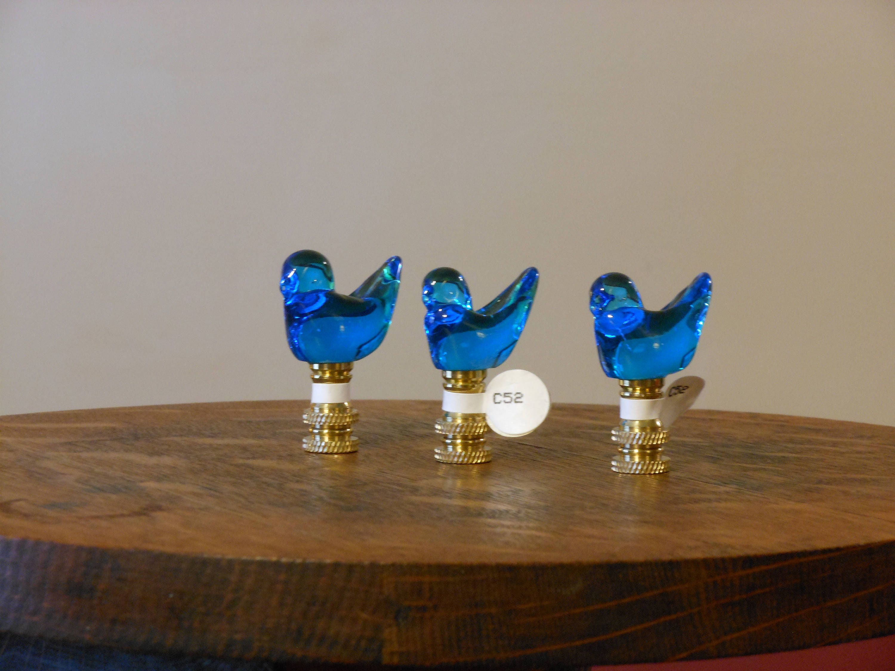 Three blue bird lamp finials. Acrylic. Fits any lamp. These measure about 2 inches high and 2 inches wide. They weigh a combined 3 ounces.