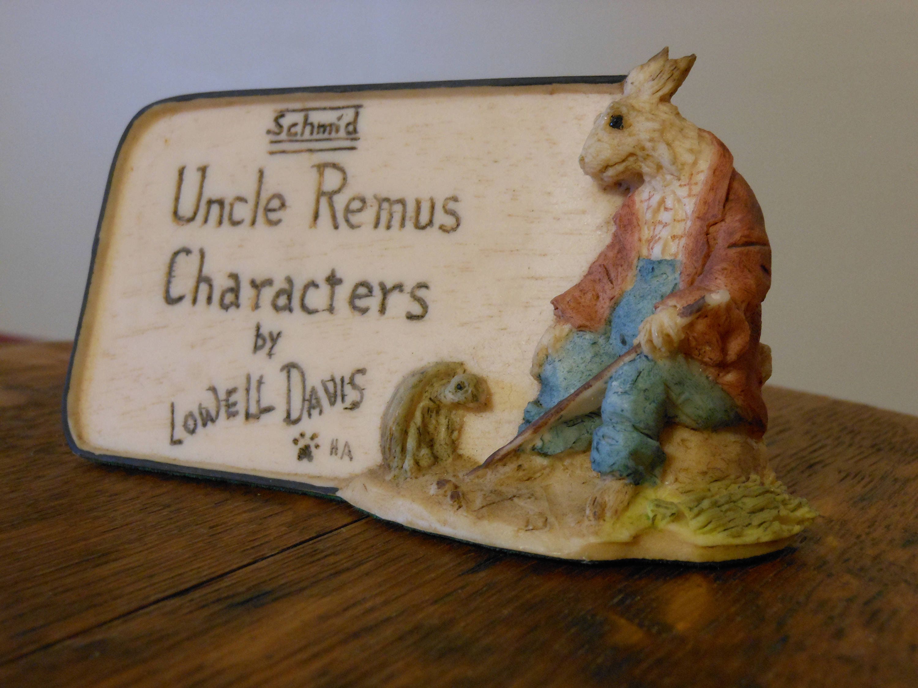 A rare collection of Uncle Remus characters by Lowell Davis. Made by Schmid in Scotland. The Brer Rabbit stories, taken from African-American folklore, were collected by Joel Chandler Harris, a journalist and folklorist, who was born in Georgia in 1848 and died in Georgia in 1908. Harris created the character of Uncle Remus, an older black man who was a teller of stories. Brer Rabbit and the other critters, such as Brer Fox, Brer Bear, Brer Wolf, Brer Coyote and Brer Weasel populated these stories aimed at children. Walt Disney's 1946 film, Song of the South, was based directly on characters taken from Uncle Remus and the Brer stories. In this collection, which is in excellent, near mint condition, all of the critters in the Brer stories are represented. These figurines vary in height and width, depending on the character. A sign reading "Schmid Uncle Remus characters by Lowell Davis" is included. Total weight is 3 pounds, 4 ounces.