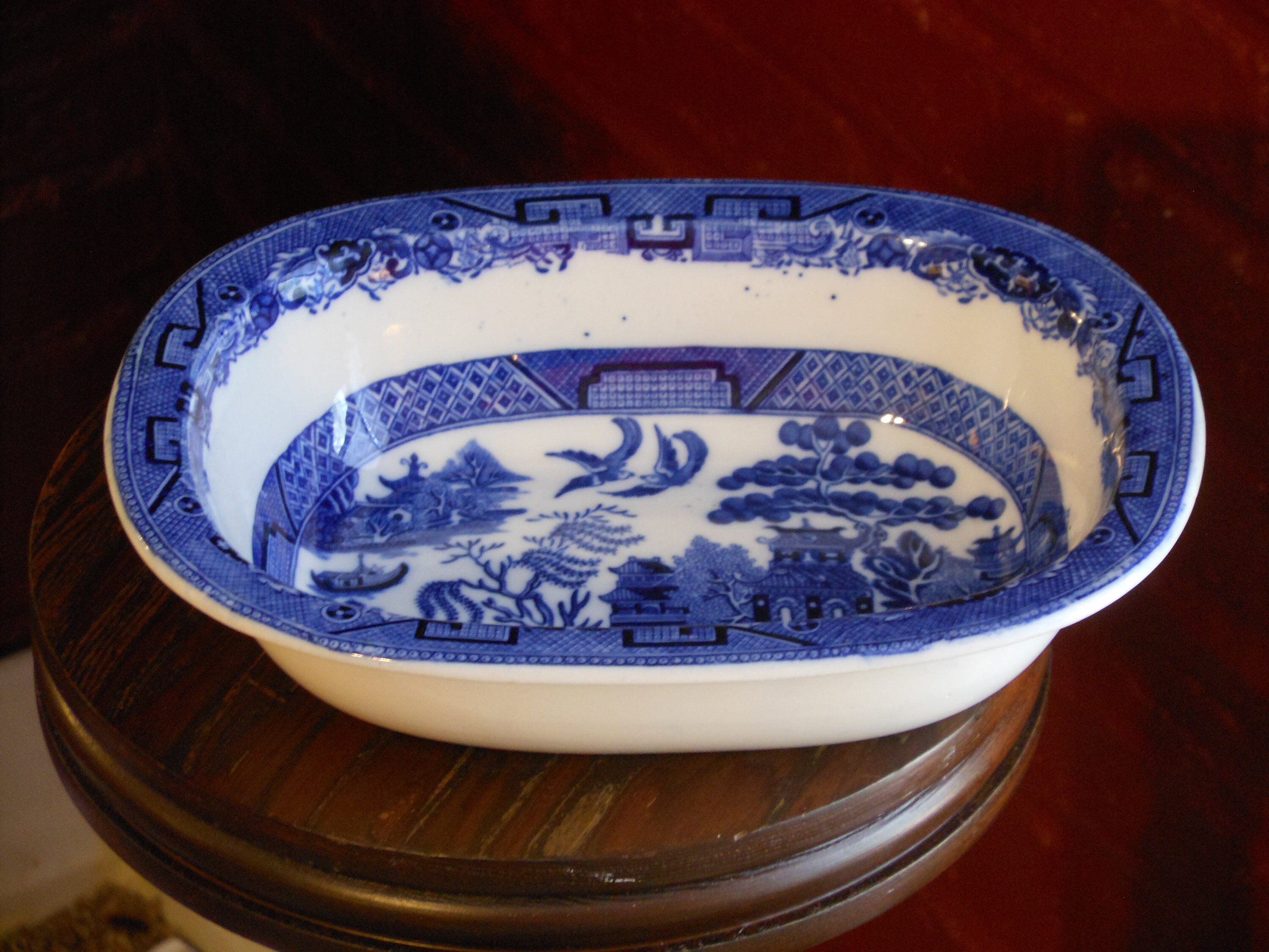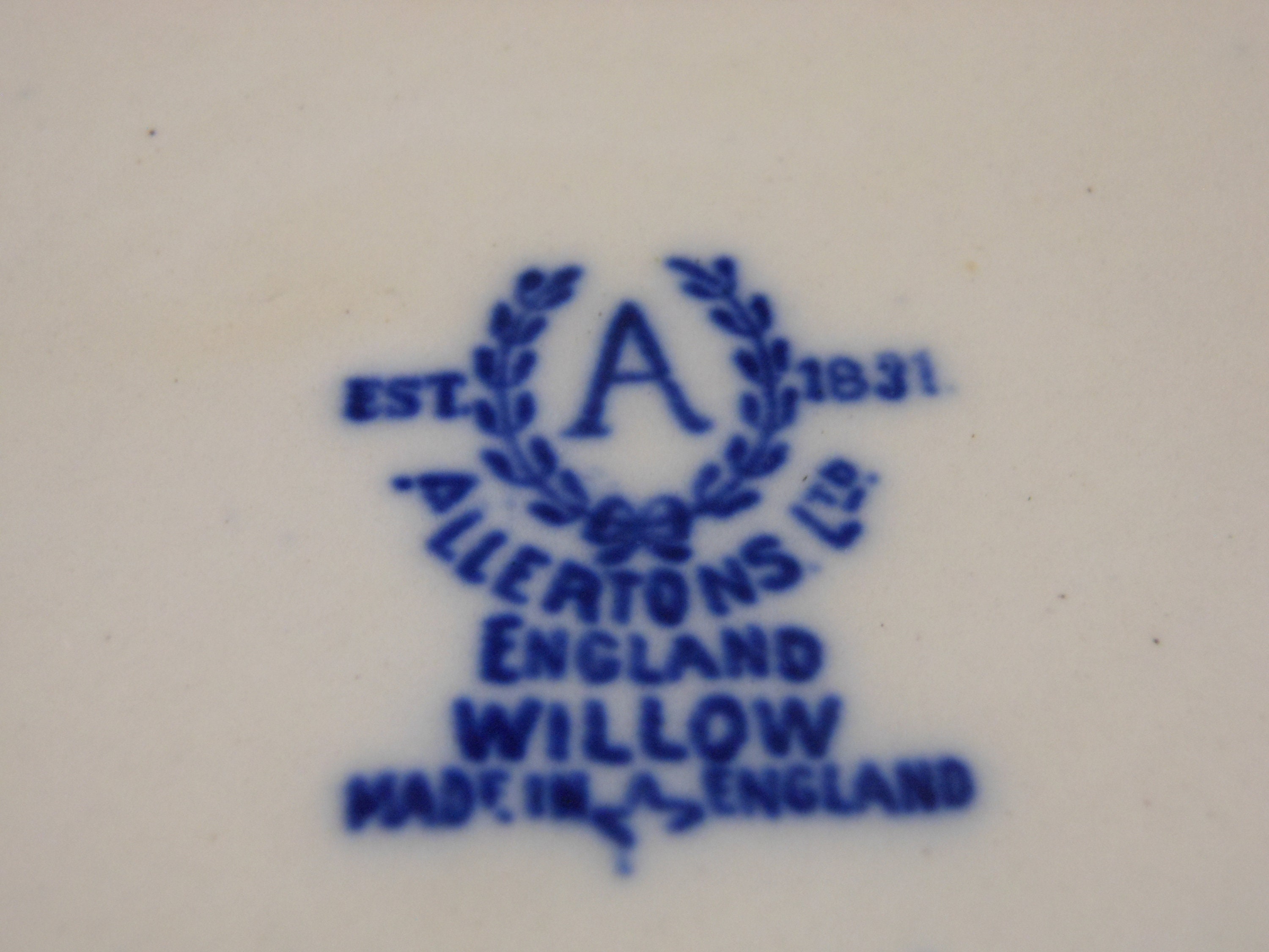 Vintage Allerton's Willow pattern serving bowl. Made in England. Measures 9 inches long, 7 inches wide and 2 inches deep. Weighs 1 pound, 4 ounces. Excellent condition. Suitable as a gift.