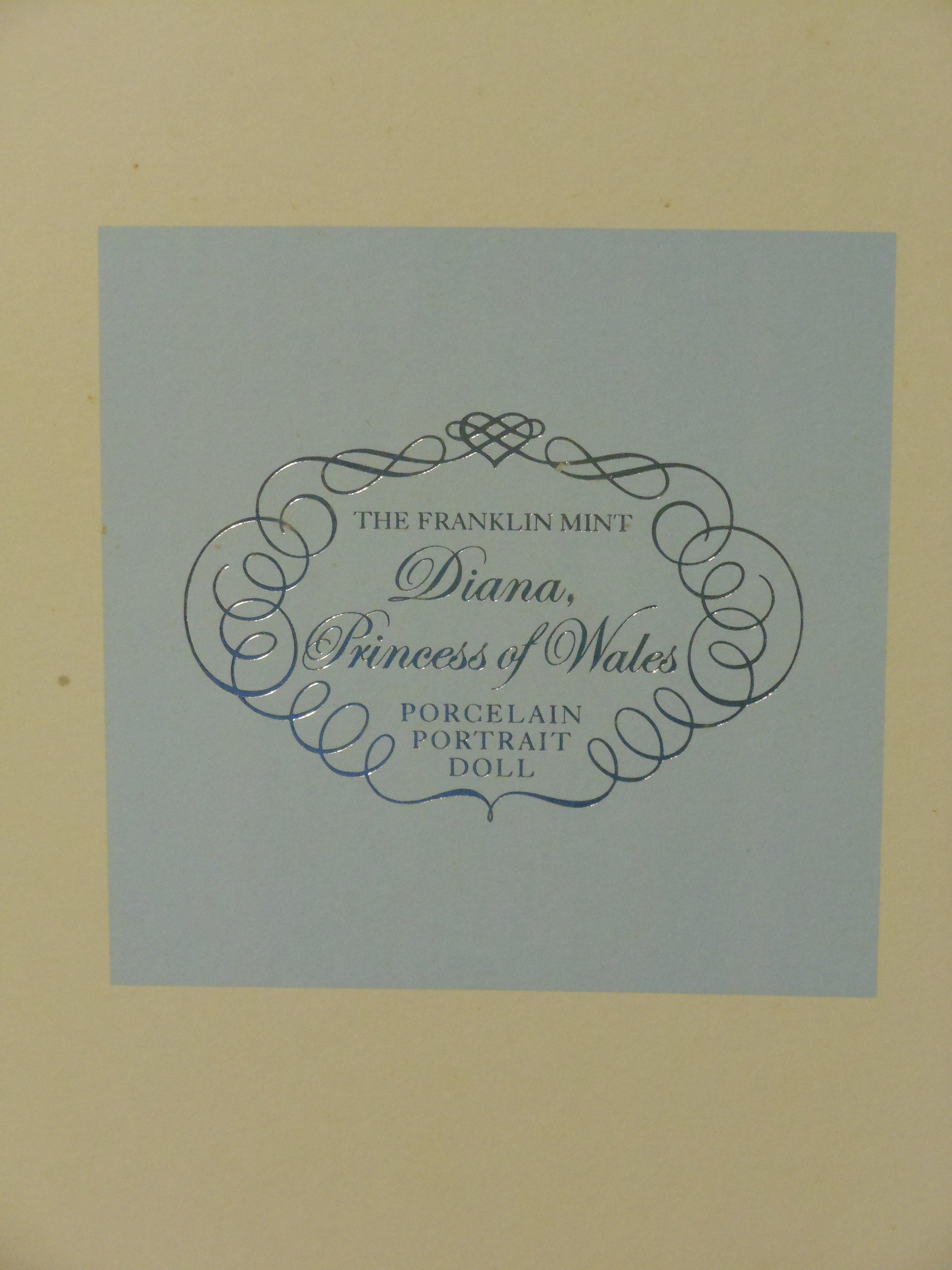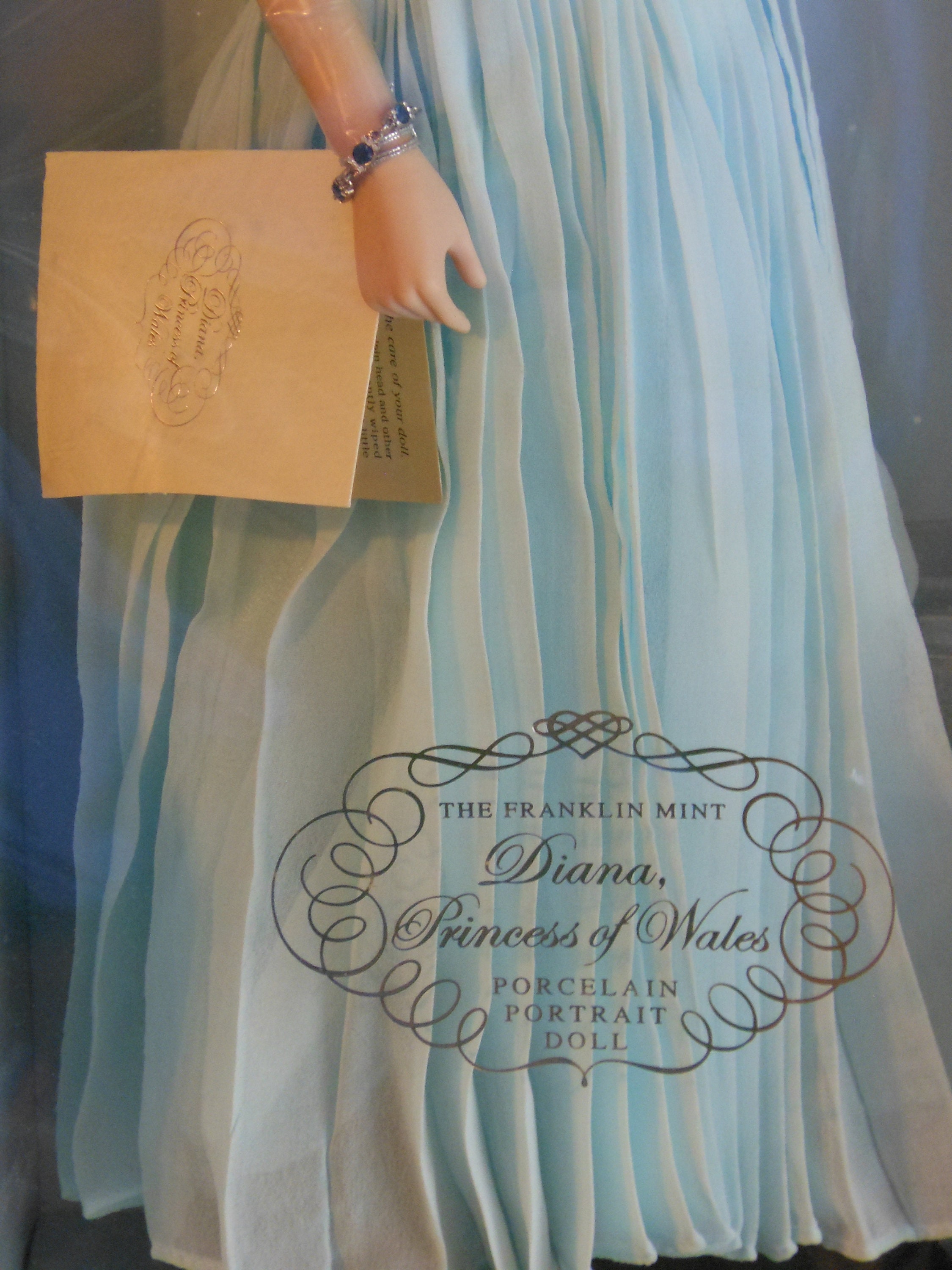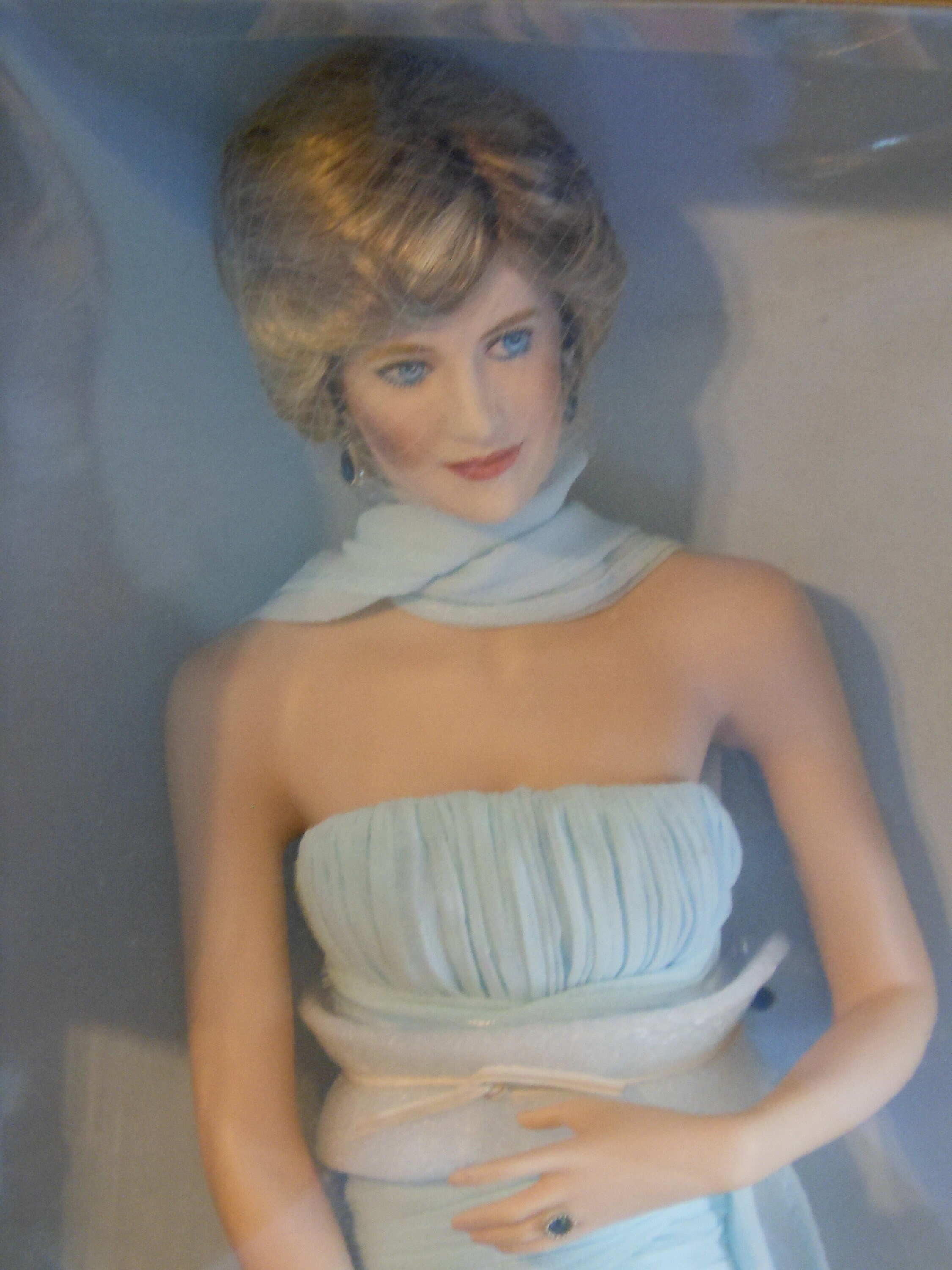 Franklin Mint Diana, Princess of Wales, Porcelain Portrait Doll. New in box and never removed. The tag and all the ties and plastic are intact. Her purse is still in its separate container. Stands 17 inches high. Blue chiffon dress, off the shoulder, scarf, jewelry, veil over face. Box is in excellent condition, not dirty or torn. Plastic case is not dented or ripped. Ideal condition. Box measures about 21 inches high, 9 inches wide and 6.5 inches deep. In total, with the box, this weighs 3 pounds, 13 ounces. Doll was not removed for photographs.