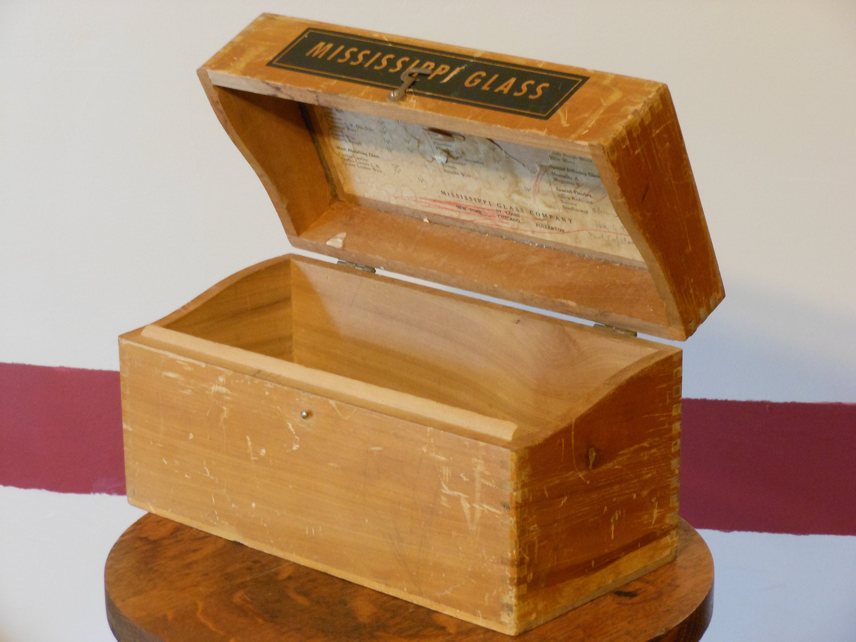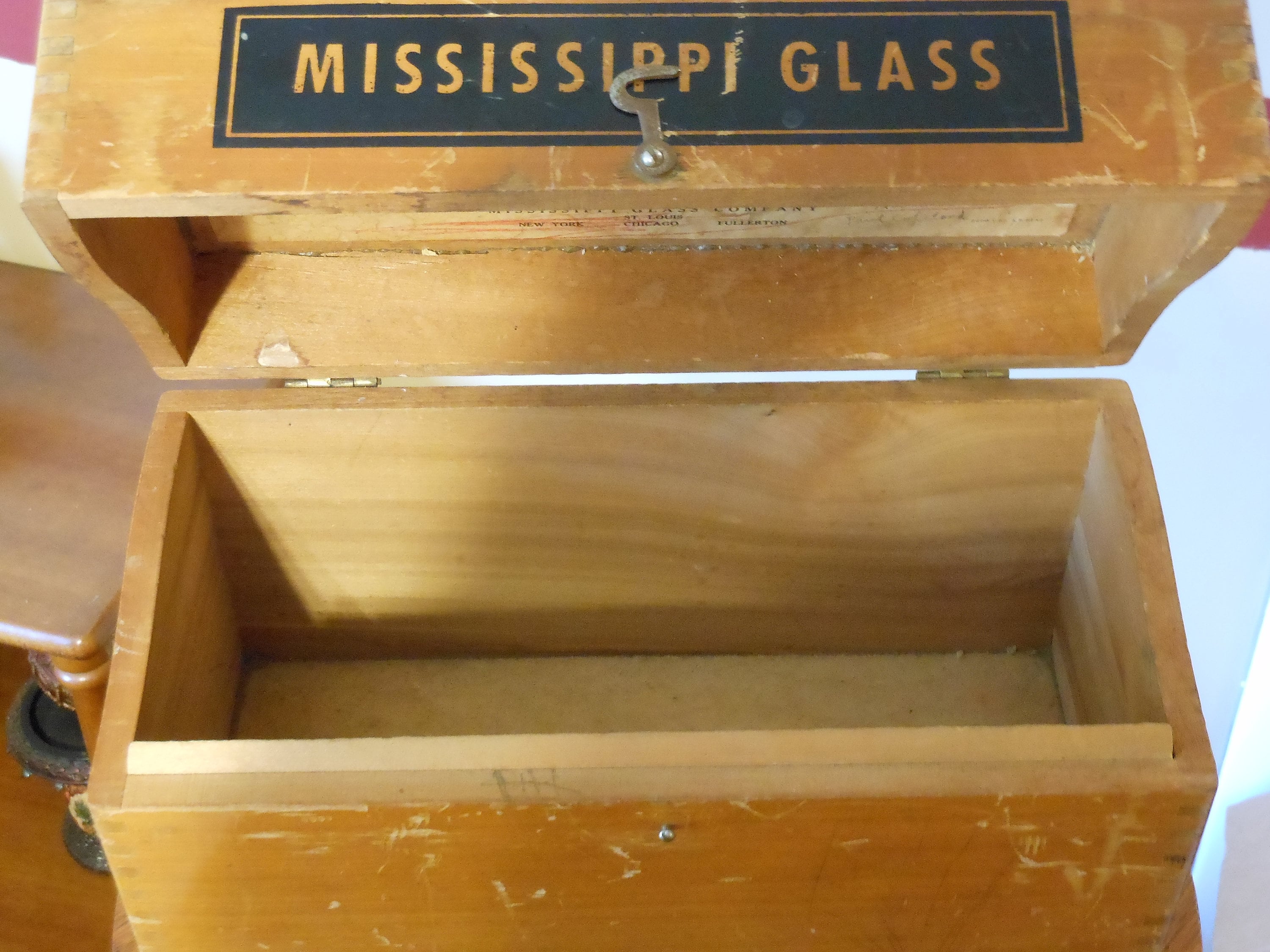 This is an old wooden sample box from Mississippi Glass. Dovetail corners, metal hook latch. Lettering in good shape. Box has a lot of scratches. Metal hinges work fine. This is 10 inches long, 5 inches deep and 6 inches tall. A vintage wooden sample box. Weighs 1 pound, 14 ounces.
