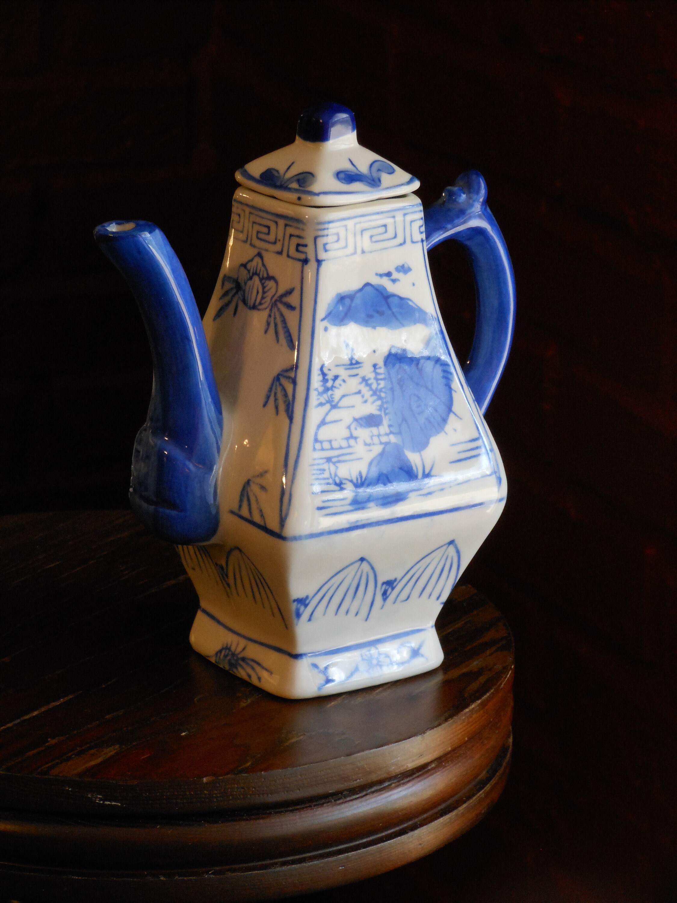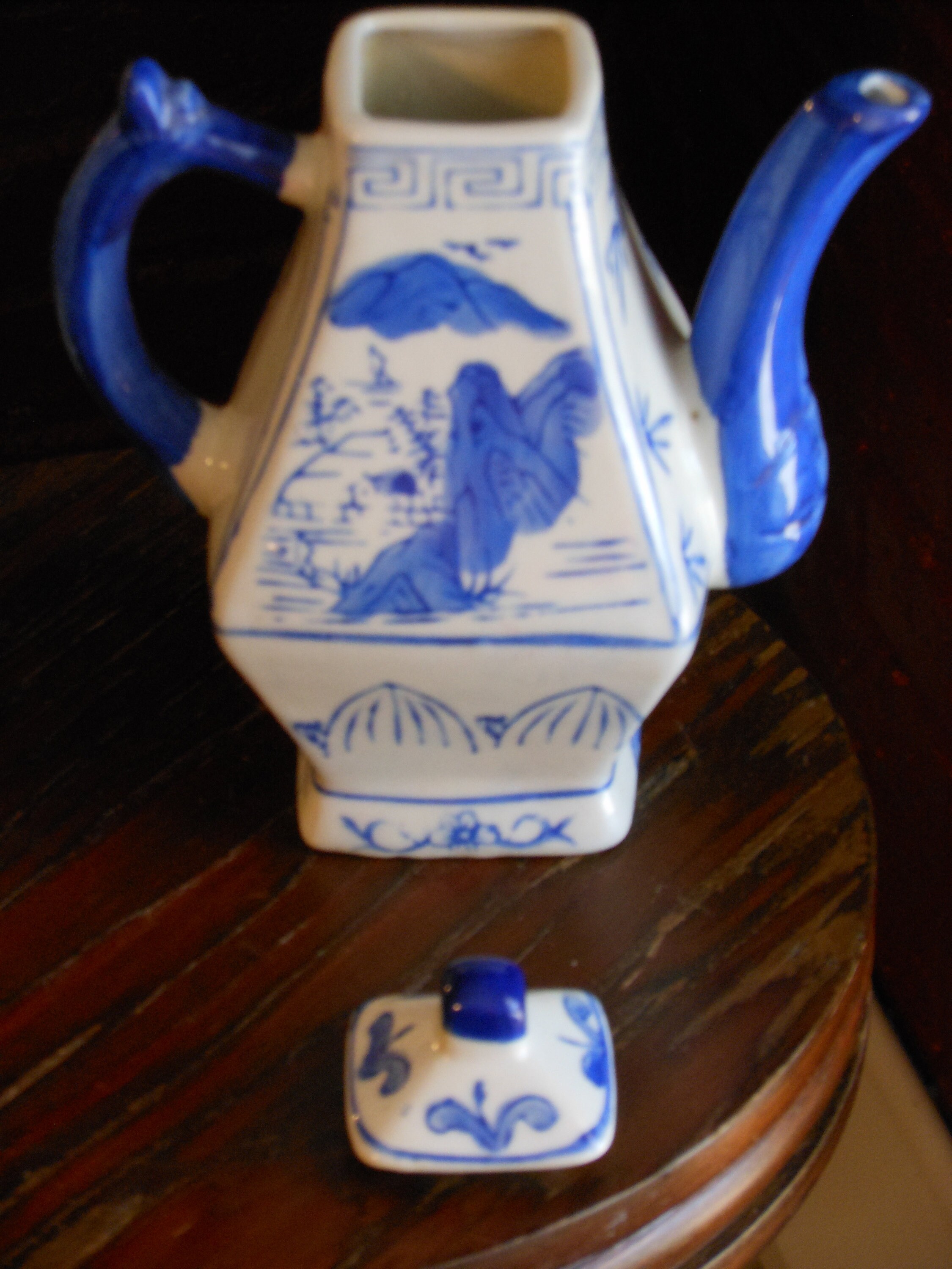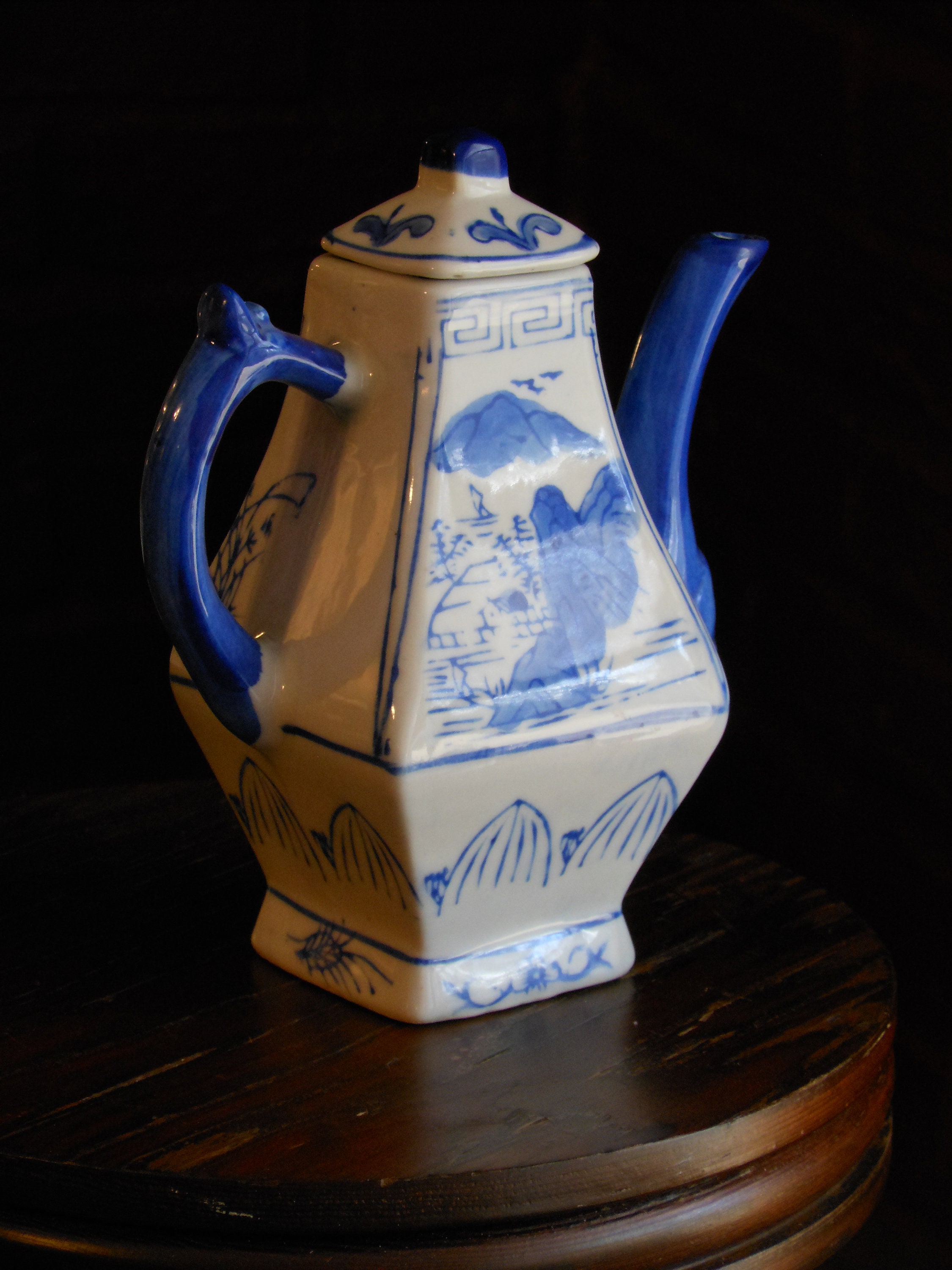 For decorative purposes only, this tea pot was made in China and stands 6.5 inches high with its lid on and is about 5 inches at its widest point. Excellent condition. Suitable as a gift. No chips or cracks. Weighs 13 ounces.