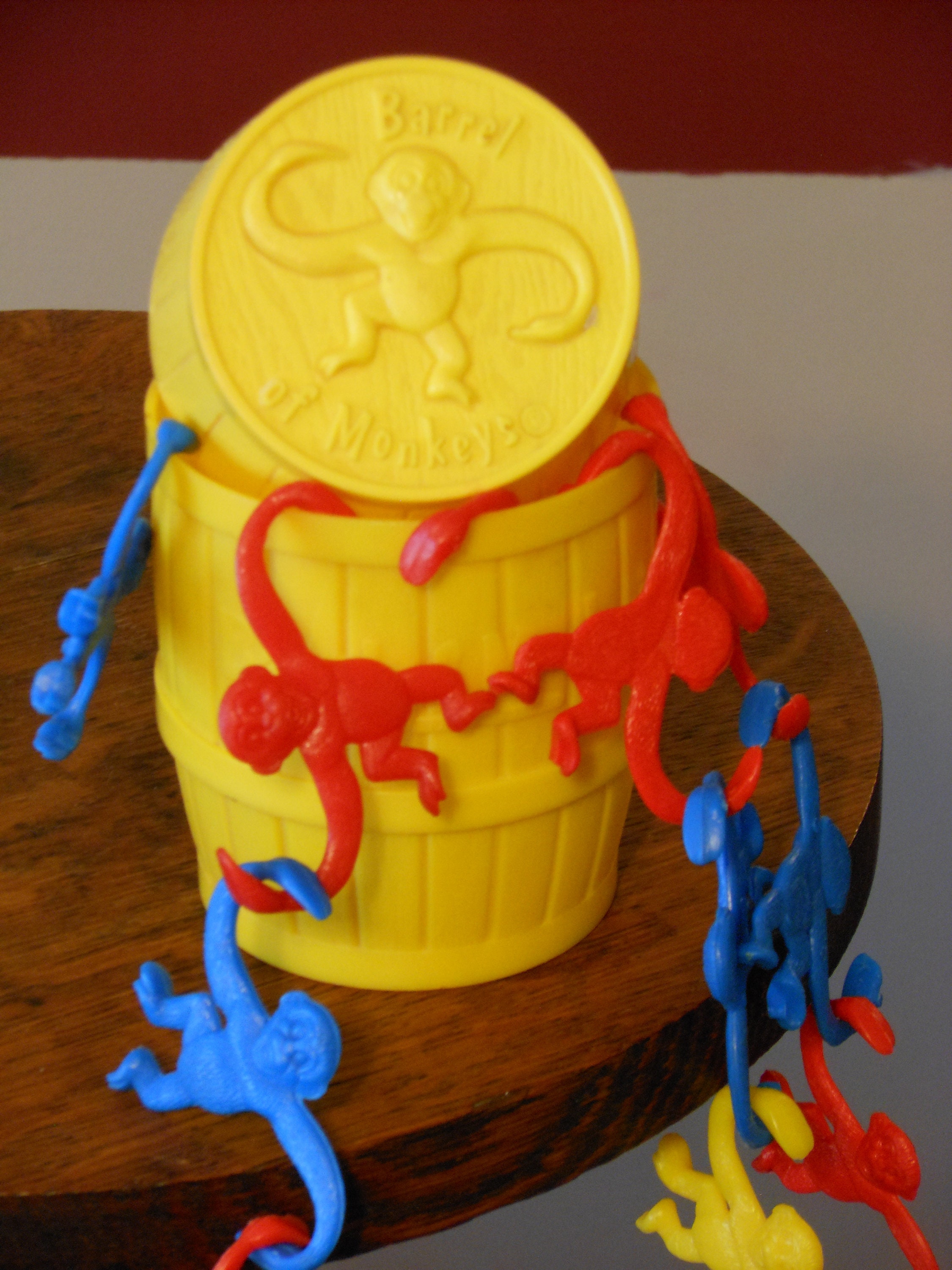 This is the classic Barrel of Monkeys game from the 1960 era. Plastic barrel with lid, 13 blue, red and yellow monkeys. Excellent condition. Great for developing small motor skills and eye-hand coordination. From Lakeside Industries of Minneapolis, Minnesota. Barrel is 5 inches high and 2.5 inches around. Monkeys are 2.5 inches wide and about 2 inches high. This game weighs 3 ounces.
