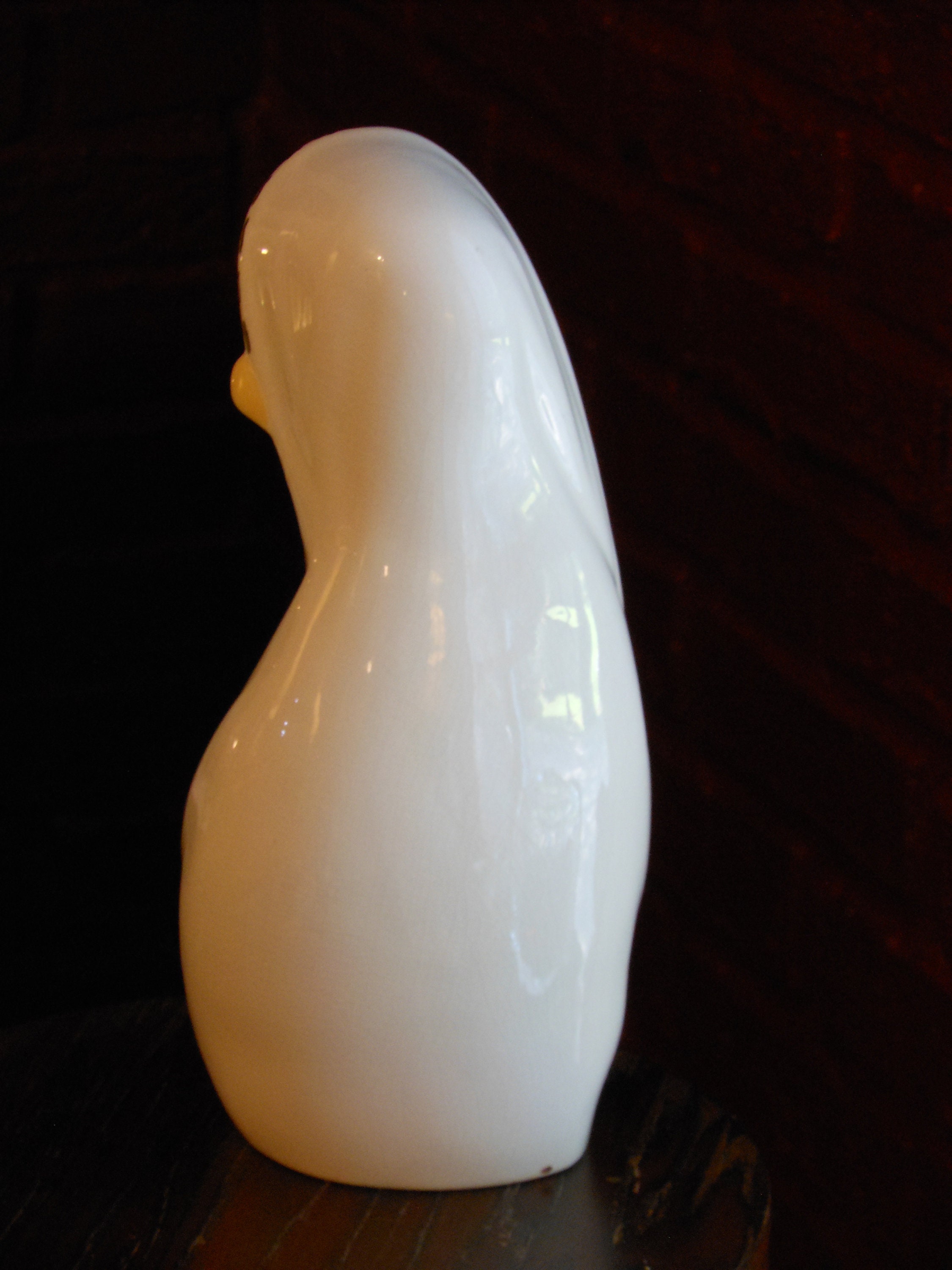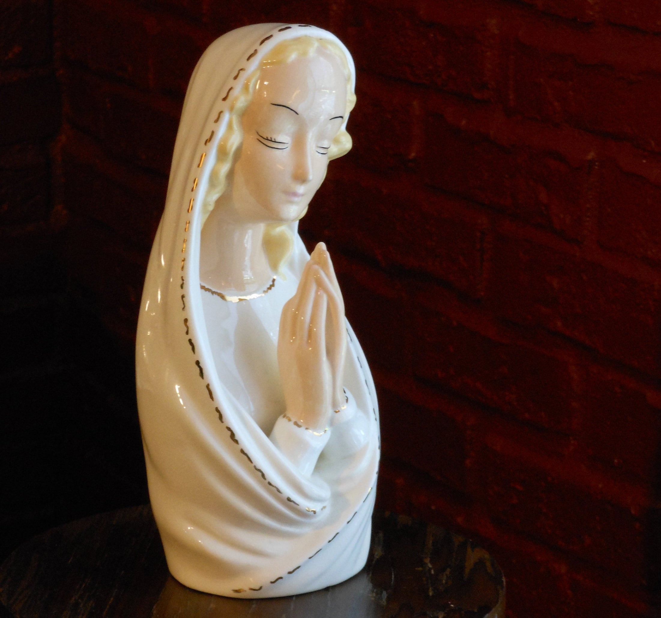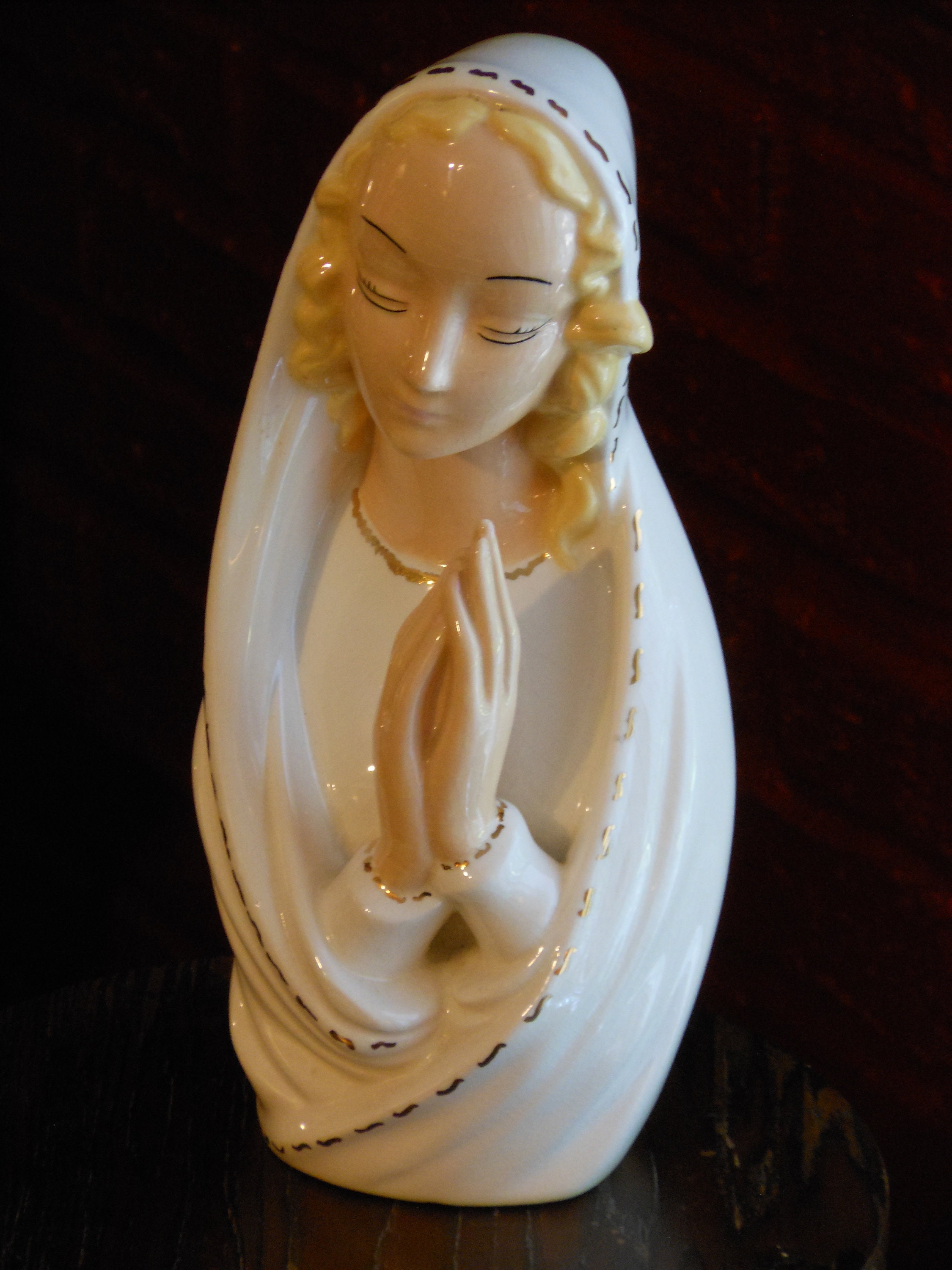 Perfect condition, striking oblong figure of blonde woman wrapped in white with gold trim. Stands 10 inches high and measures 4 inches wide. Suitable as a gift. This figure weighs 1 pound, 15 ounces.