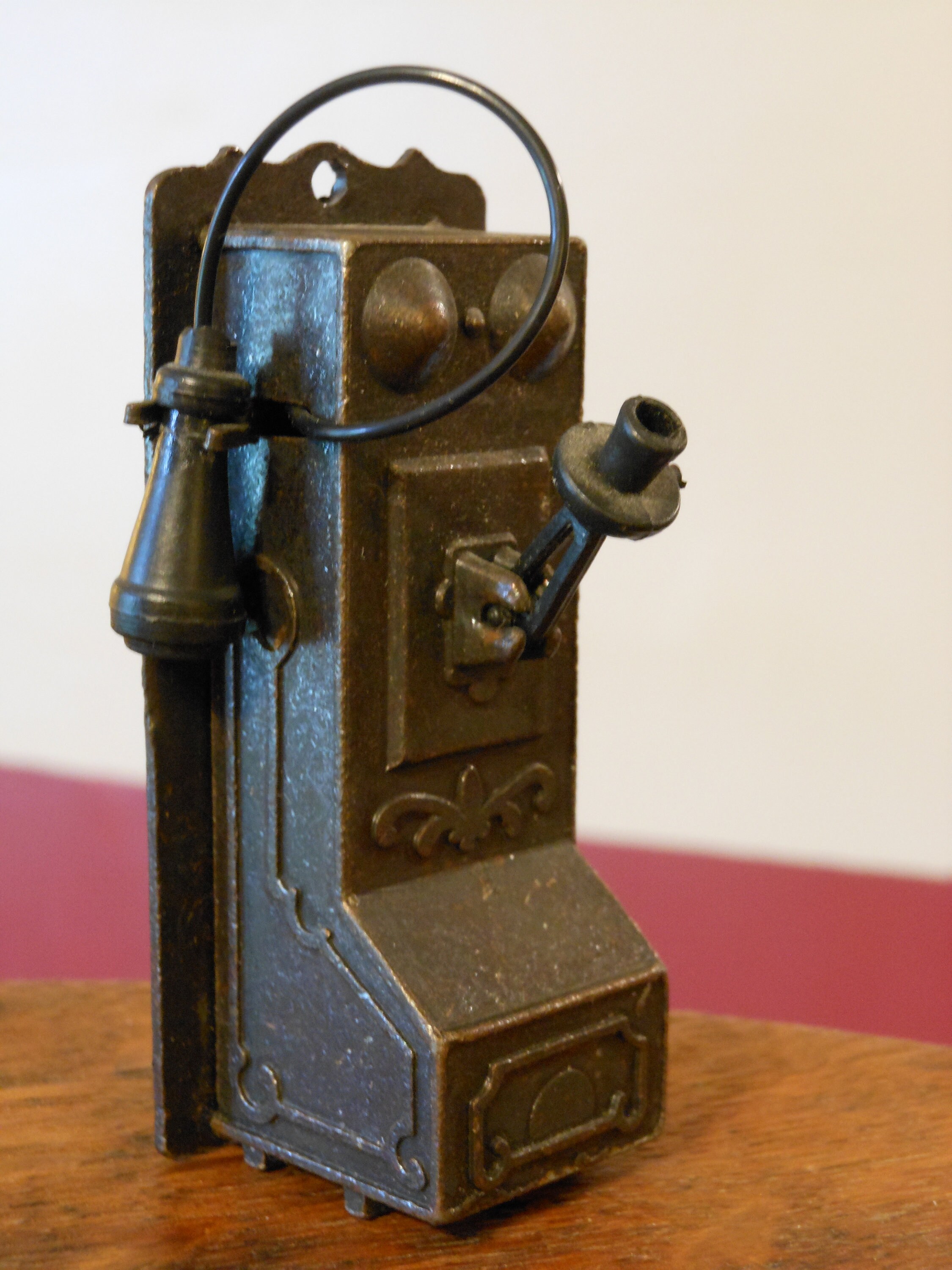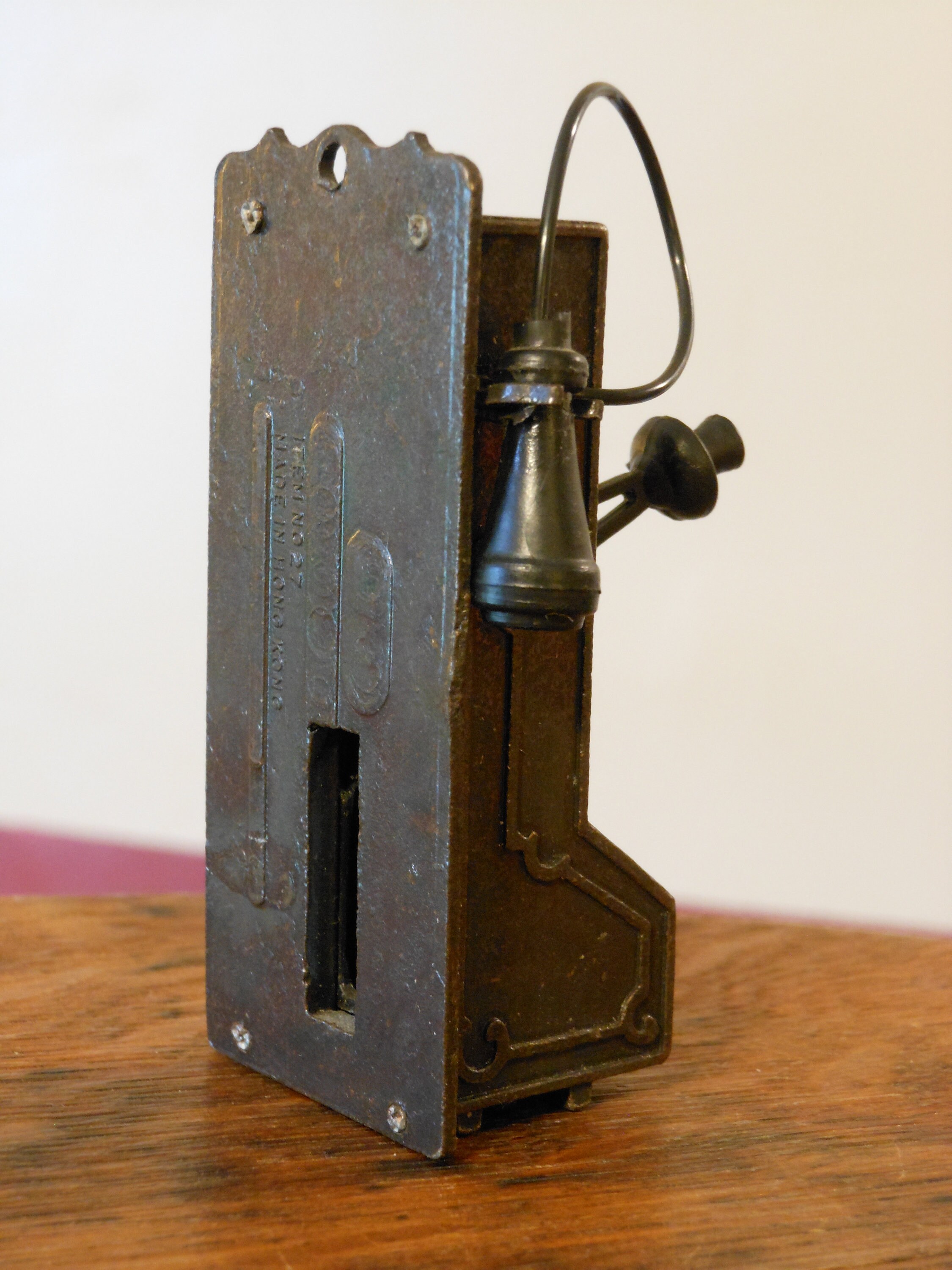 This box antique wall-mounted telephone is a pencil sharpener. Both the transmitter and receiver move. This piece stands 3 inches tall and is about 1.5 inches wide. This piece weighs 2 ounces.