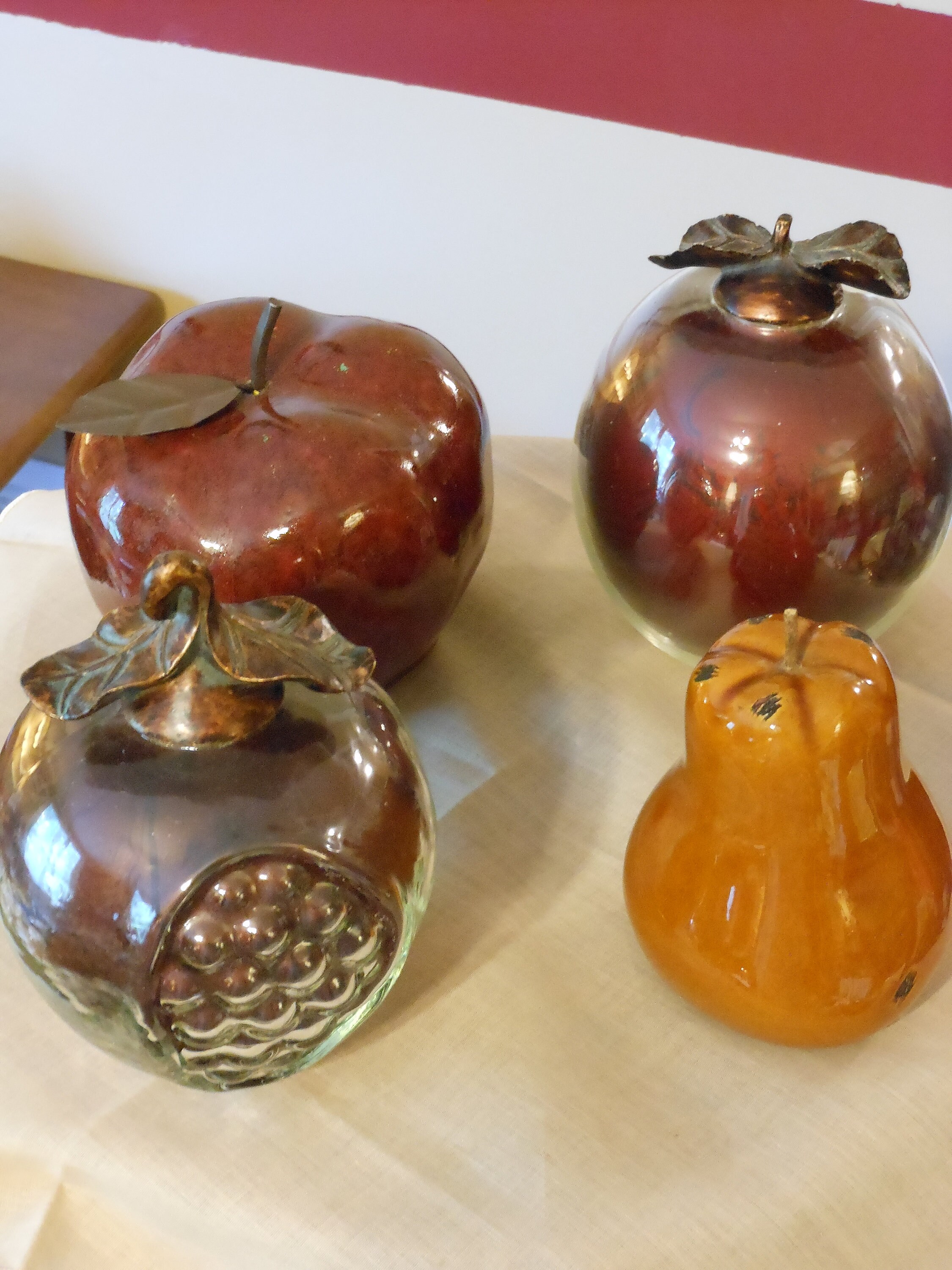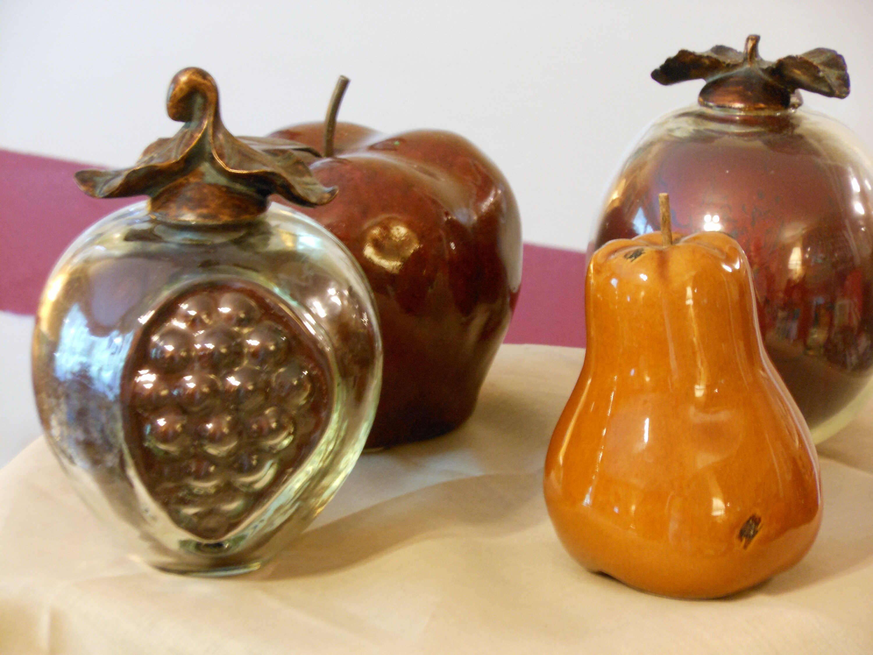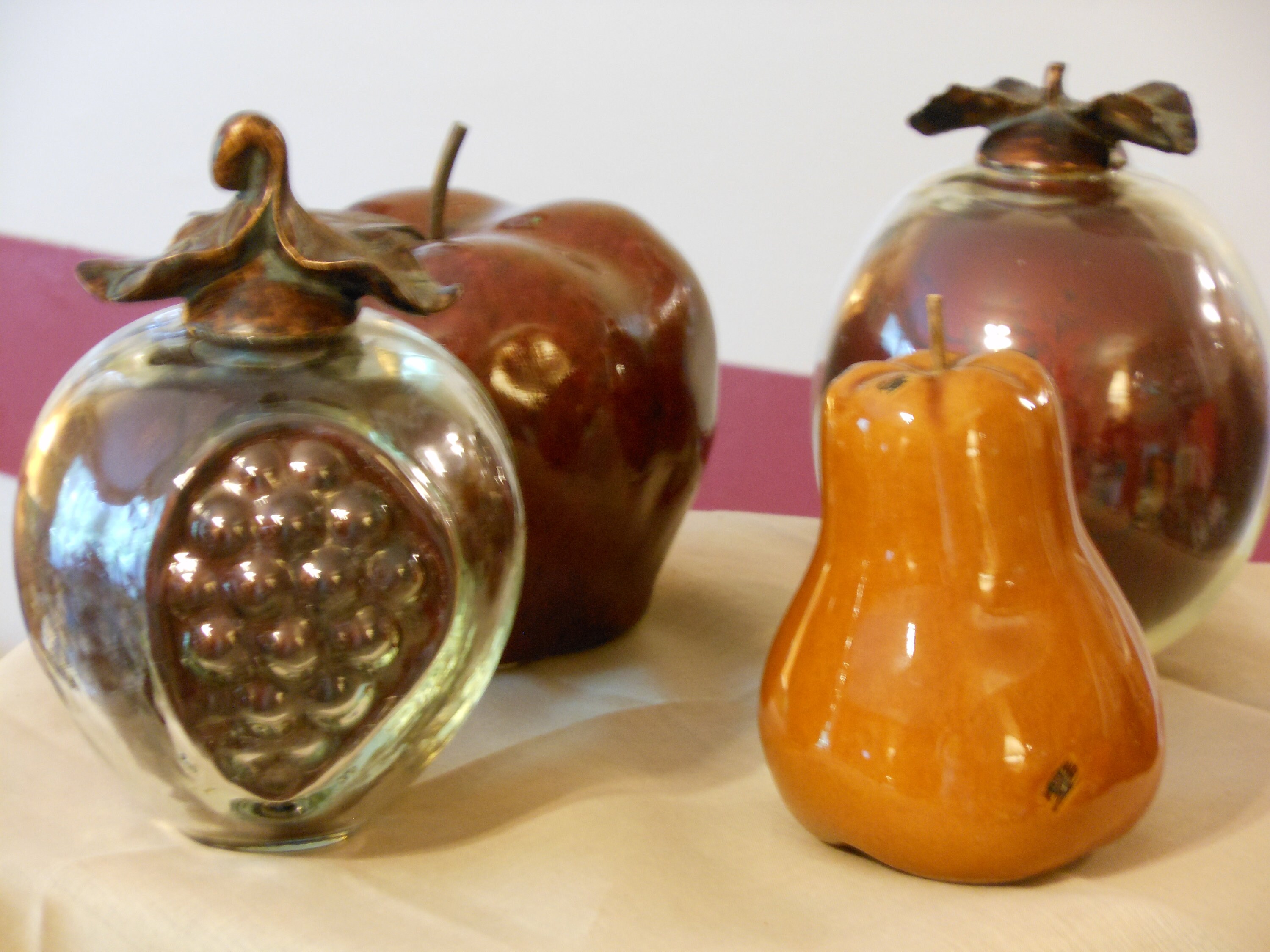 This is an assorted collection of decorative fruit pieces, all in excellent condition. Apple, pear, pomegranate, and a plum. The plum and the pomegranate are glass covered, hollow with metal stems. The pear is ceramic. The apple is also ceramic but with a metal stem. These would look great in a bowl, on a shelf or ledge, or just a tabletop. A cool, rich look, decorative fruit. These are 5-6 inches tall and each about 4 inches wide. Would look great on a fireplace mantle or the fireplace hod. These pieces weigh a combined 2 pounds, 6 ounces.