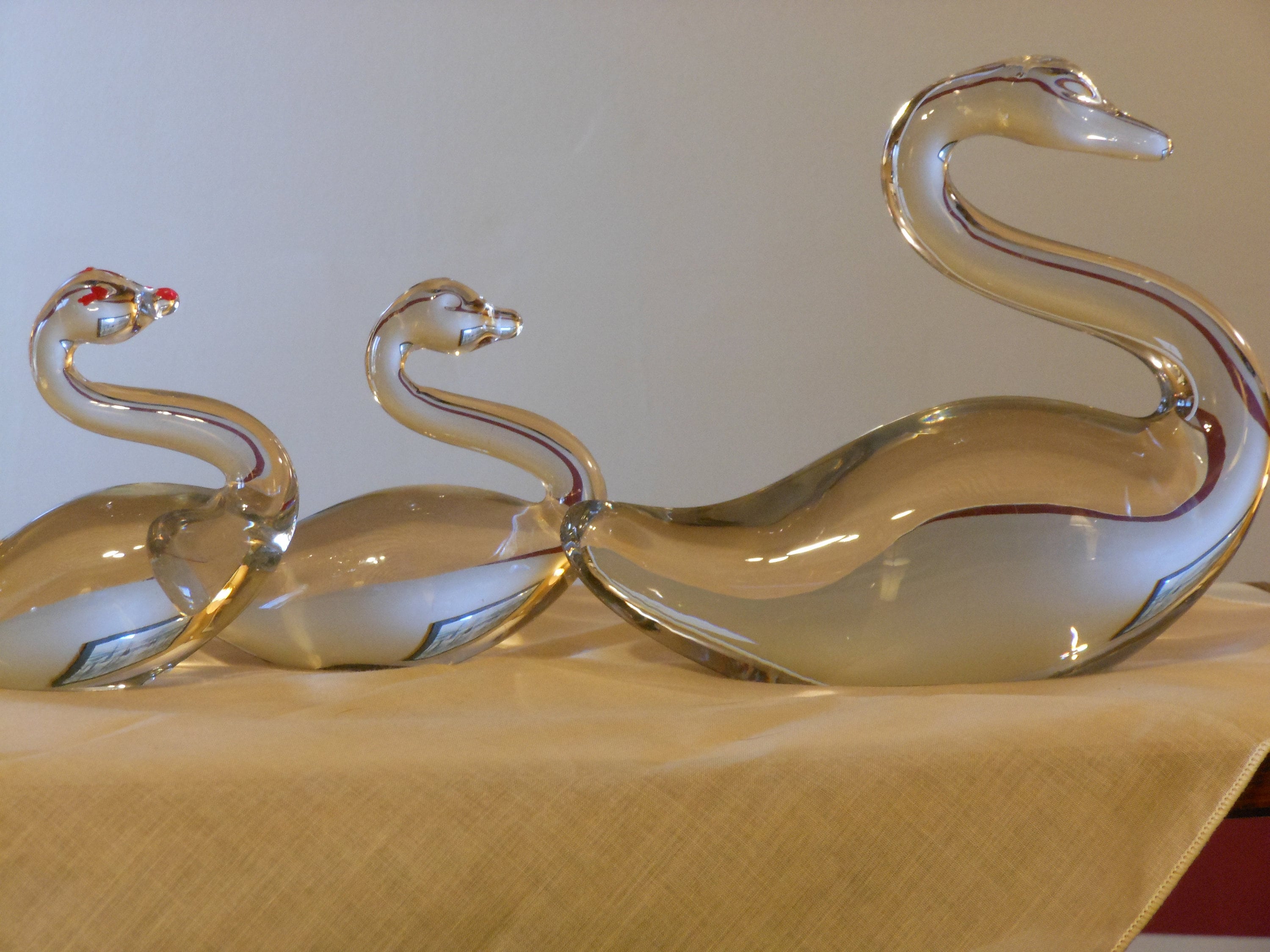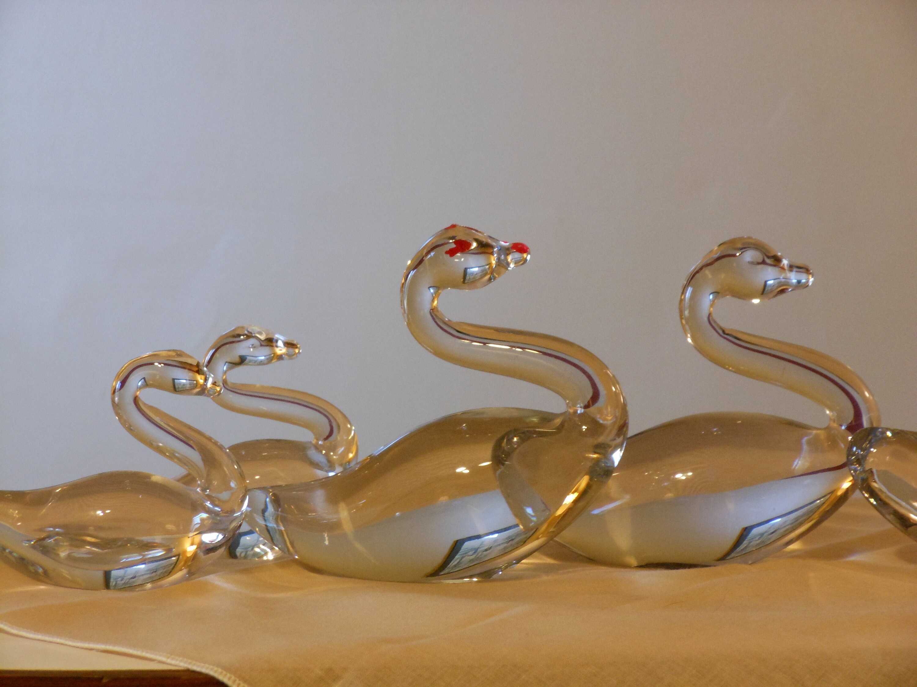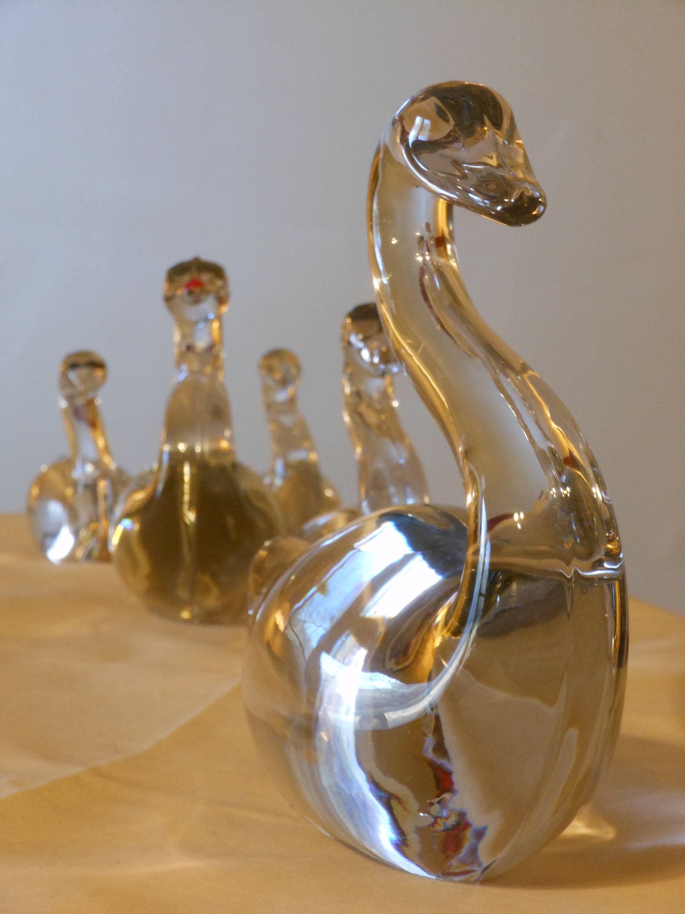 Set of five solid glass swans: one large, two medium, two small. Excellent condition, no chips, cracks or scratches. Large swan is 6.5 inches high, 7 inches wide and weighs 2 pounds, 6 ounces. Medium swans are 4 inches tall, 4.5 inches wide and weigh 11 ounces each. The small swans are 3 inches high, 3 inches wide and weigh 4 ounces each. Combined weight of the set is 4 pounds, two ounces. Selling as a set of five.