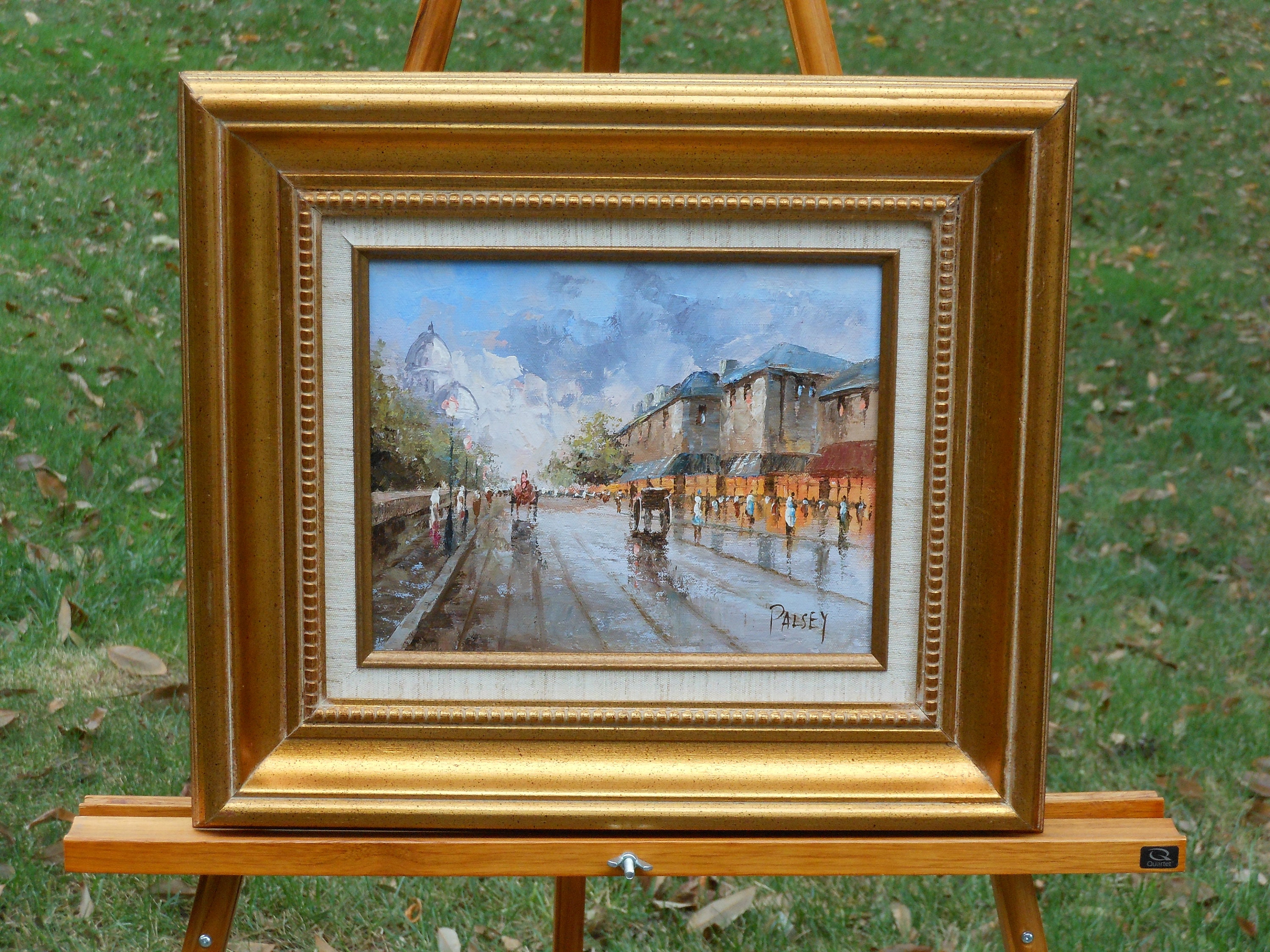Artist signed, Palsey. Measurement of painting is 9.5 inches wide and 7.5 inches tall. Nice wooden gold frame. Beaded frame, fabric and wood surround the painting. Ready to hang. With the frame, this piece measures about 16 inches wide and 14 inches tall. Frame is in very good to excellent condition, a few small punctures on the painting's paper backing. This painting weighs 2 pounds, 11 ounces.