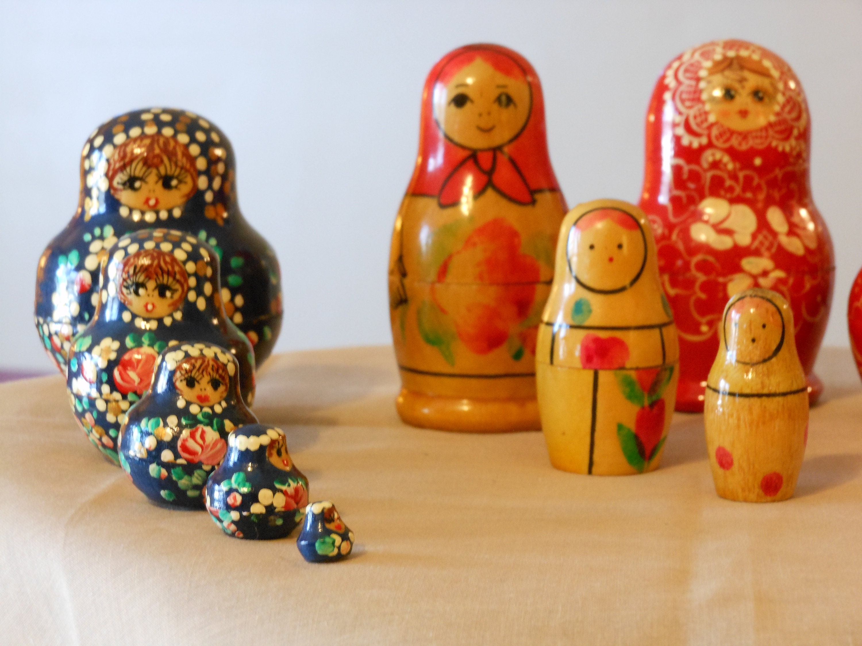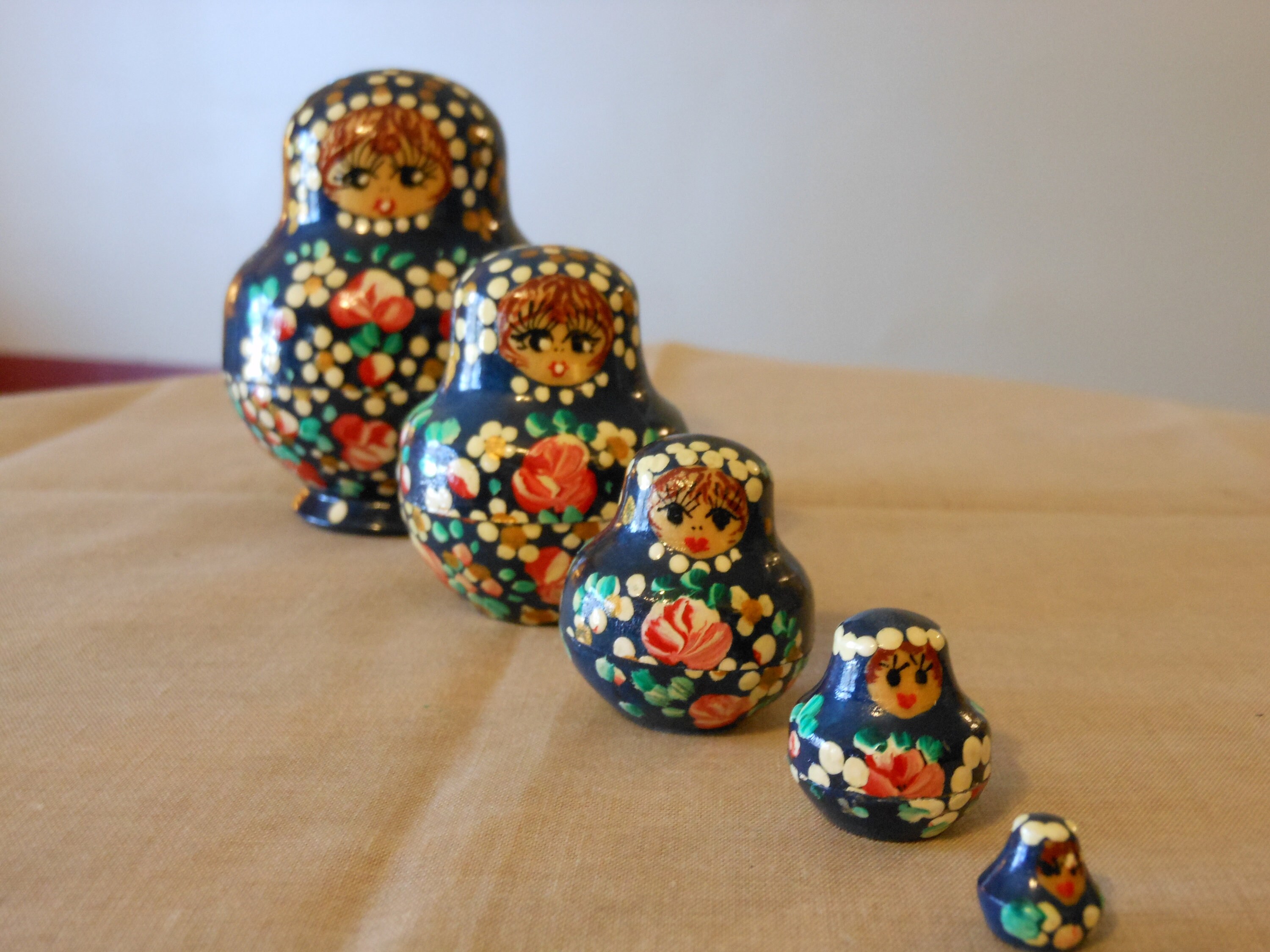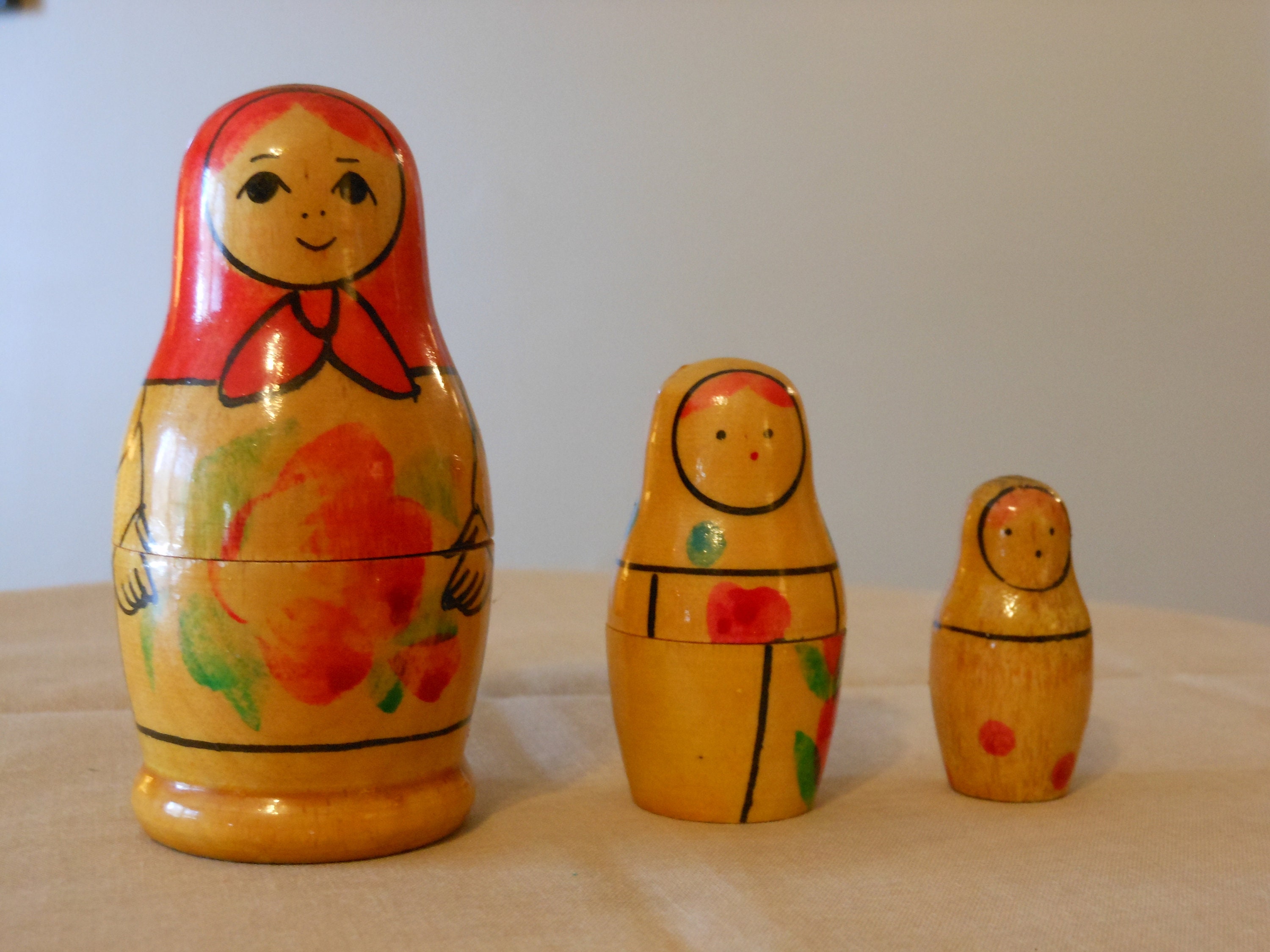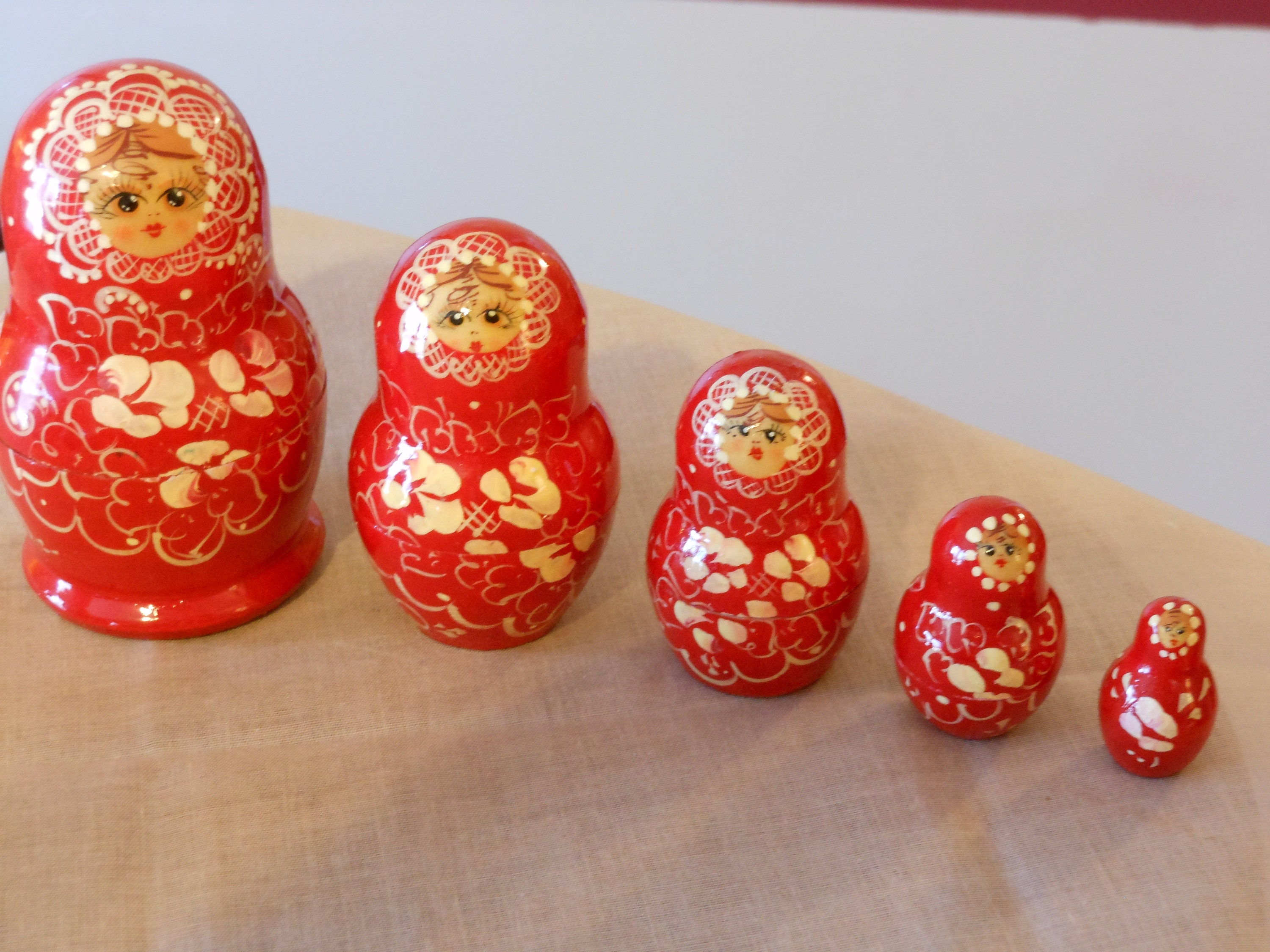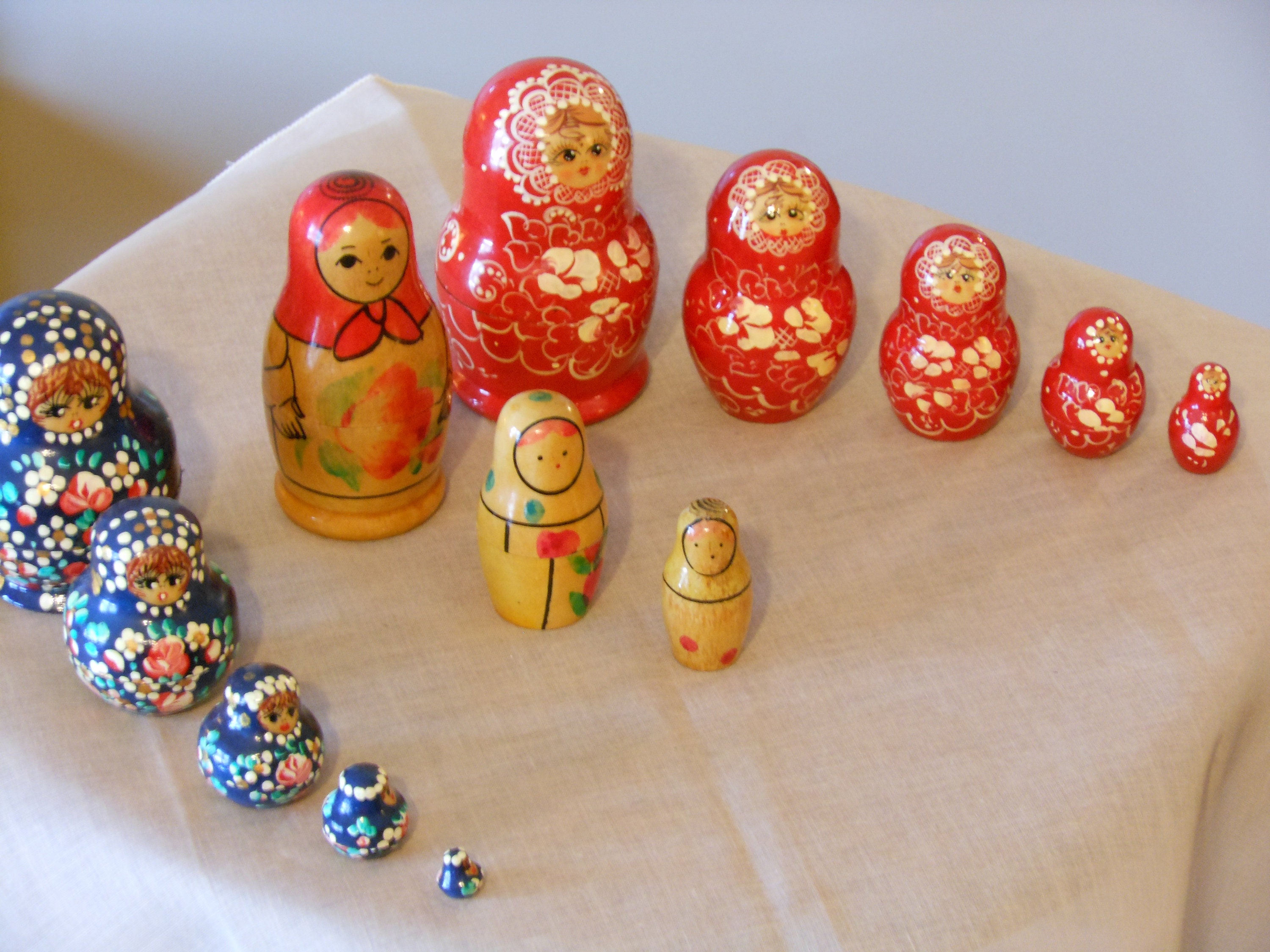Three sets of nesting dolls: two sets of five and one set of three. Excellent condition. These stand 3-3.5 inches high. Colorful, charming and rustic. Combined weight of all three sets is 4 ounces.