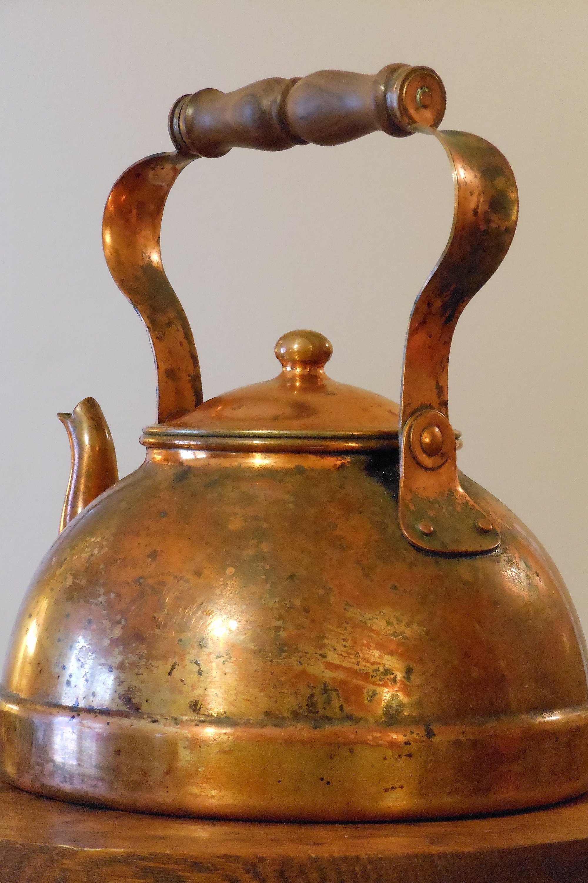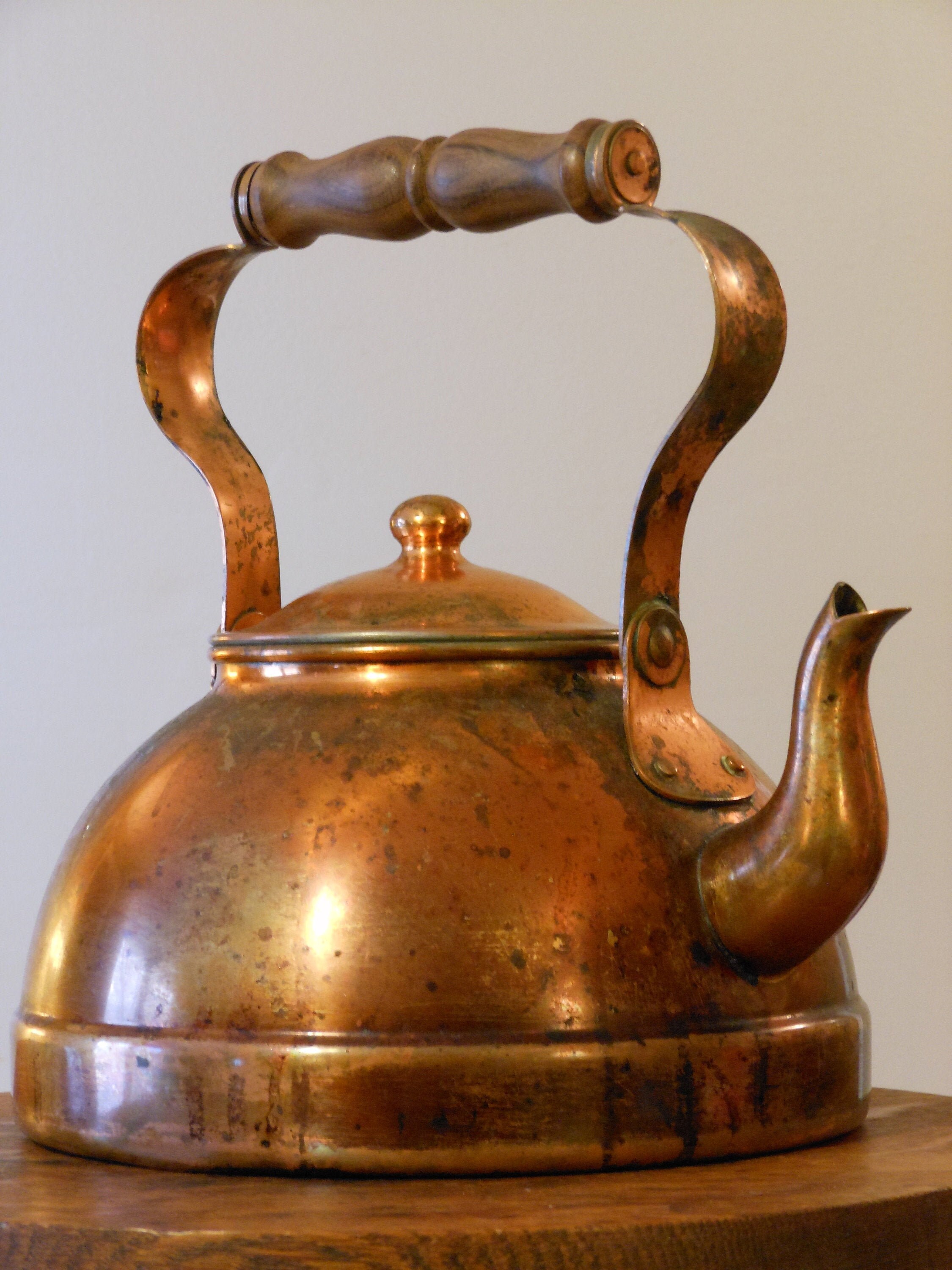 Tagus 8-cup copper tea pot or coffee kettle. Made in Portugal. Wooden handle. Model # R52. Copper lid. Handle bends forward or backward. With handle, measures about 9 inches high and measures about 9 inches wide. No dents. This weighs 1 pound, 11 ounces.
