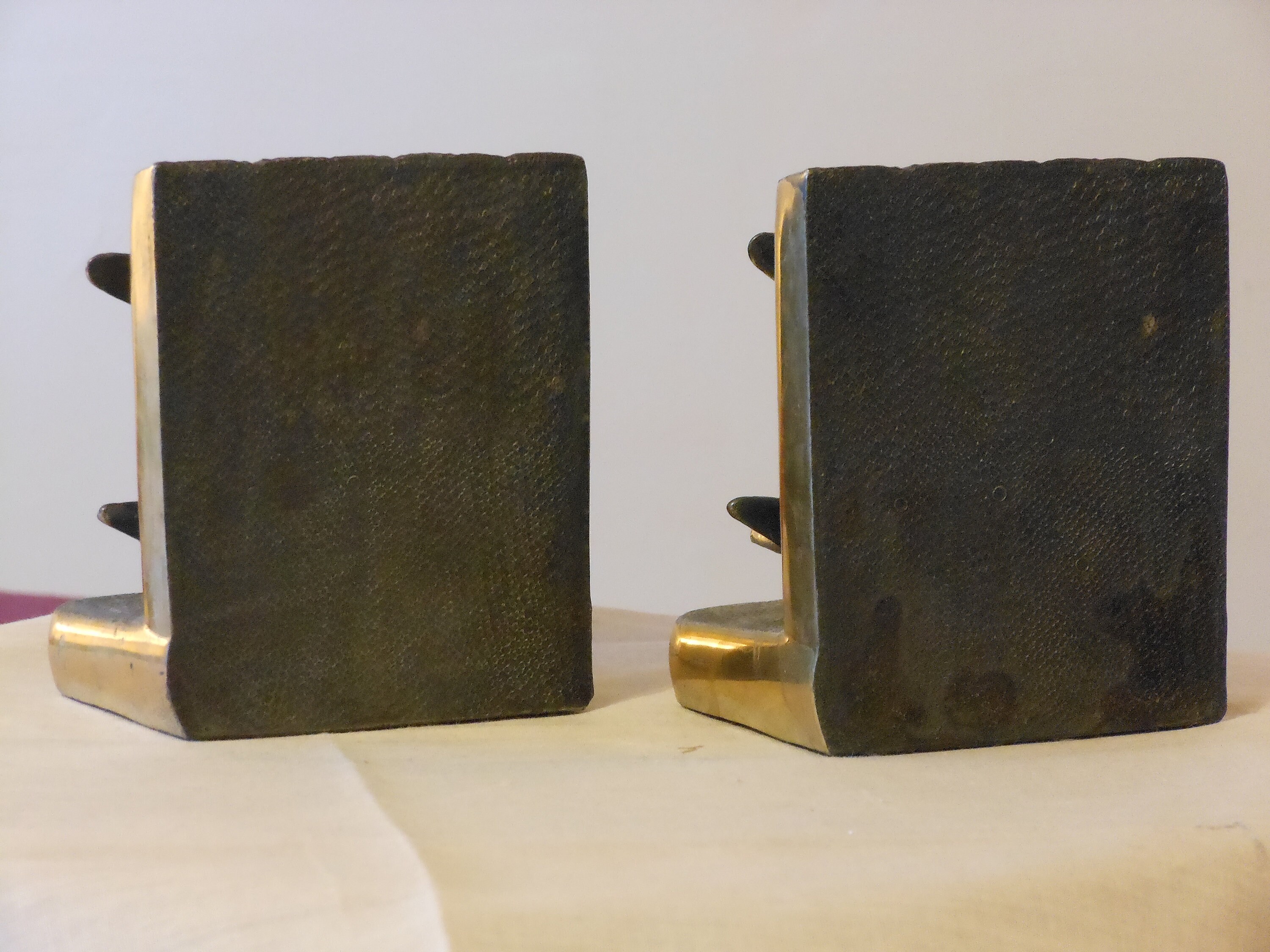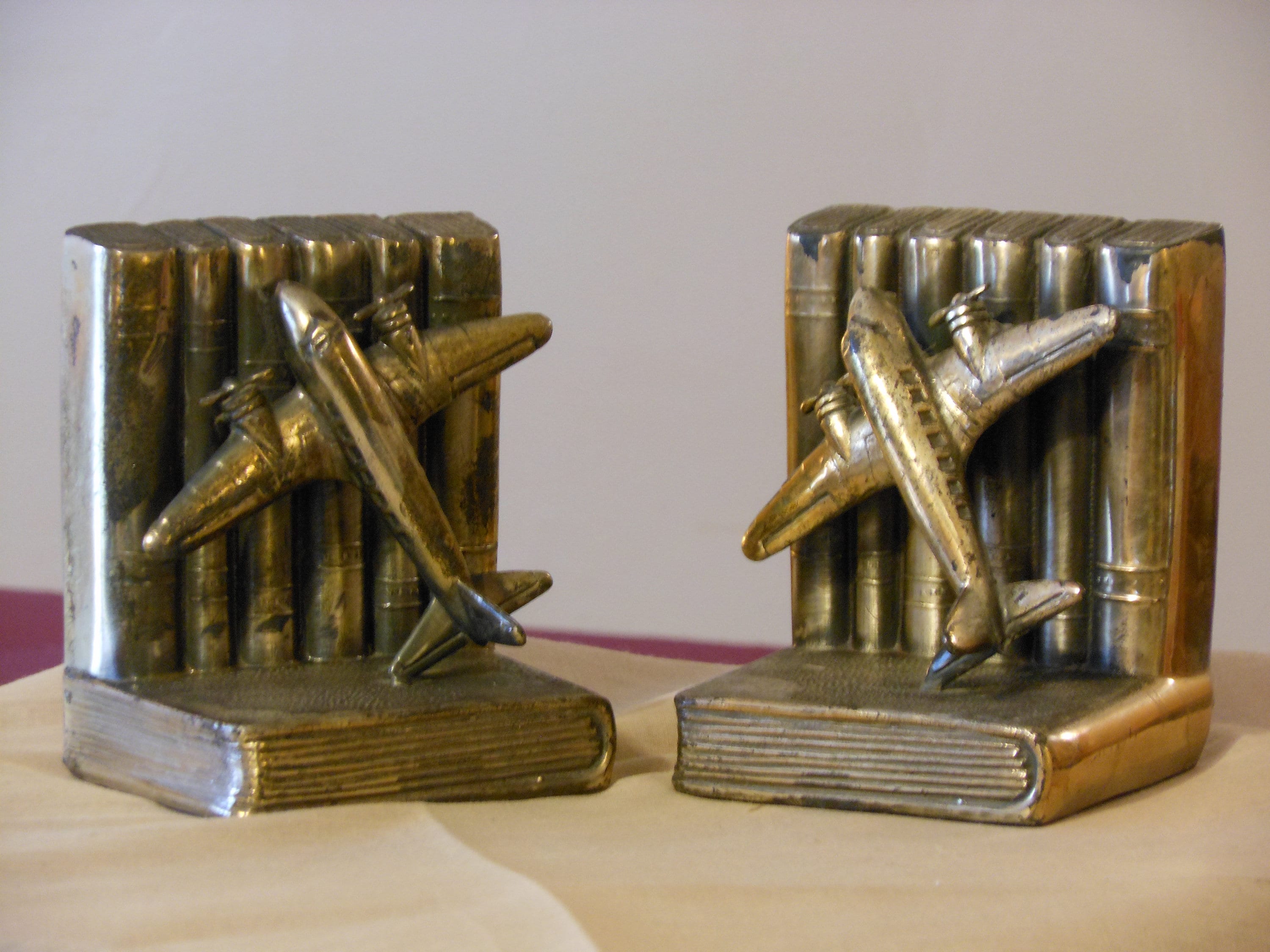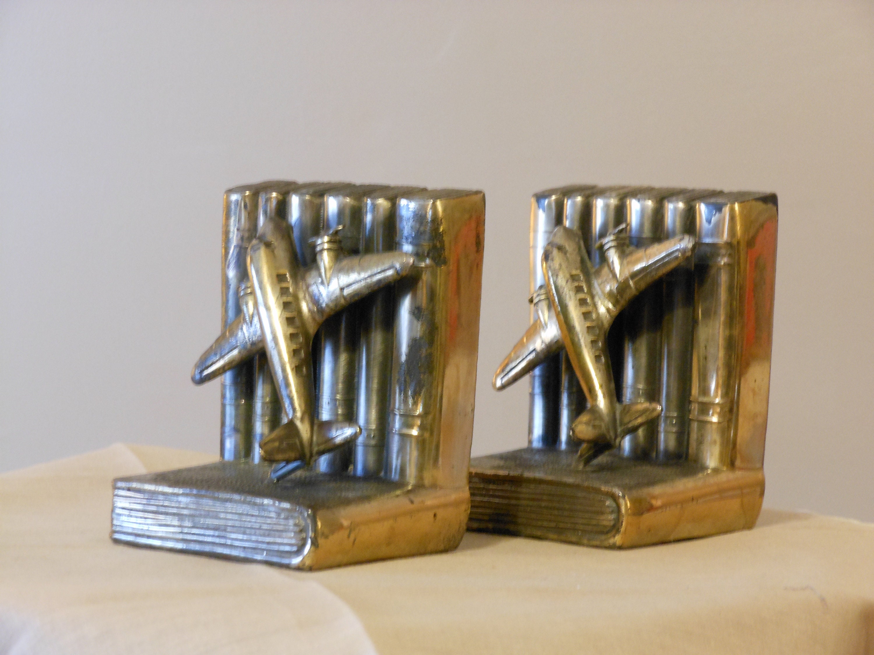 Vintage, probably 1950-era brass-covered mold unique airplane bookends. Airplane perched on volumes of books. Good vintage condition. Amount of wear appropriate to age. Bookends stand 4 inches high, about 3.5 inches wide and 2.5 inches deep. Bottoms are covered in green felt. My research did not discover another pair exactly like them. These bookends have a combined weight of 3 pounds, 7 ounces. Great for a den, office, workshop, study, etc.