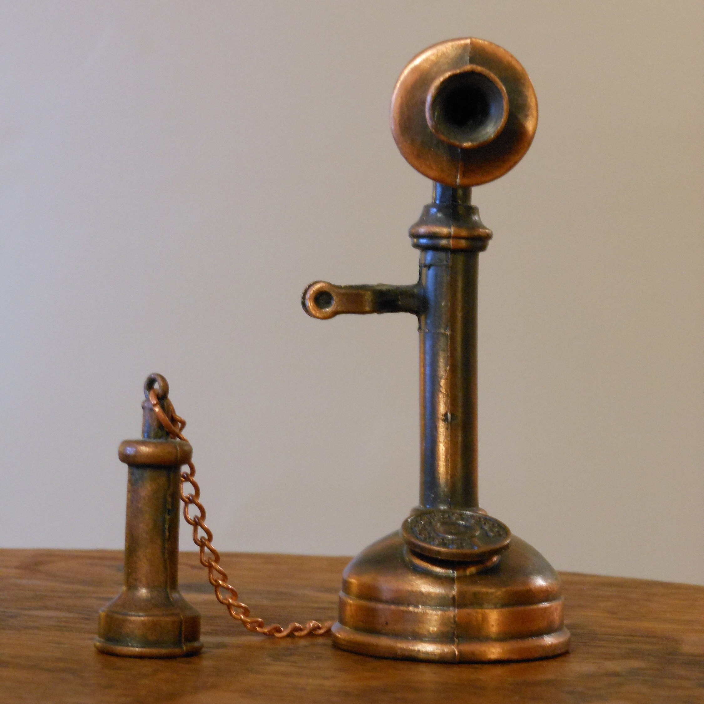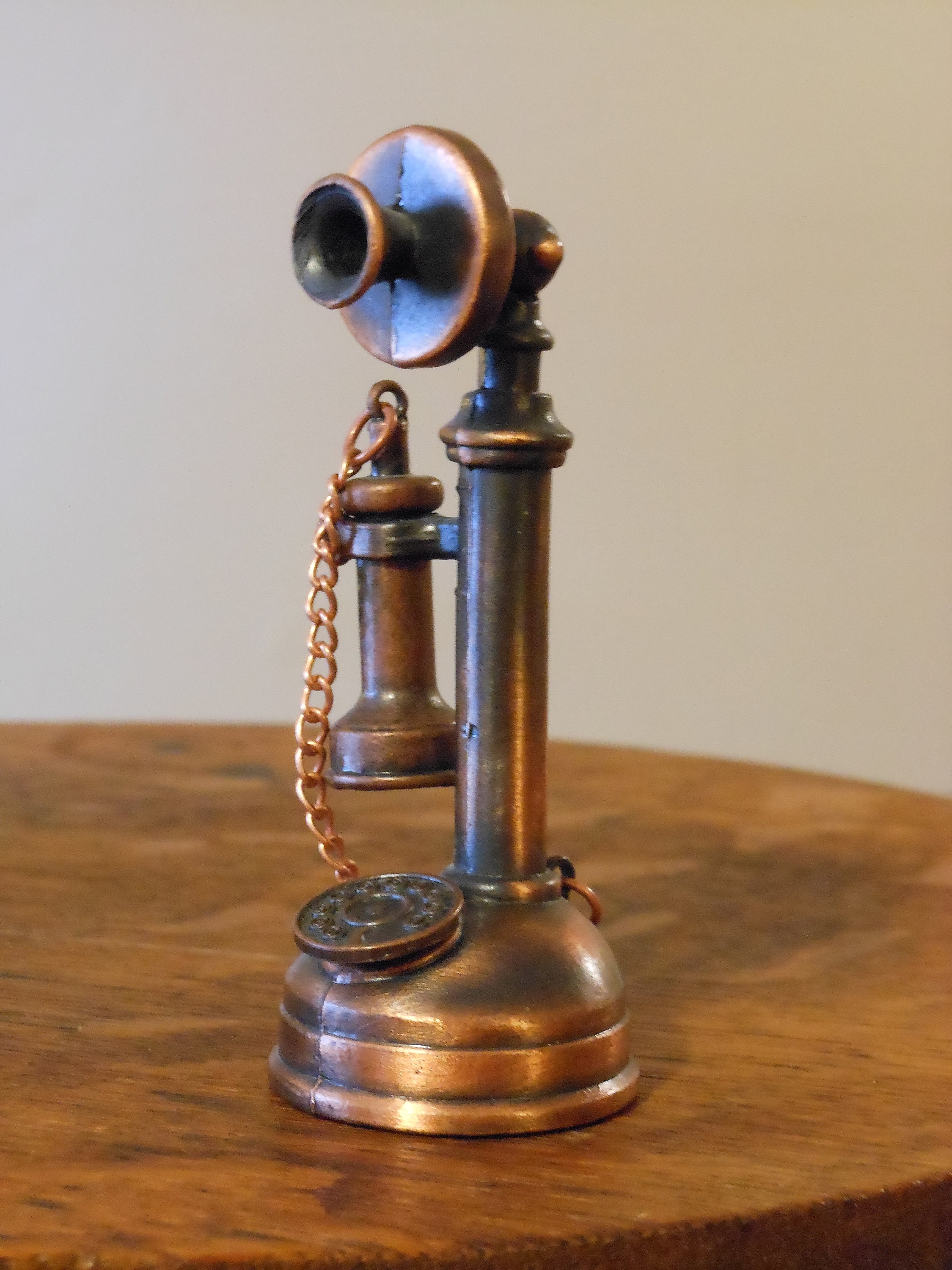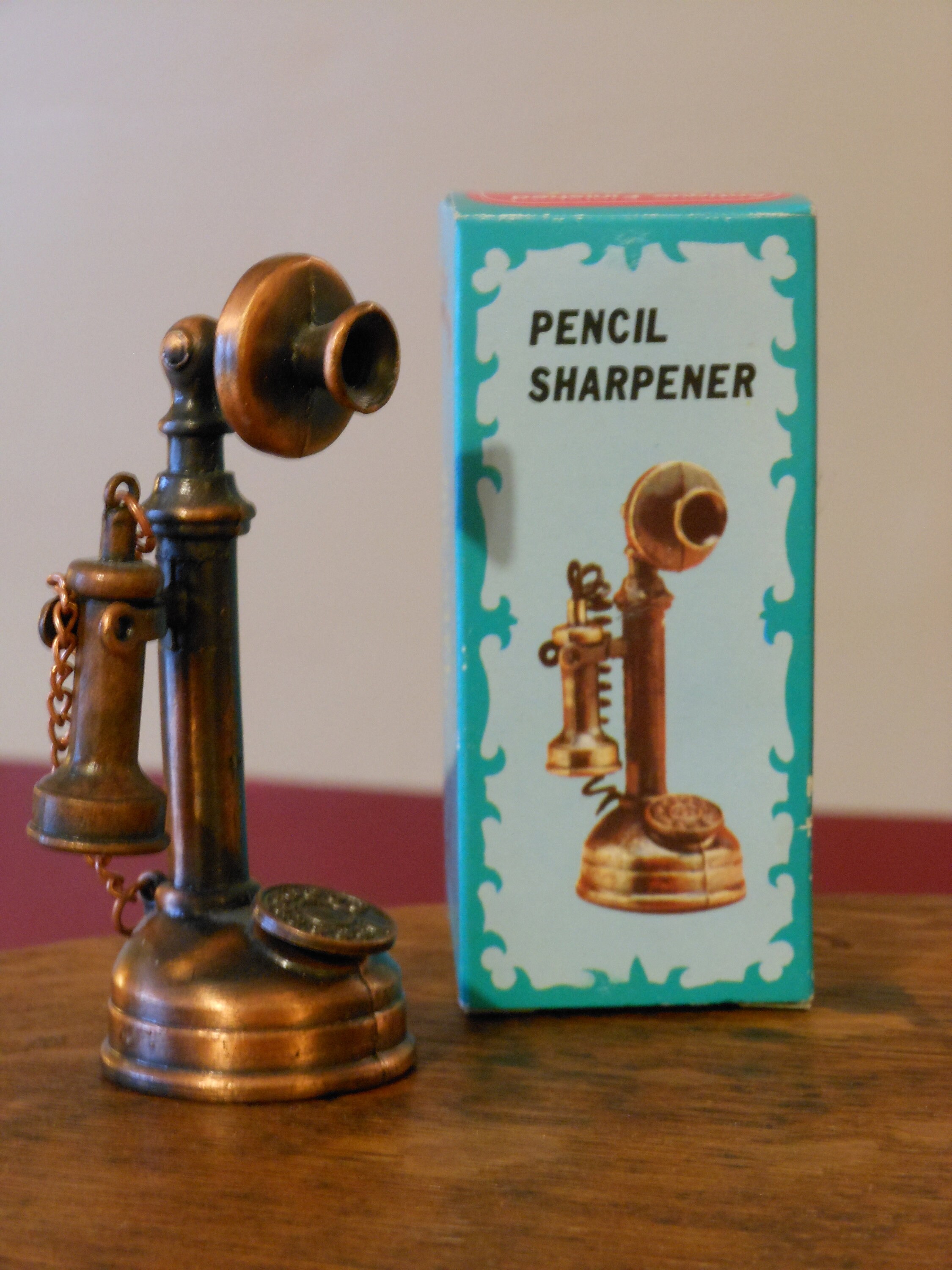 New in box. Die cast metal antique finished old-fashioned telephone pencil sharpener. Stands about 3.5 inches tall. Made in China. With box, this item weighs 2 ounces.