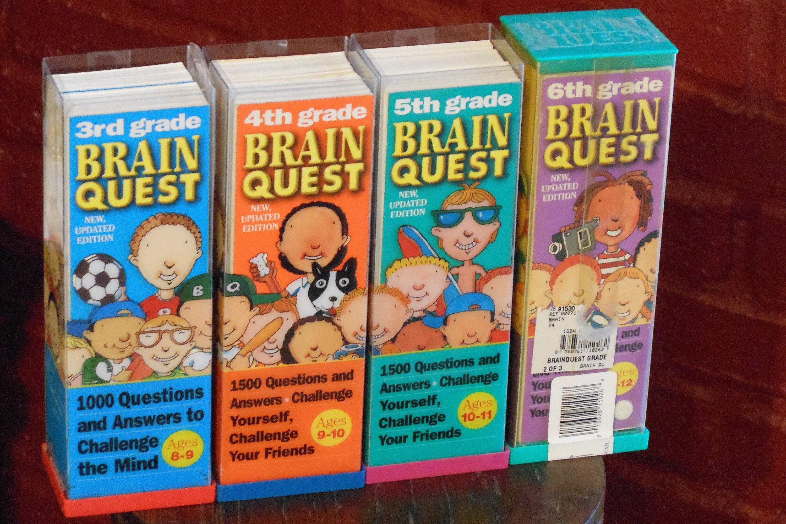 Brain Quest, learning and study cards. New, updated edition. 1992. Grades 3-6. Clear plastic containers, two decks per container. Published by Workman. Containers are 8 inches tall, 2.5 inches wide and 2 inches deep. Each box has 1500 questions. Each container weighs 15 ounces. Combined total weight is 3 pounds, 7 ounces. Only one has top container lid.