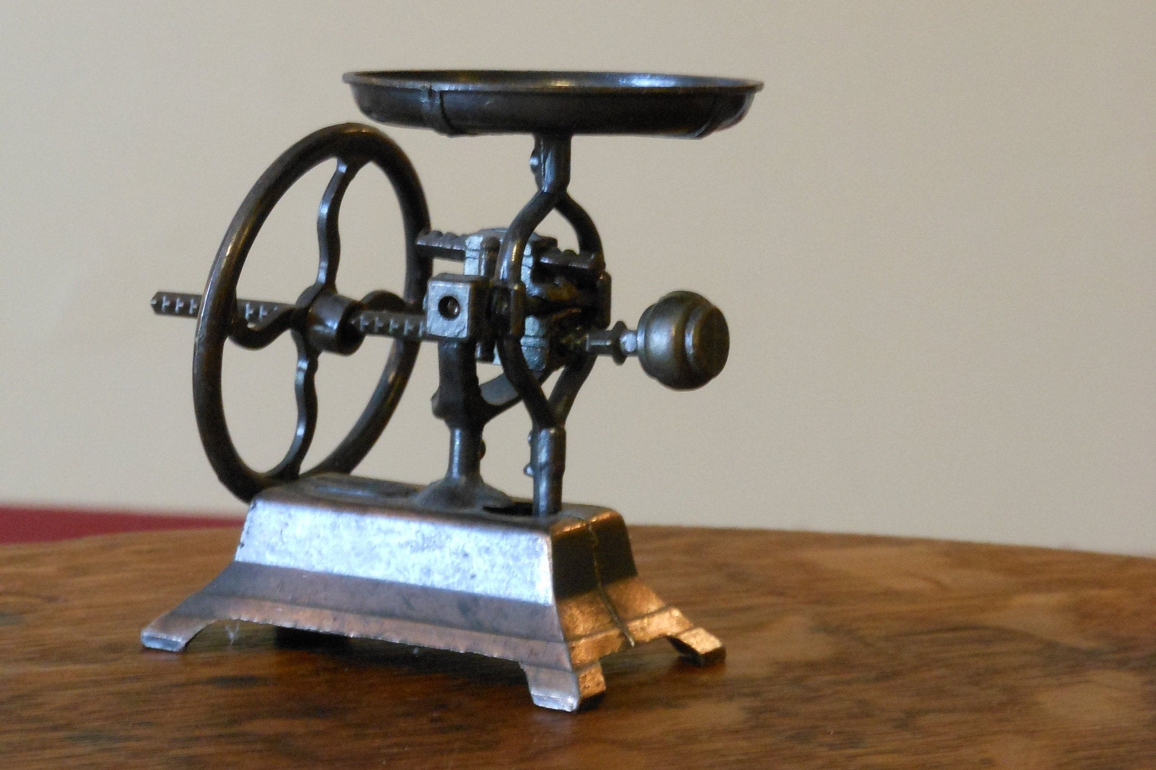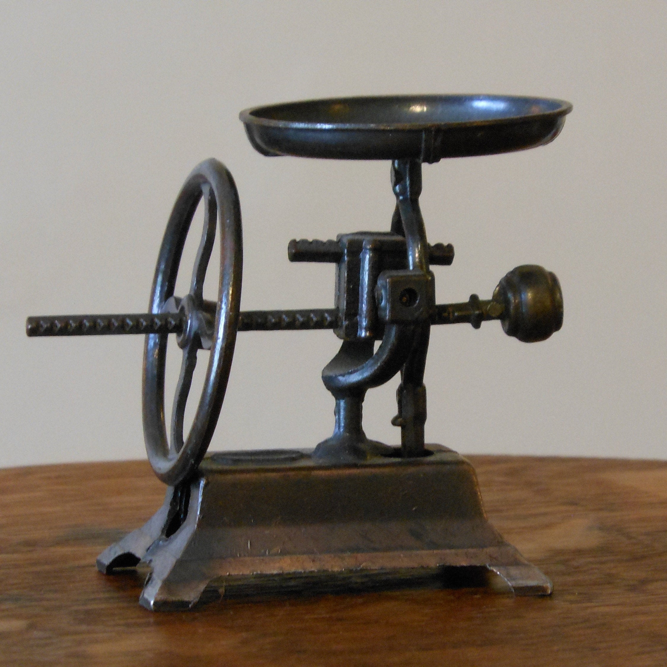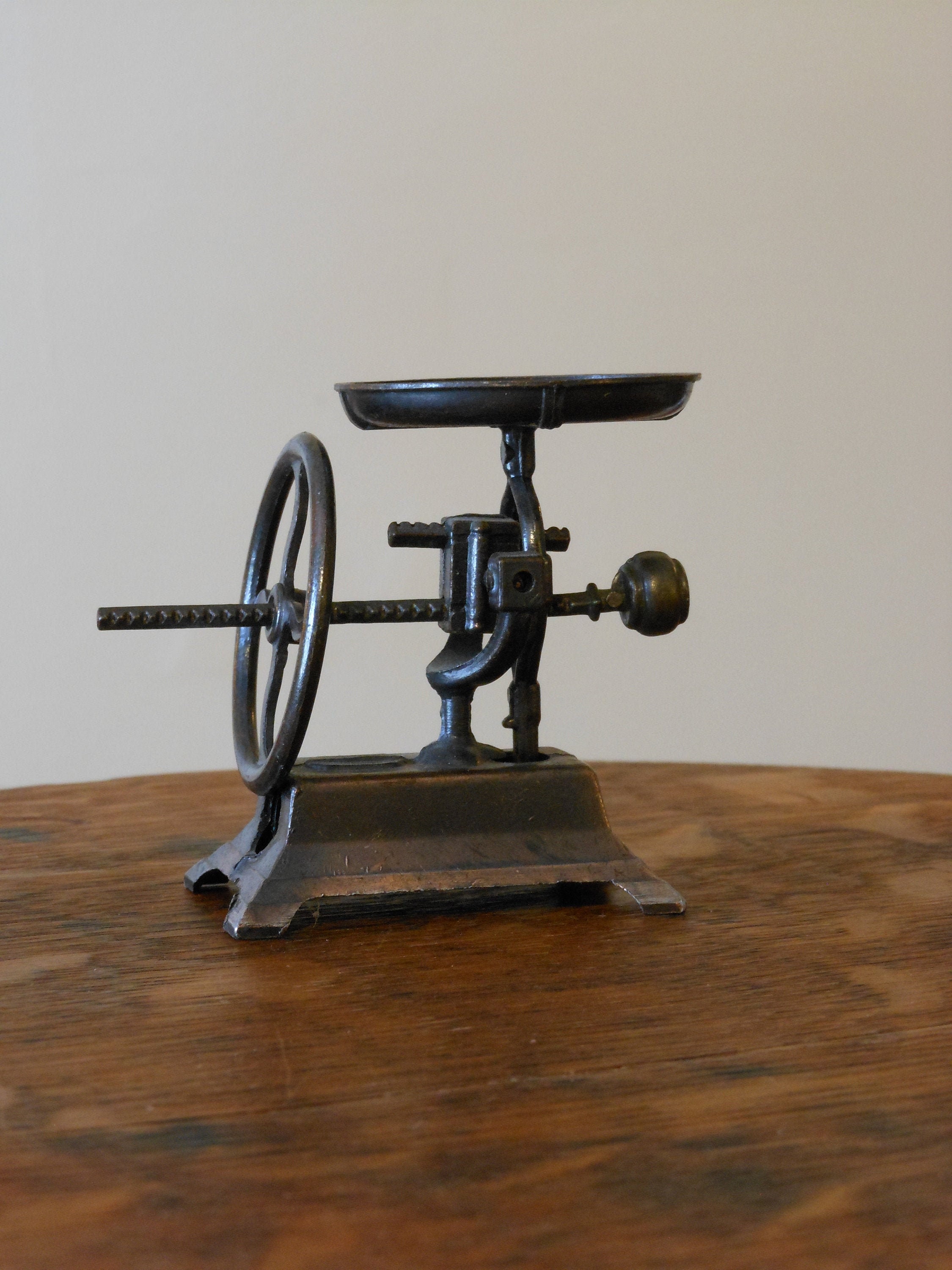 Bronze, antique finish vintage adjustable scale pencil sharpener. Height is about 2.5 inches and width is about 3 inches. Made in Hong Kong of die cast metal. No box. Two pieces, scale and wheel. Wheel moves along the rod on the scale. Rod pivots. As scale is pressed down, rod rises on scale. This item weighs 2 ounces.